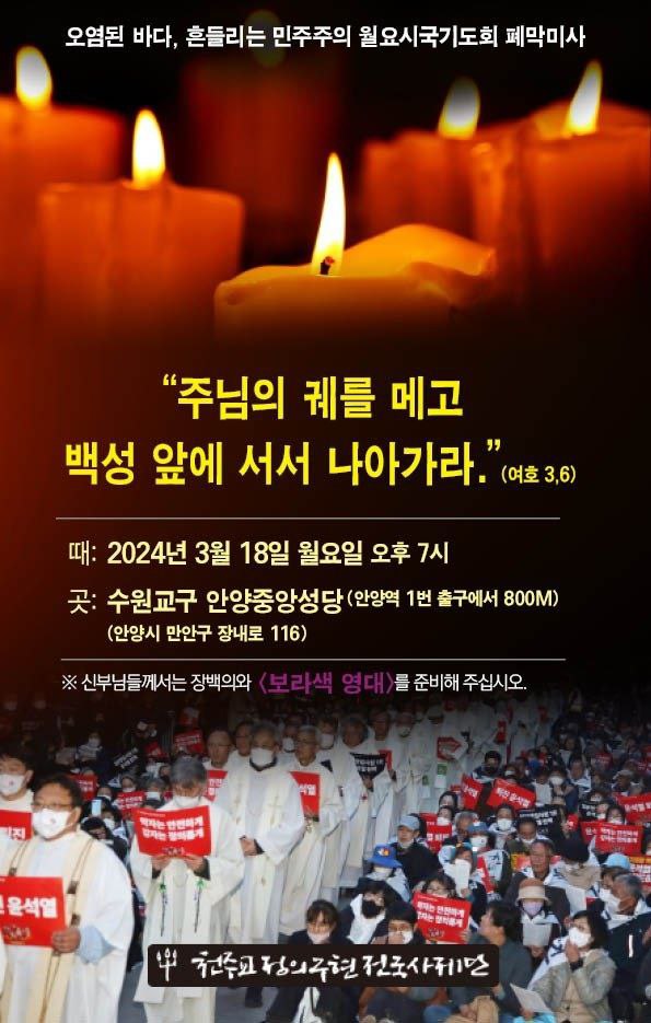2024.03.18/ #시국기도회 #안양 #중앙성당/ 오염된바다. 흔들리는 민주주의 월요시국기도회 페막미사가 정의구현전국사제단 주최로 18일 오후7시 안양 중앙성당(안양 만안구 장내로 116/ 안양 중앙시장 2.3번문 앞)에서 열린다.