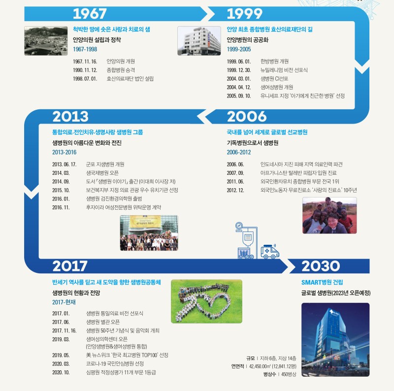 ▲효산의료재단 샘병원은 1967년 의원으로 출발했다. 당시에는 부인인 황영희 박사가 원장을 맡았고 1972년 7월 1일 병원급인 안양병원으로 규모를 키웠다. 당시에는 내과, 일반외과, 소아과, 산부인과 등 4개과로 진료를 시작해 지금은 안양을 대표하는 지역병원으로 자리 잡았다. 현재 샘병원은 안양샘병원, 샘여성병원, 샘한방병원으로 구성돼 있으며 노인재활센터(안양시 위탁), 만안구 노인보건센터(만안구 위탁) 등도 운용하고 있다. 총 620병상이다.
