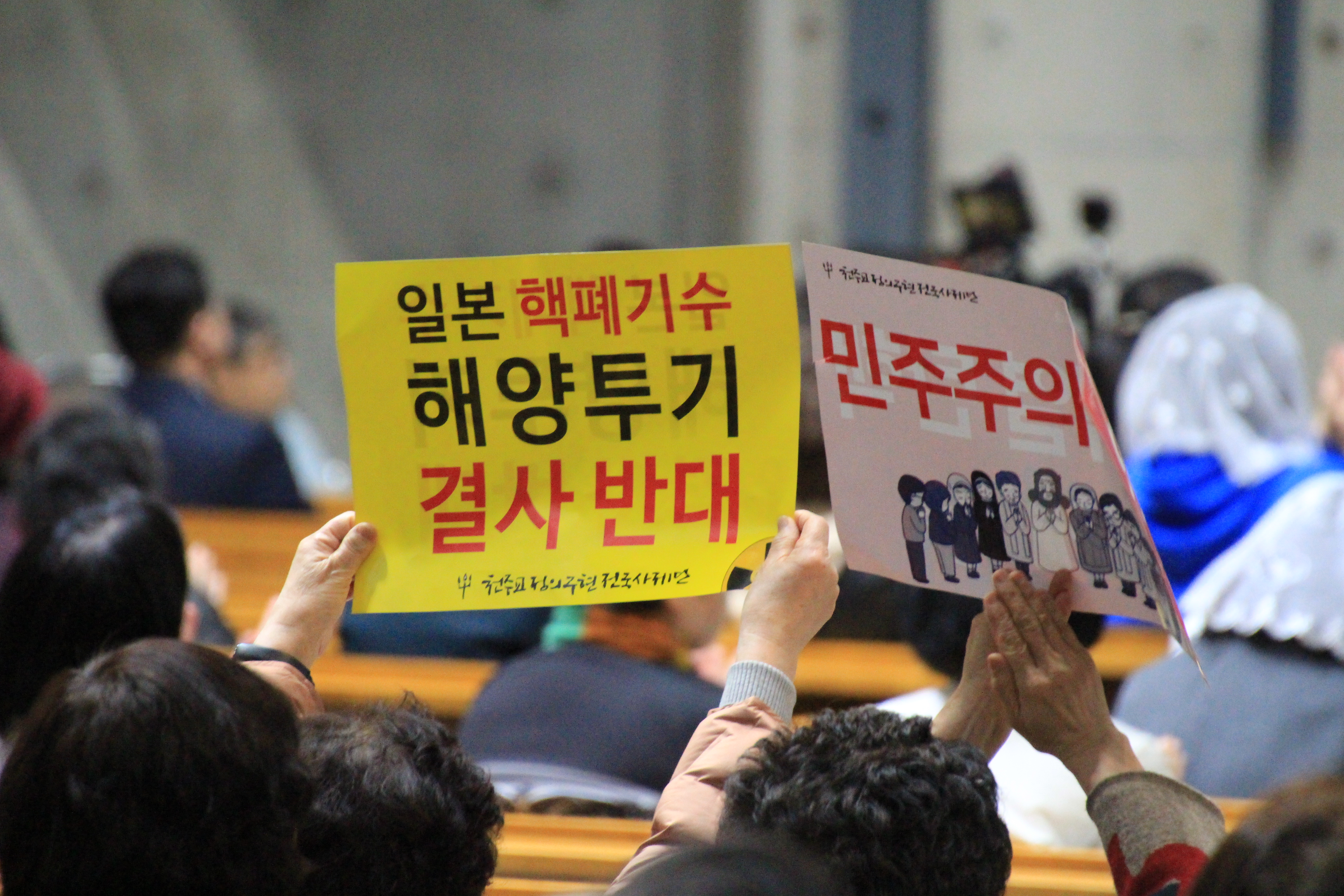 그리고 10월부터 다시 부산 정발장군공원에서 시작하여 서울/ 전주/ 수원/ 의정부/ 마산/ 인천/ 광주/ 전주/ 그리고 오늘 수원교구 안양 중앙성당에 이르기까지 총 10회에 걸쳐 진행된 <오염된 바다, 흔들리는 민주주의 월요시국기도회>를 오늘 마치게 되었습니다.