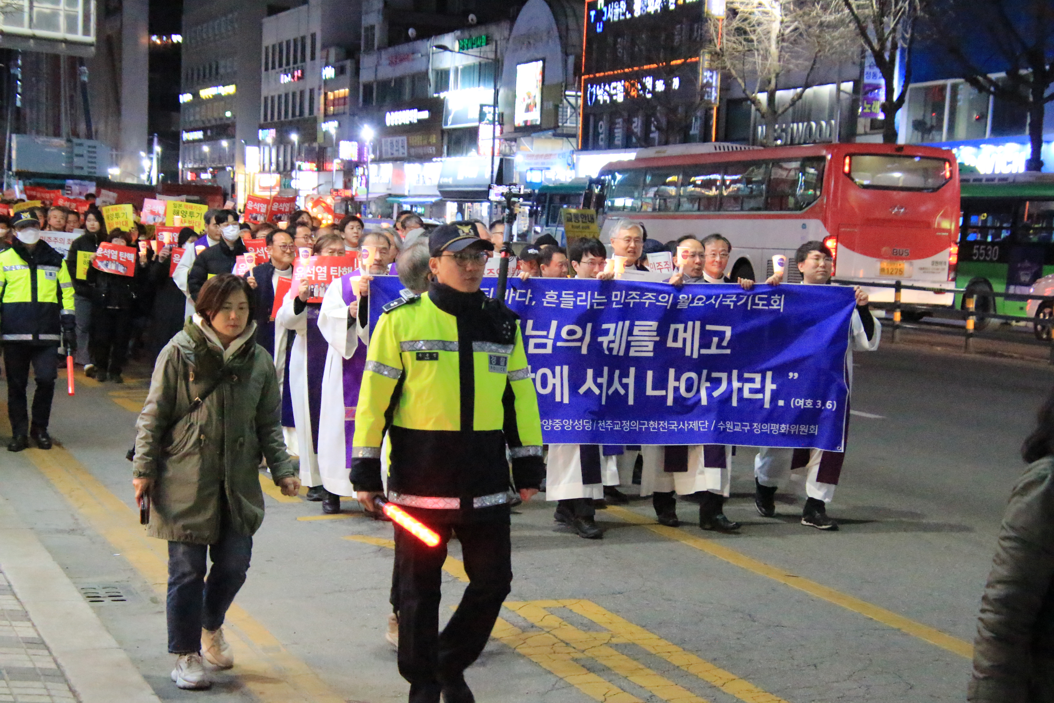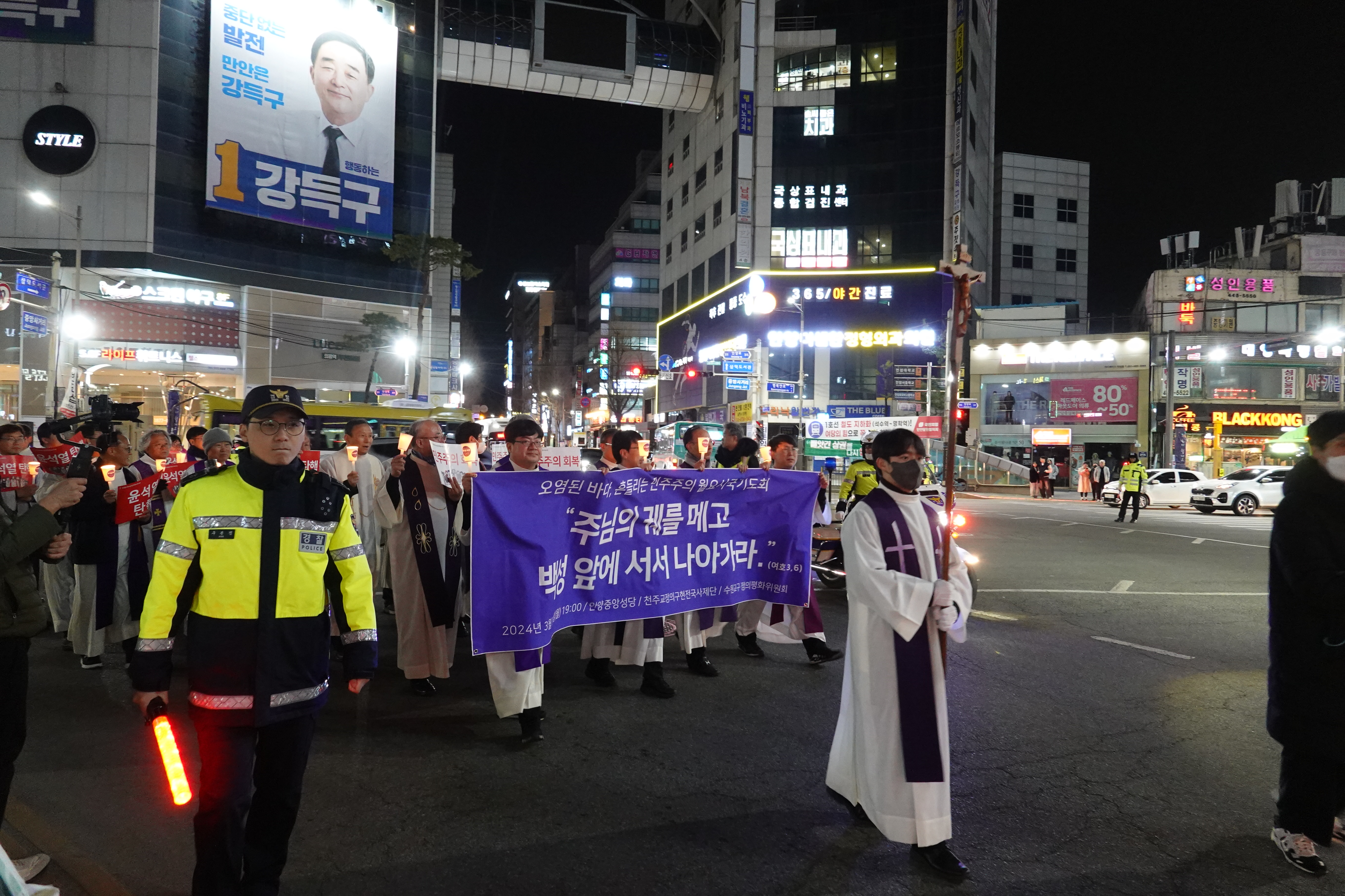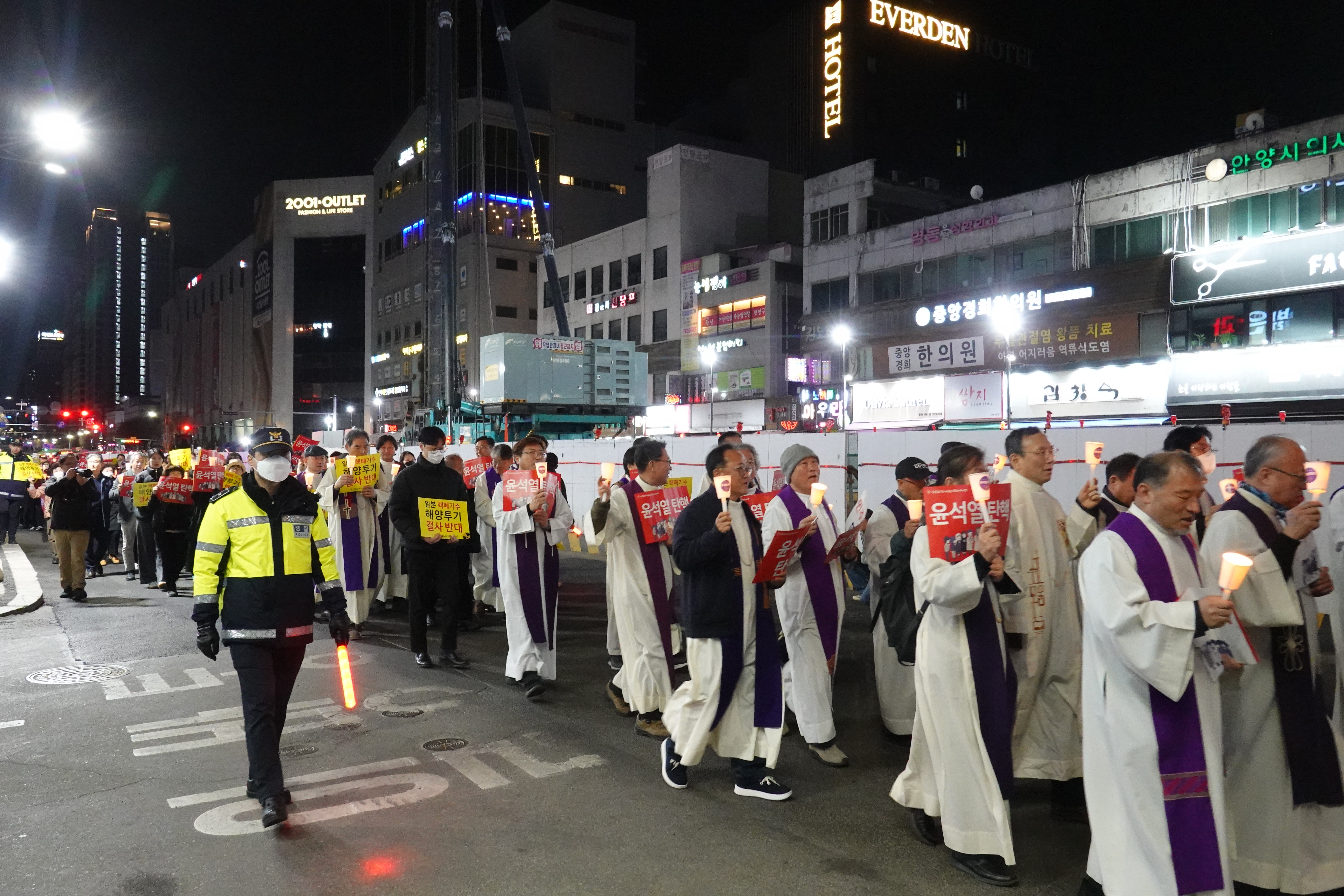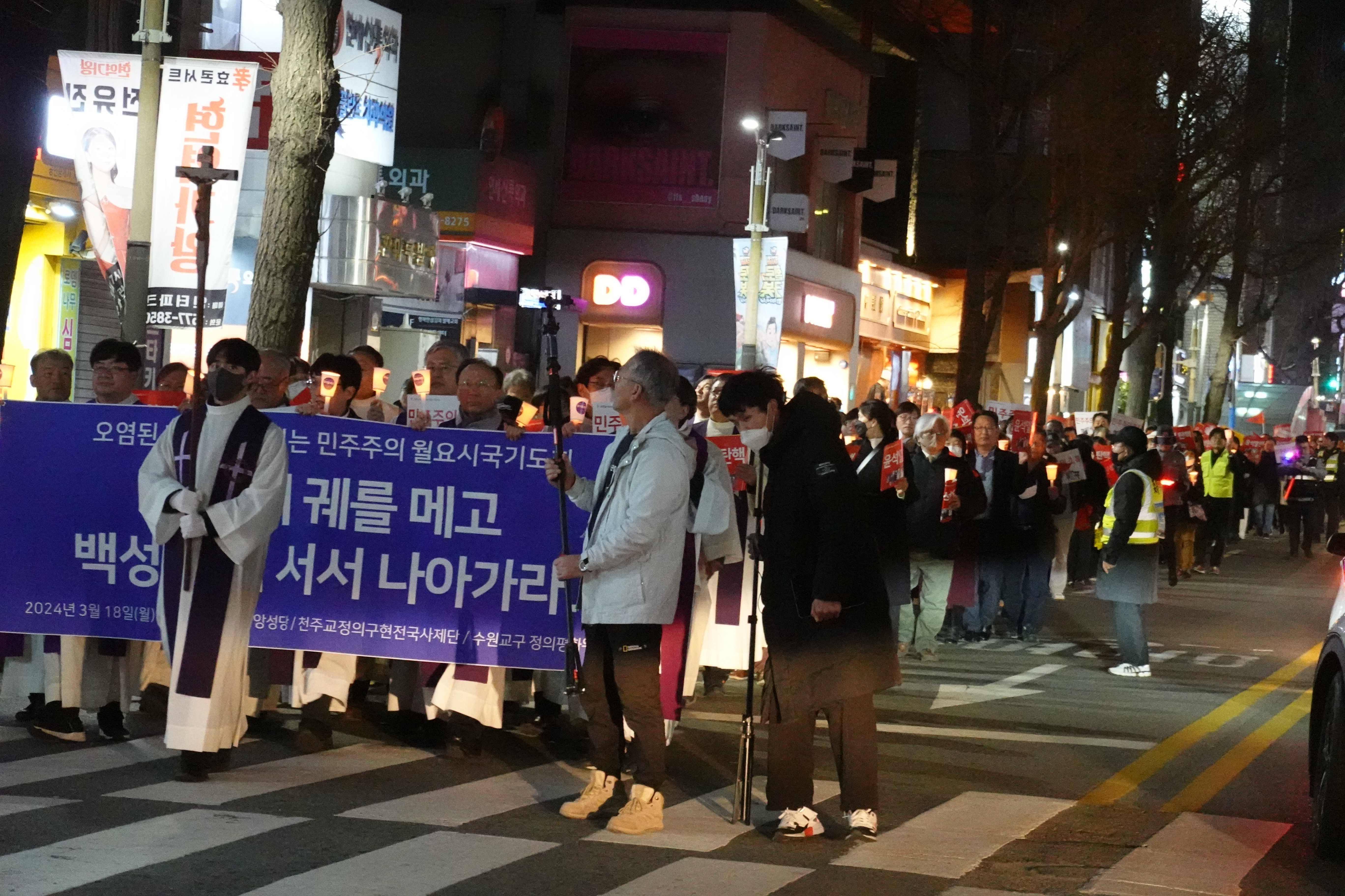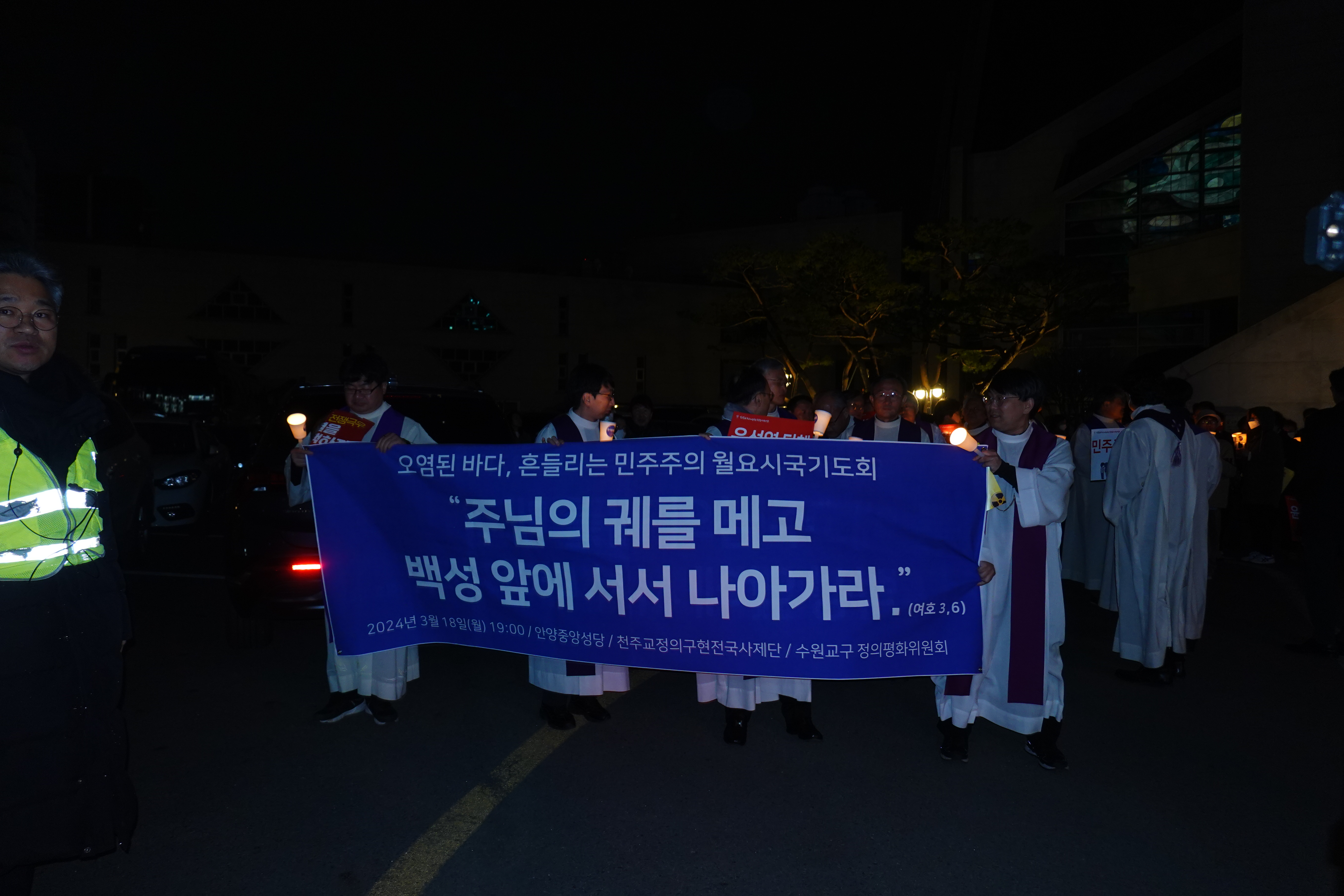 미사를 마친 사제단은 십자가를 앞세우고 시민들과 함께 안양중앙성당에서 안양역까지 행진하며 “집권당은 국민 앞에 석고대죄하고 윤석열을 탄핵하라” “윤비어천가 필요없다 언론을 개혁하라” “거짓평화 선동말고, 말만 공정 남발말고, 정의부터 회복하라” “묵은 땅을 갈아엎고 정의를 드높여라” 등의 구호를 외쳤다.