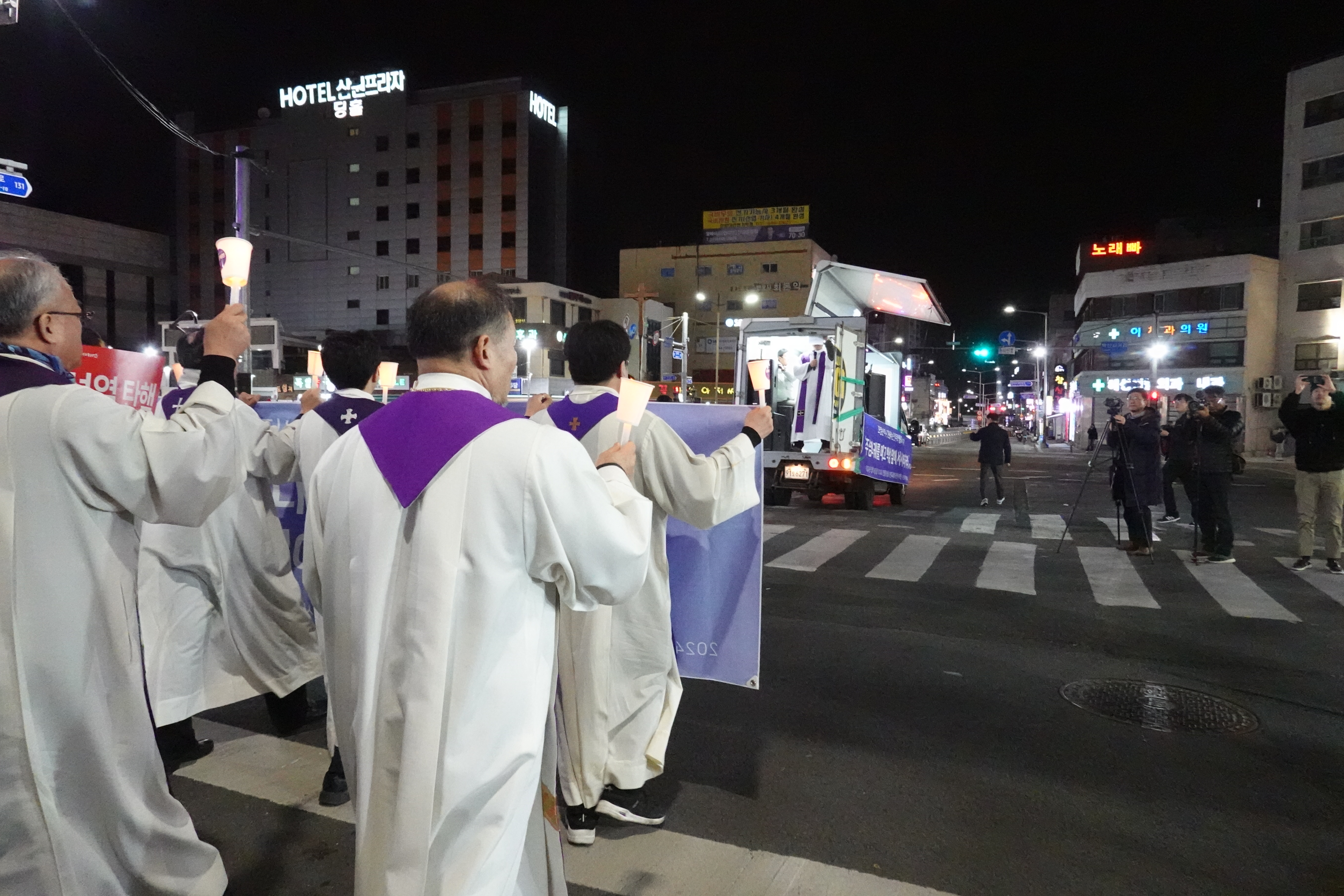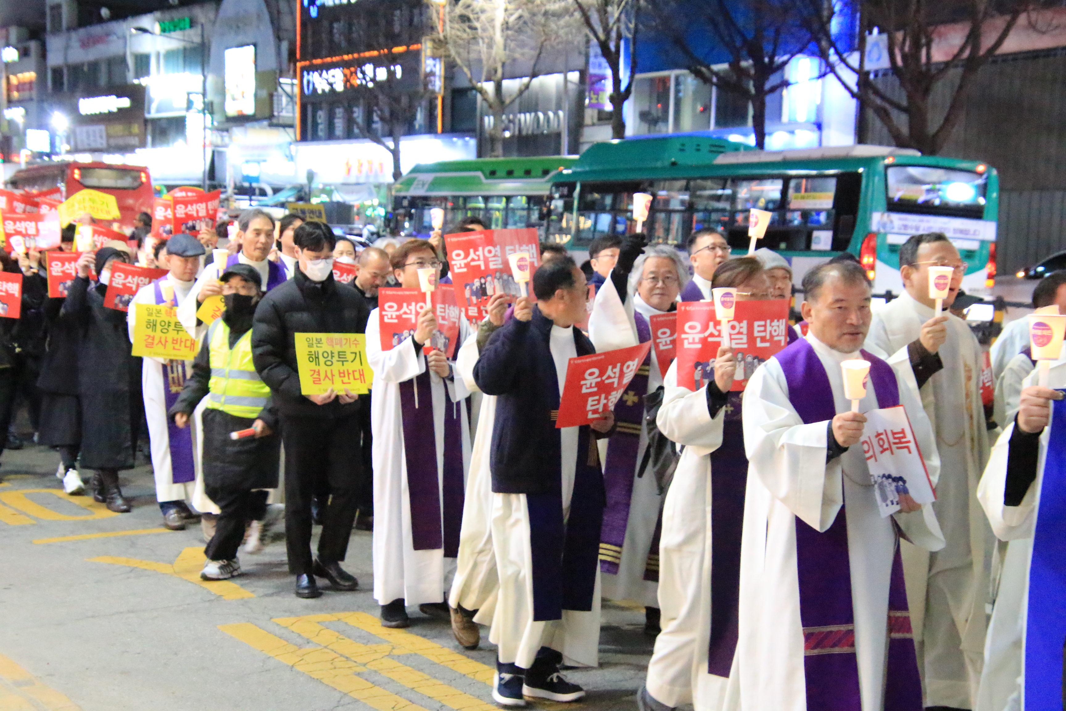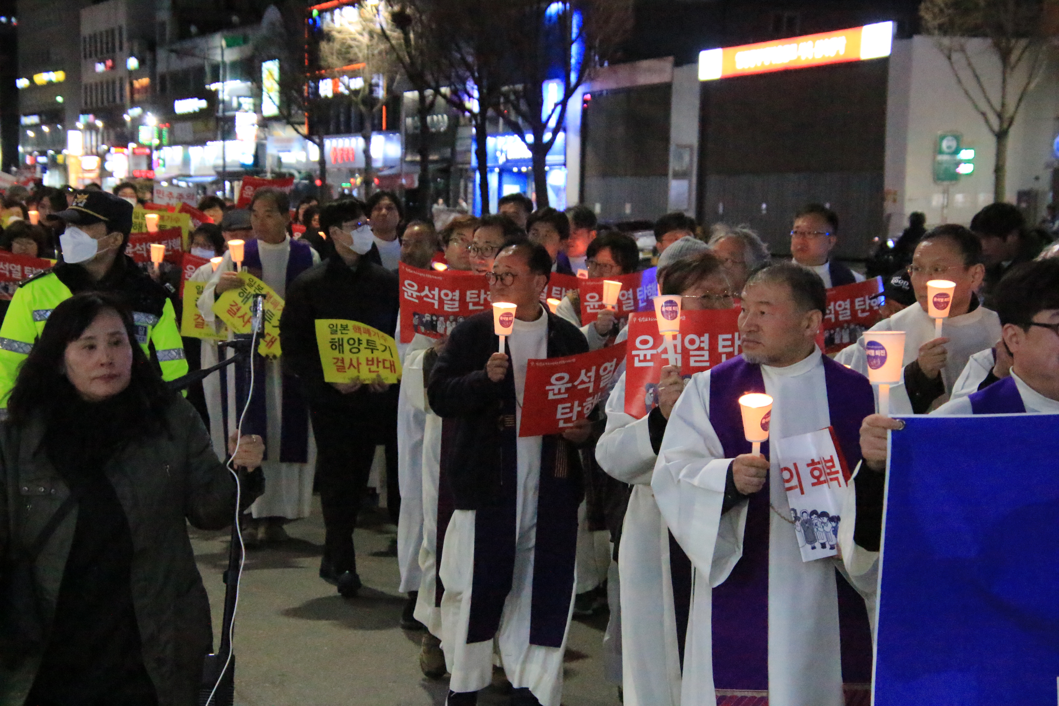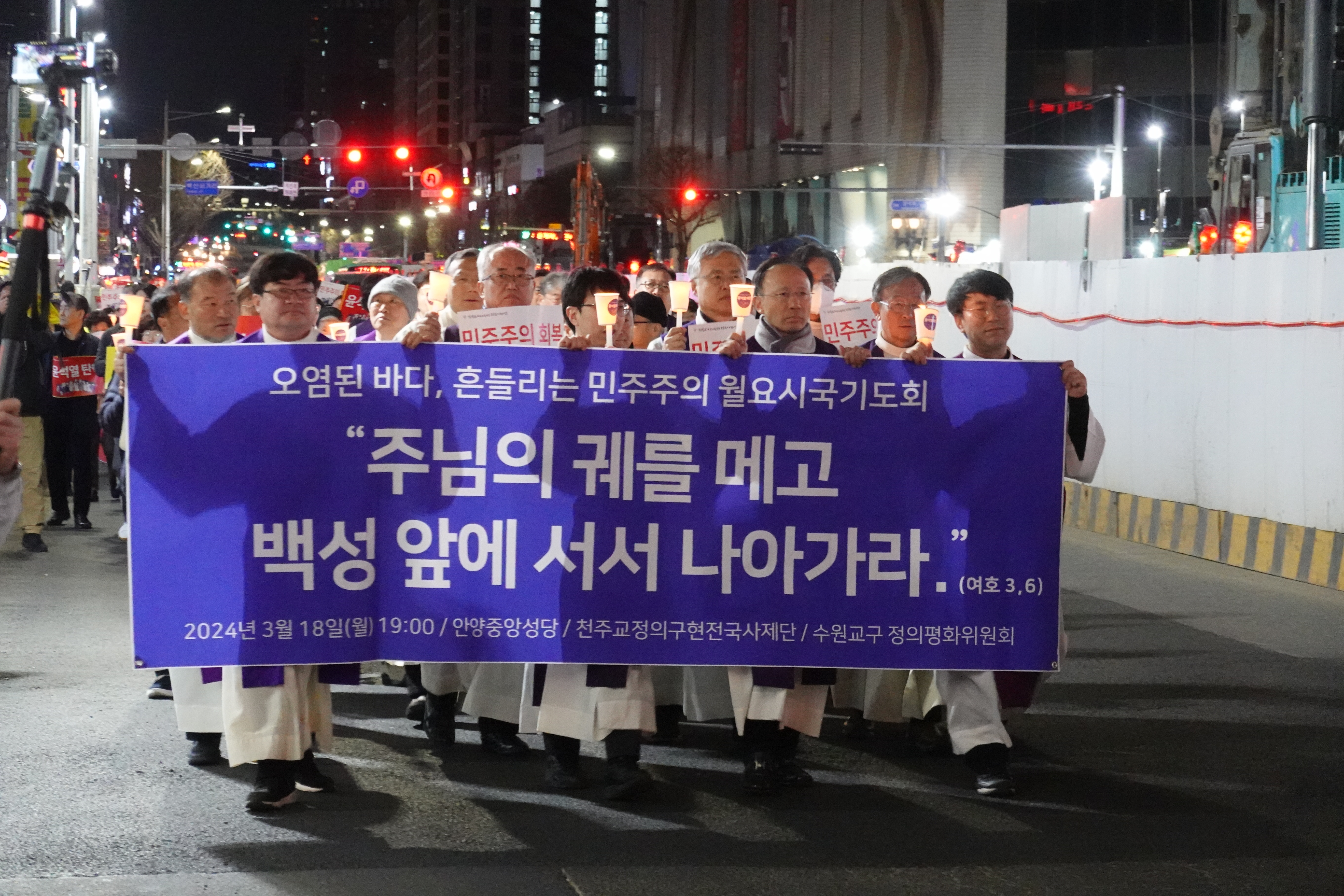 미사를 마친 사제단은 십자가를 앞세우고 시민들과 함께 안양중앙성당에서 안양역까지 행진하며 “집권당은 국민 앞에 석고대죄하고 윤석열을 탄핵하라” “윤비어천가 필요없다 언론을 개혁하라” “거짓평화 선동말고, 말만 공정 남발말고, 정의부터 회복하라” “묵은 땅을 갈아엎고 정의를 드높여라” 등의 구호를 외쳤다.
