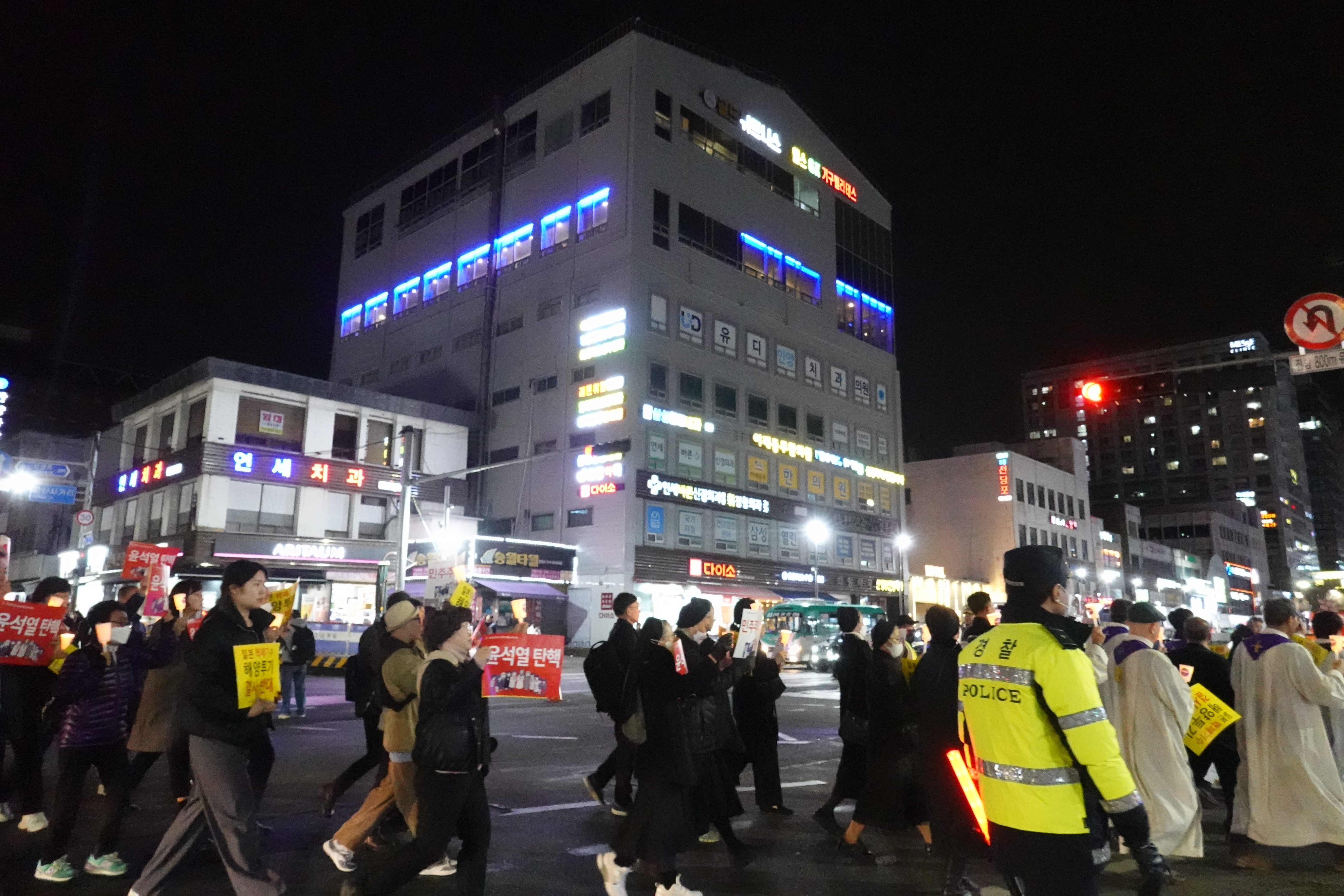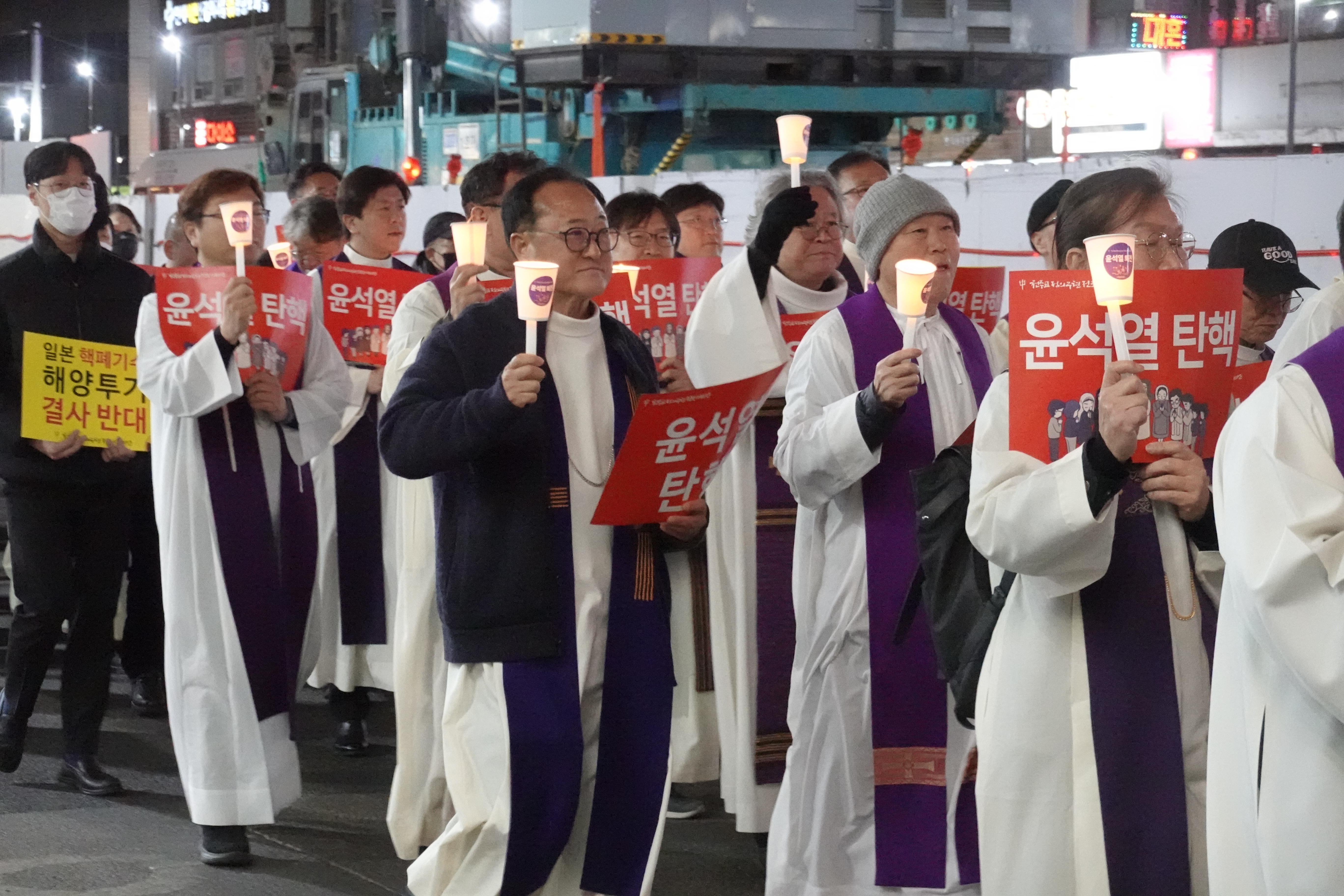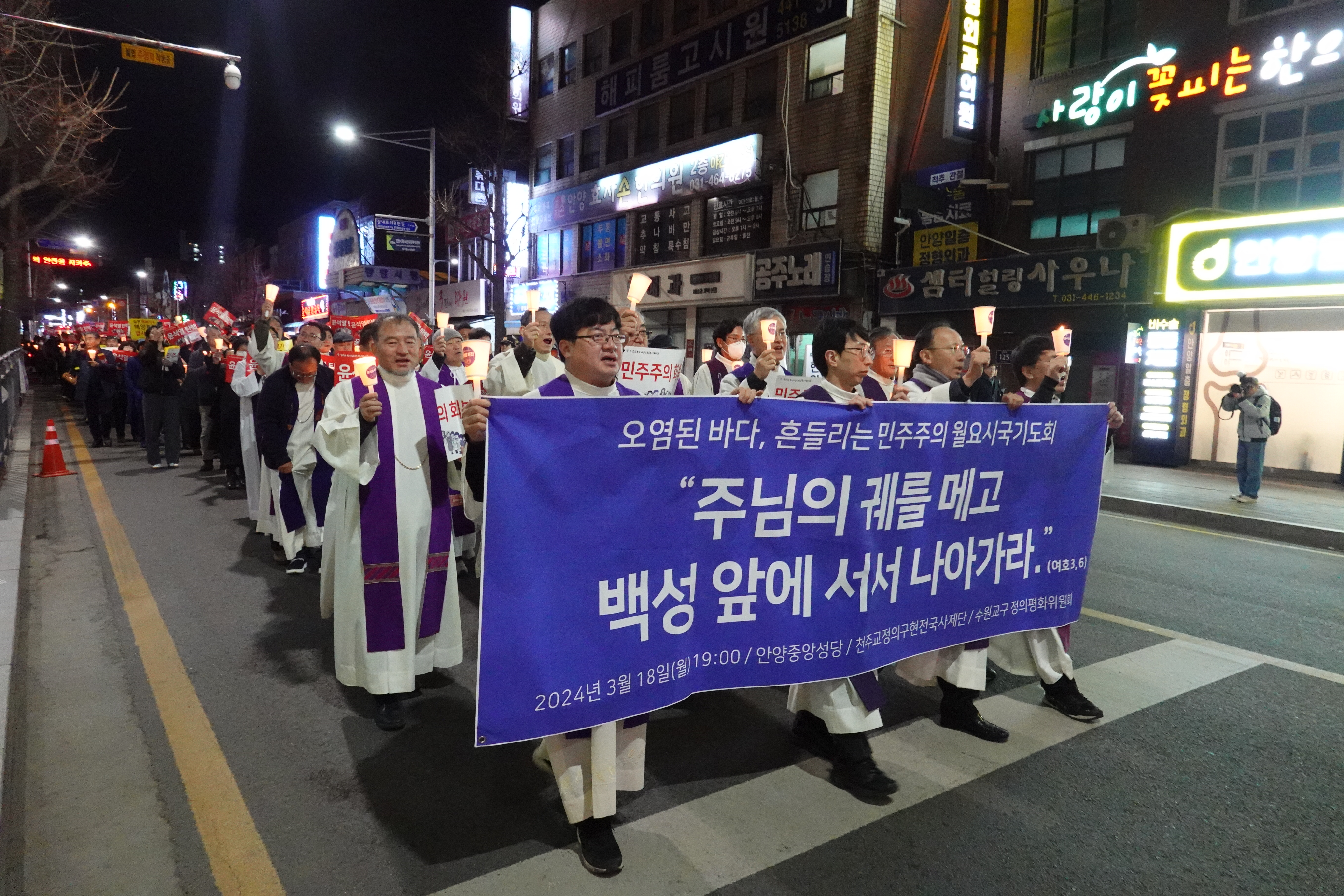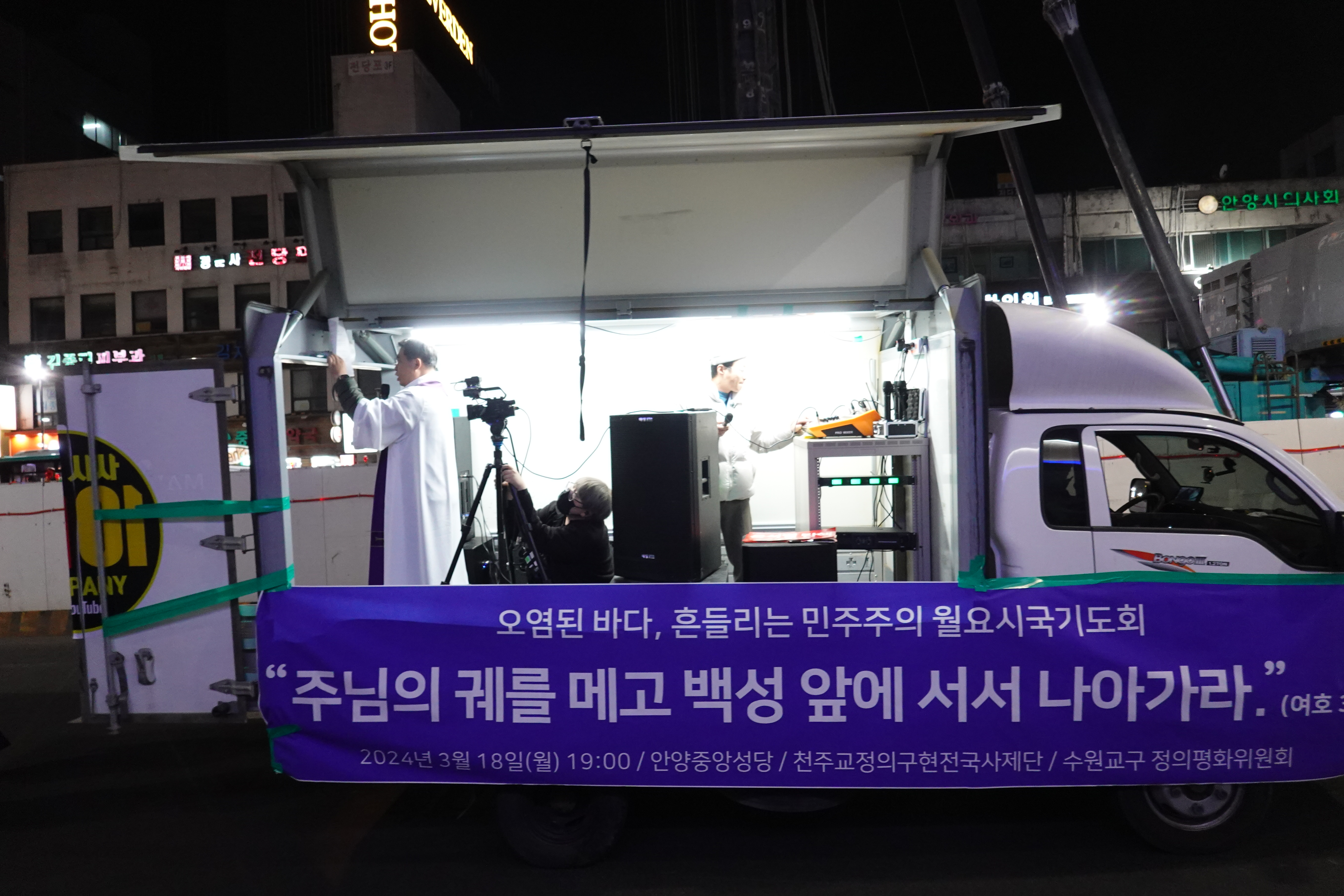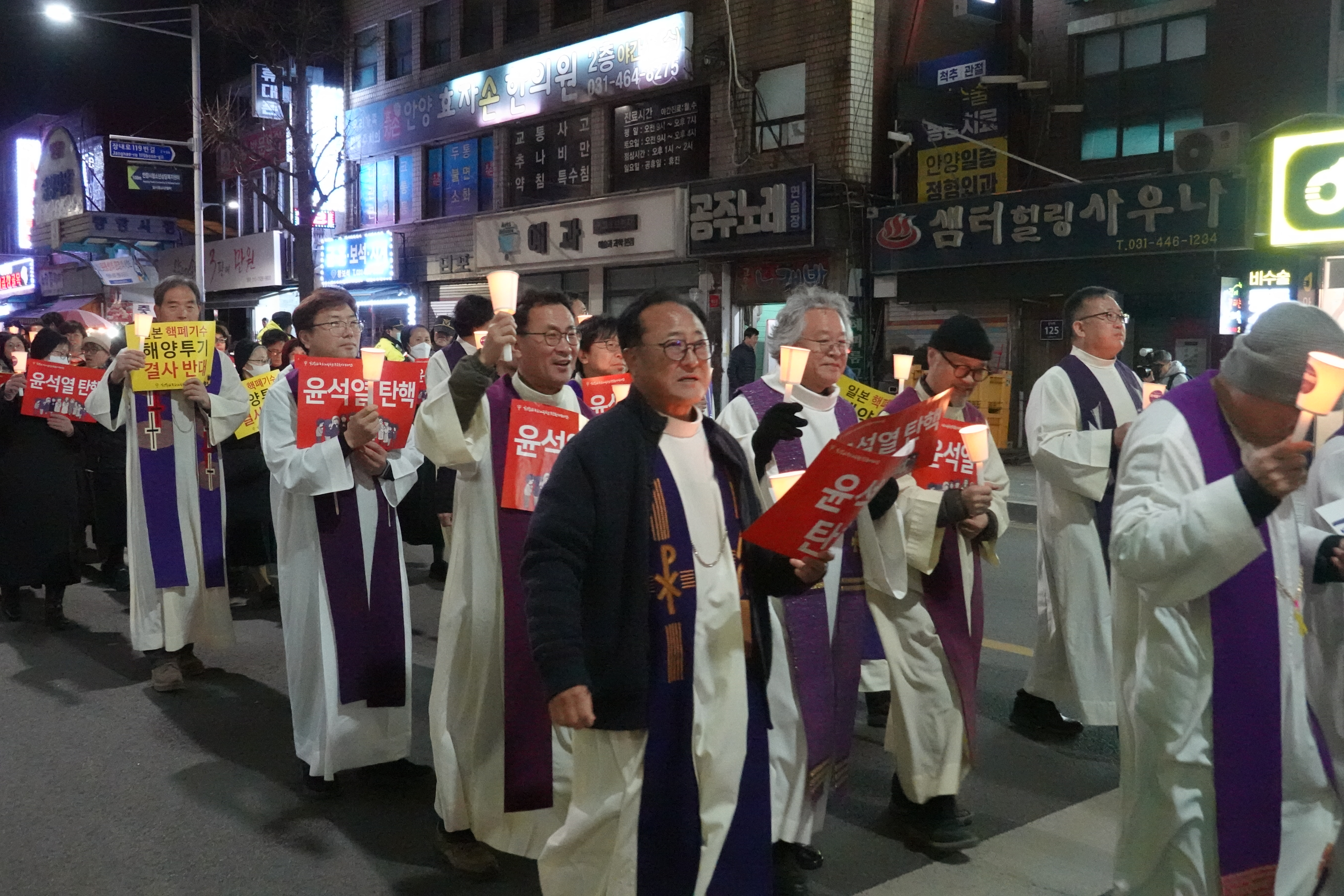 미사를 마친 사제단은 십자가를 앞세우고 시민들과 함께 안양중앙성당에서 안양역까지 행진하며 “집권당은 국민 앞에 석고대죄하고 윤석열을 탄핵하라” “윤비어천가 필요없다 언론을 개혁하라” “거짓평화 선동말고, 말만 공정 남발말고, 정의부터 회복하라” “묵은 땅을 갈아엎고 정의를 드높여라” 등의 구호를 외쳤다.