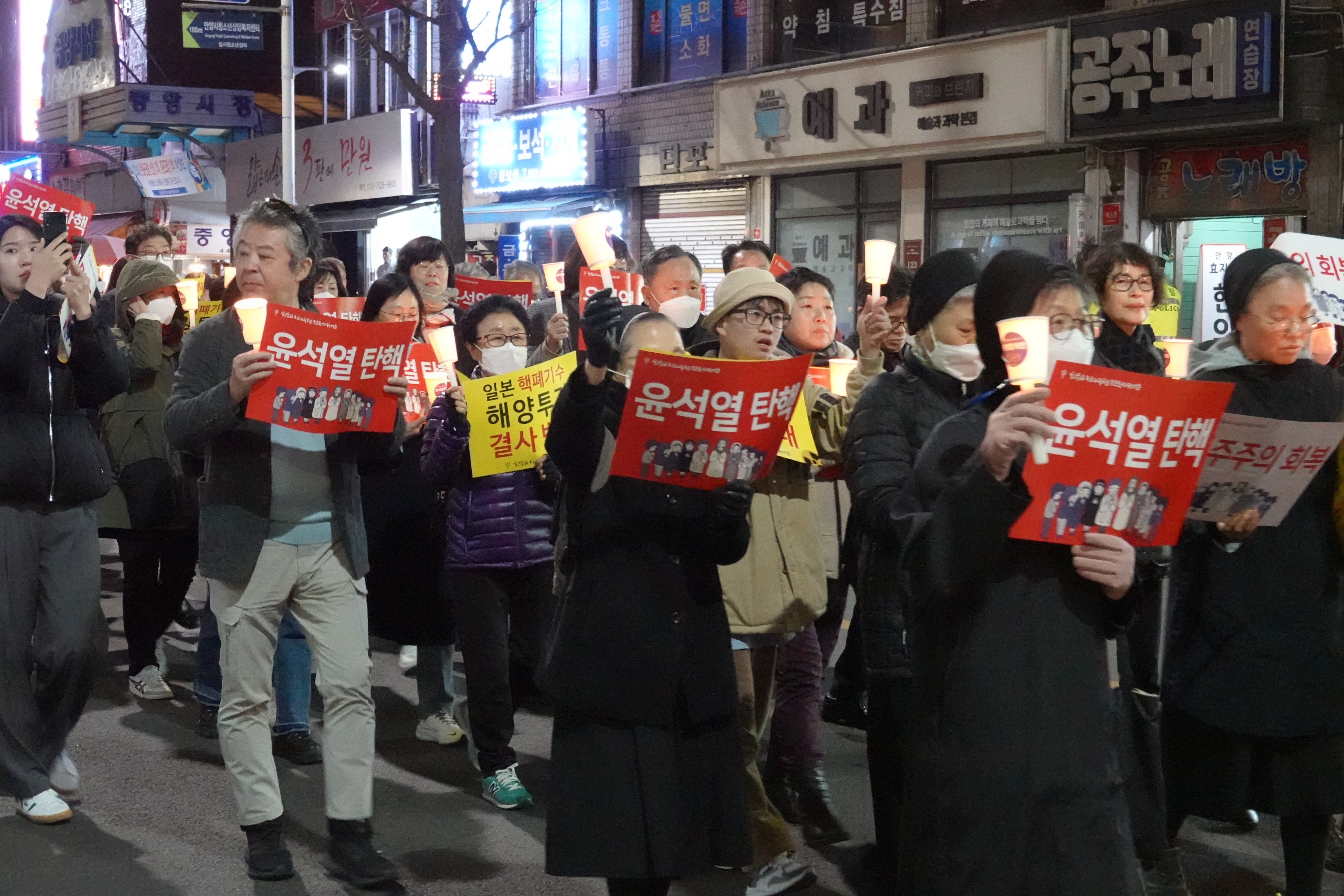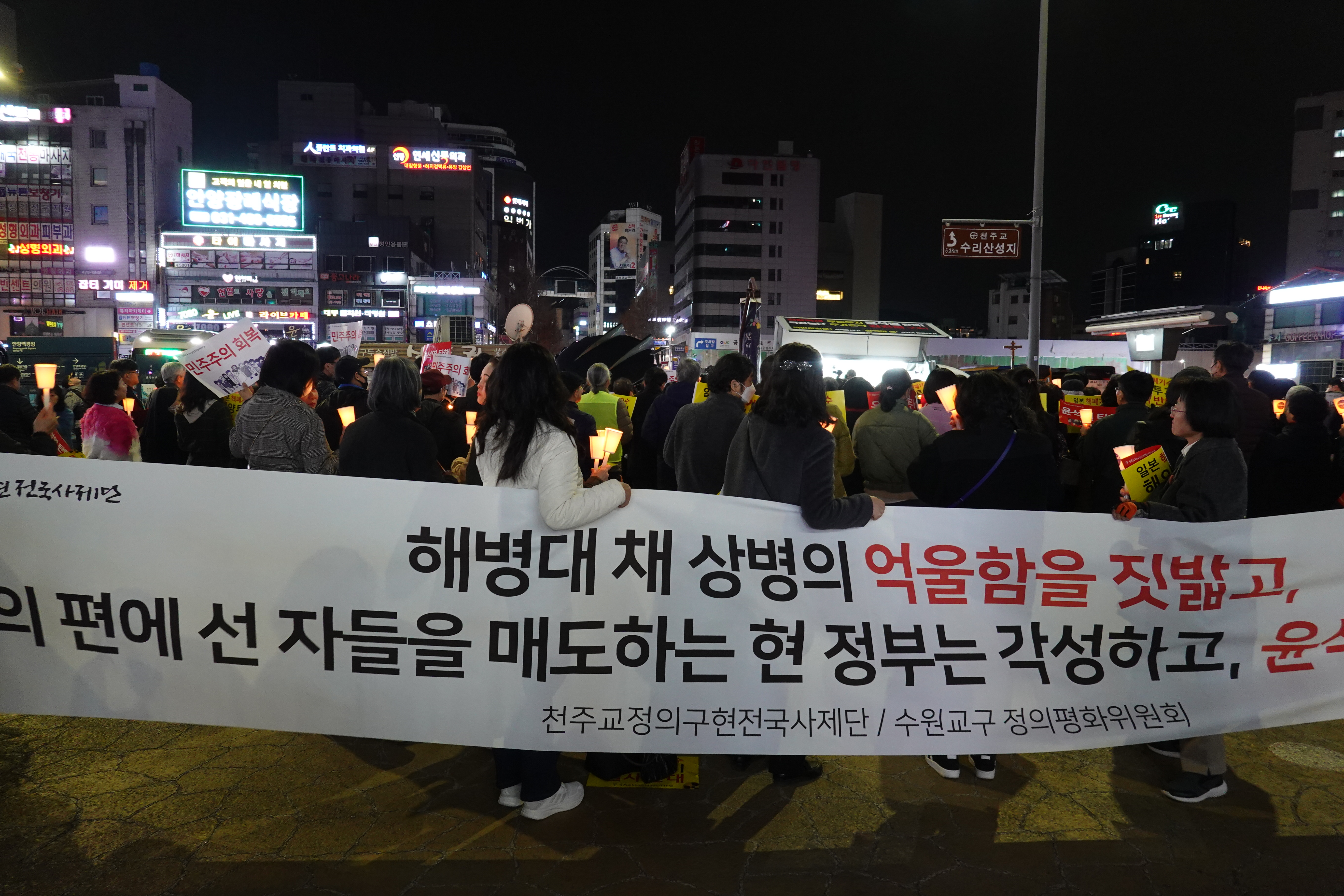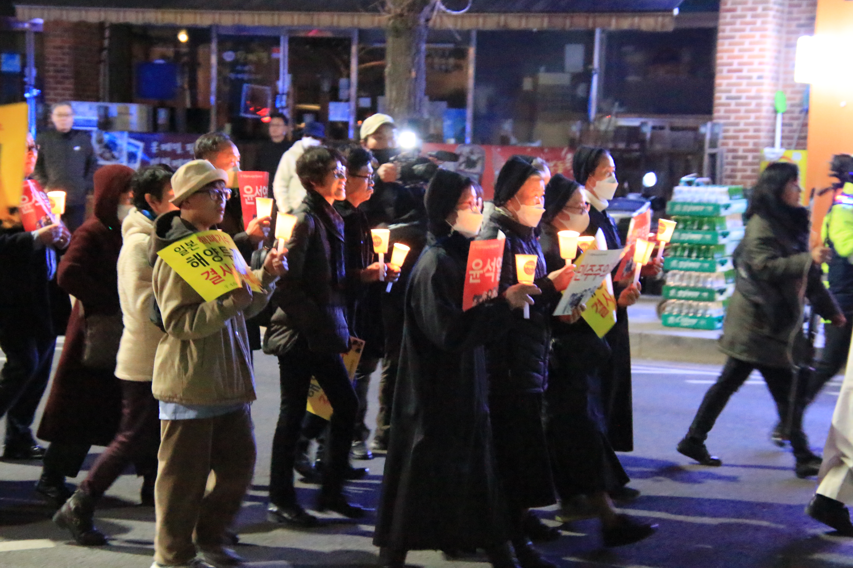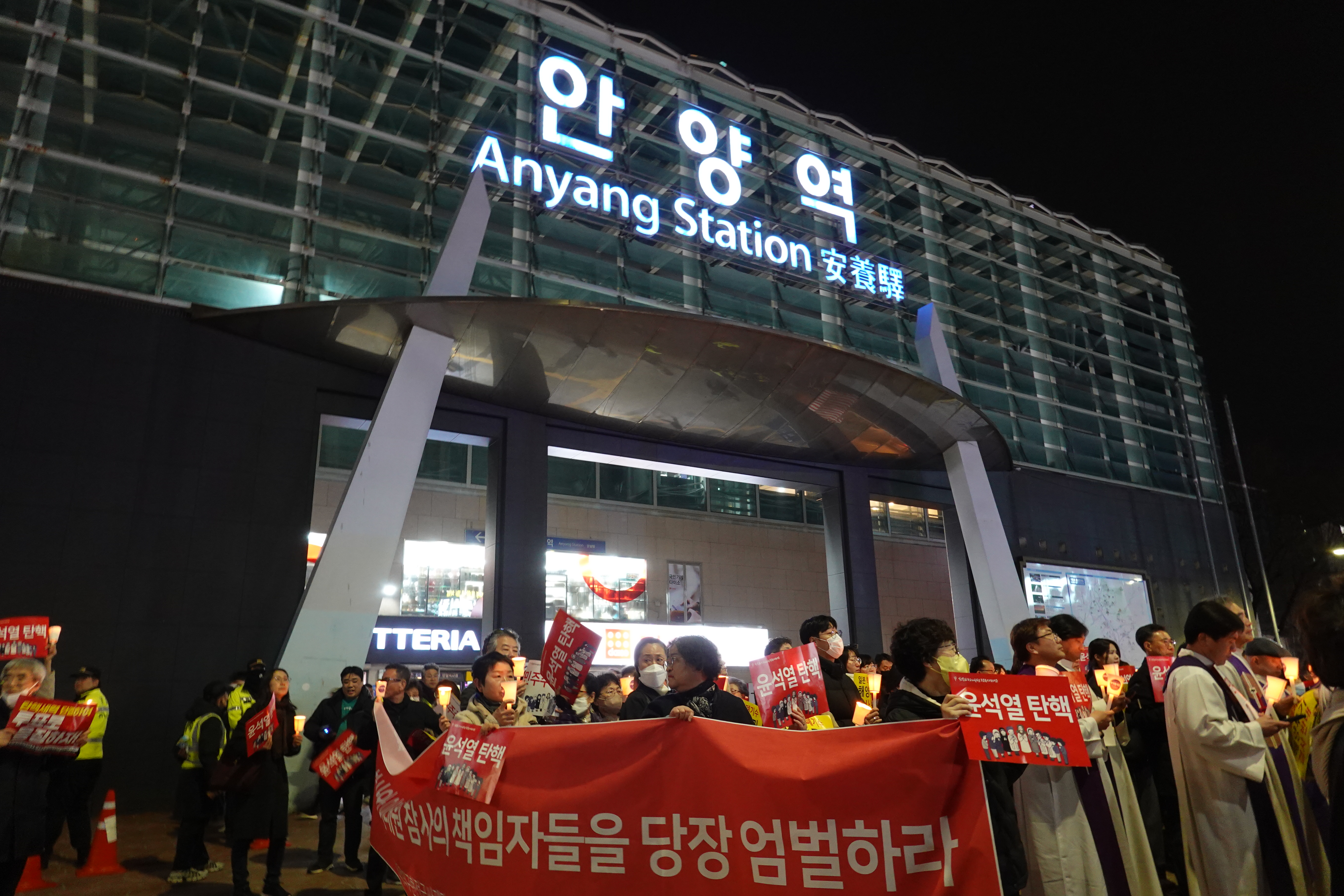 미사를 마친 사제단은 십자가를 앞세우고 시민들과 함께 안양중앙성당에서 안양역까지 행진하며 “집권당은 국민 앞에 석고대죄하고 윤석열을 탄핵하라” “윤비어천가 필요없다 언론을 개혁하라” “거짓평화 선동말고, 말만 공정 남발말고, 정의부터 회복하라” “묵은 땅을 갈아엎고 정의를 드높여라” 등의 구호를 외쳤다.