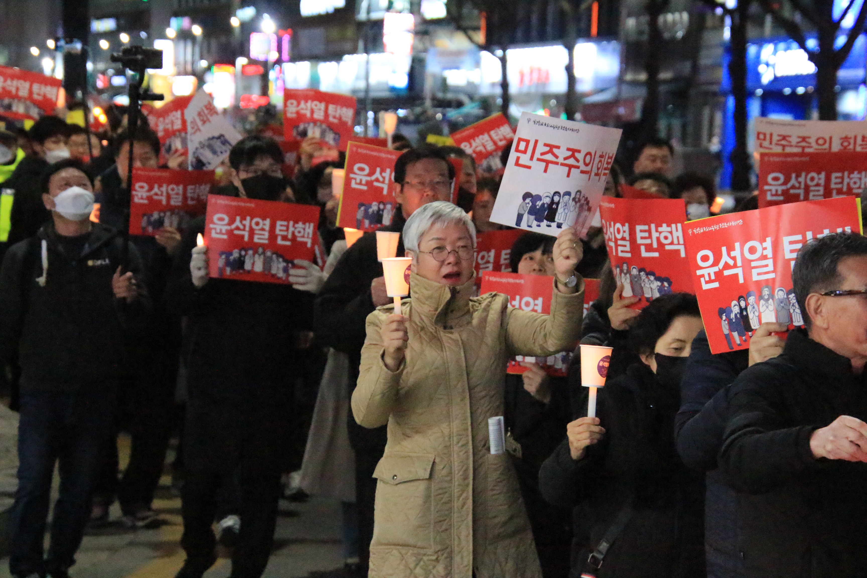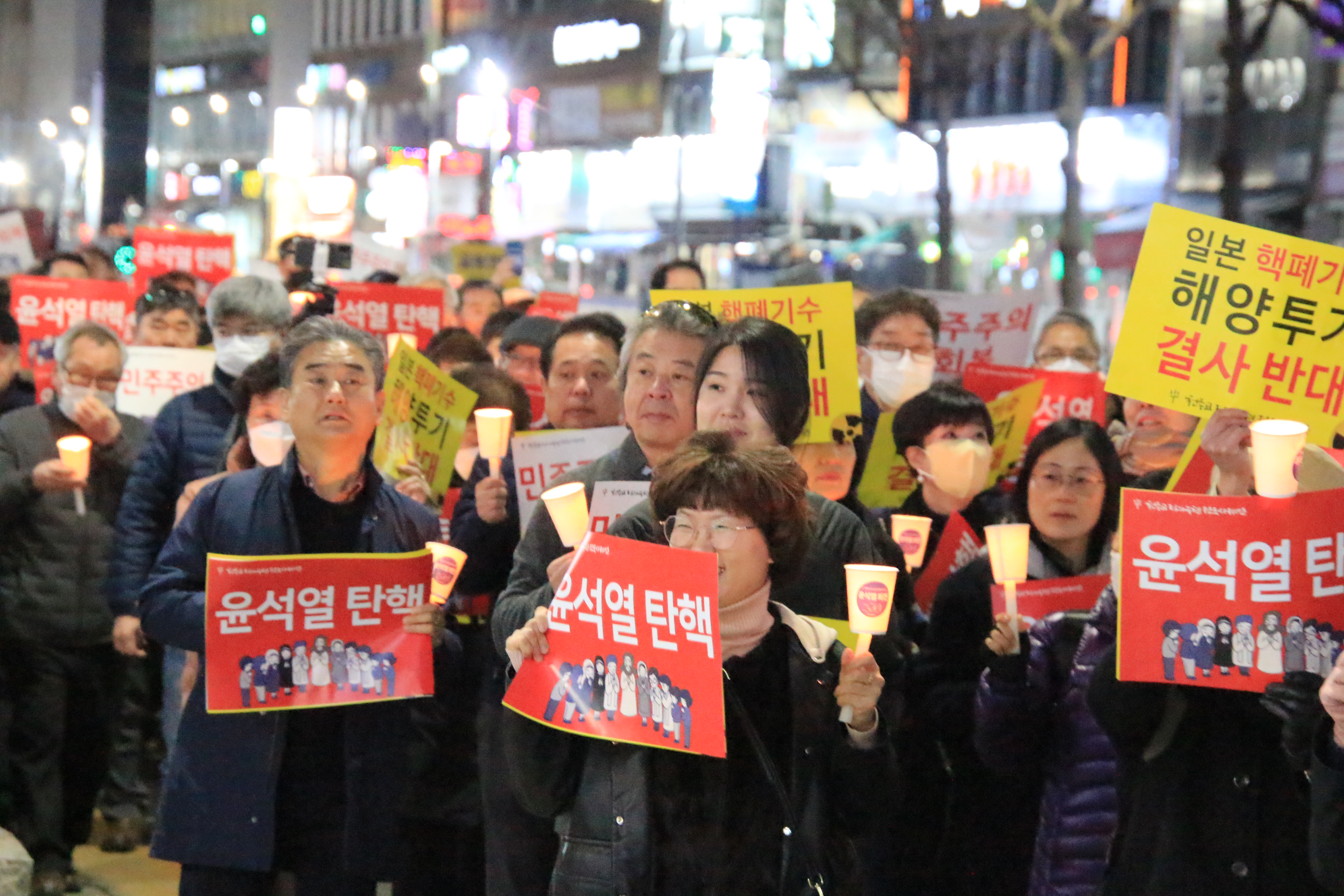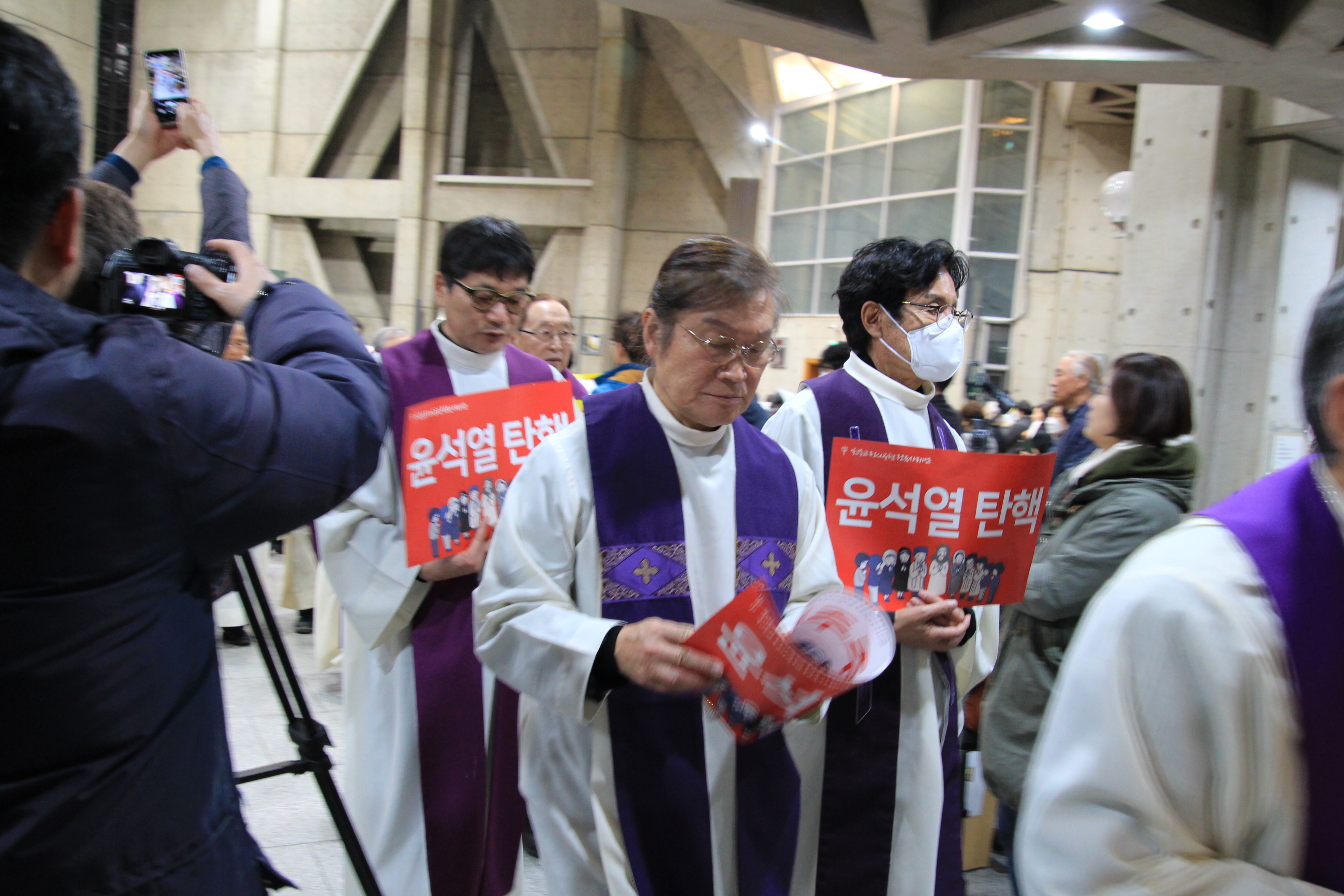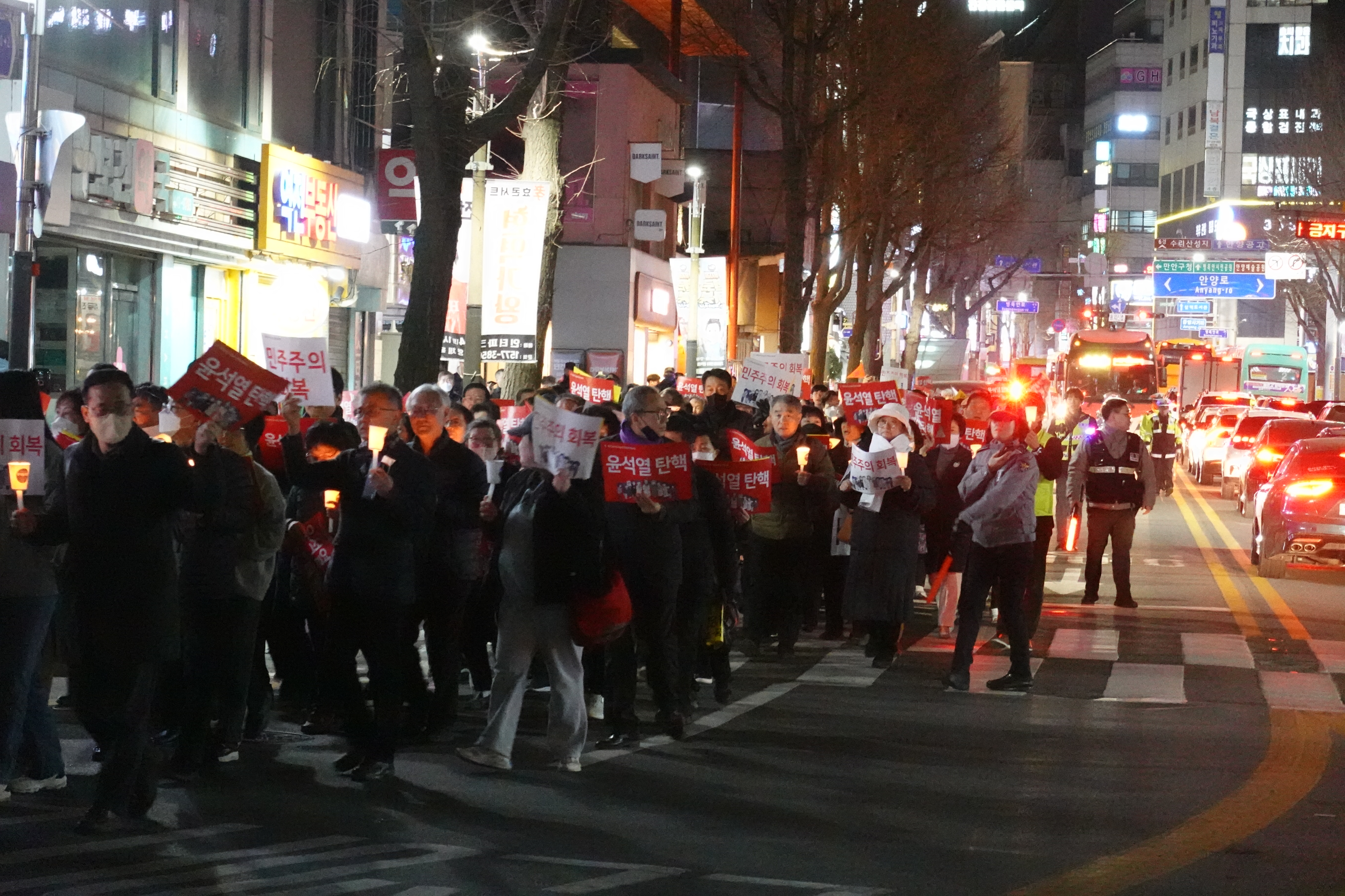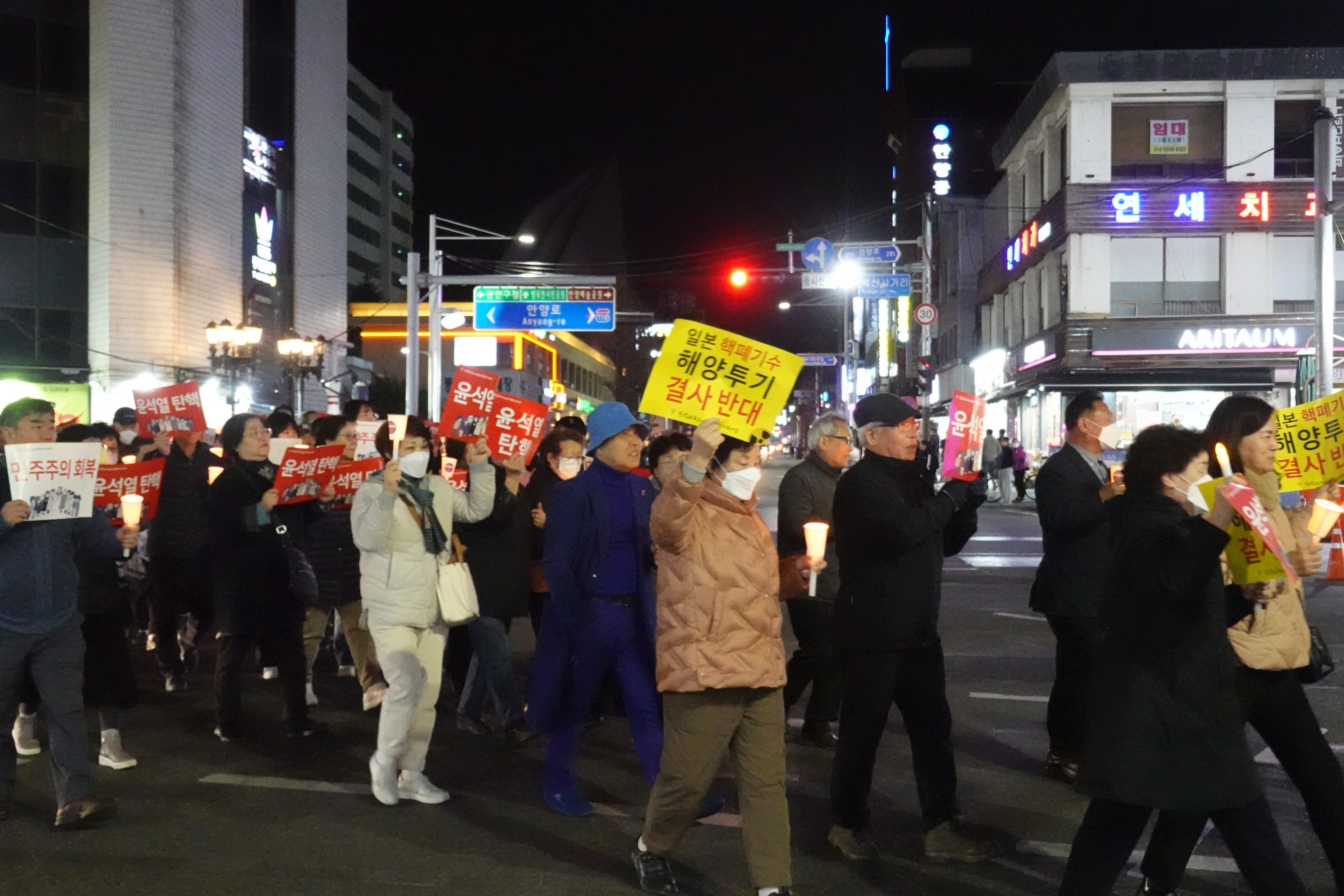 미사를 마친 사제단은 십자가를 앞세우고 시민들과 함께 안양중앙성당에서 안양역까지 행진하며 “집권당은 국민 앞에 석고대죄하고 윤석열을 탄핵하라” “윤비어천가 필요없다 언론을 개혁하라” “거짓평화 선동말고, 말만 공정 남발말고, 정의부터 회복하라” “묵은 땅을 갈아엎고 정의를 드높여라” 등의 구호를 외쳤다.