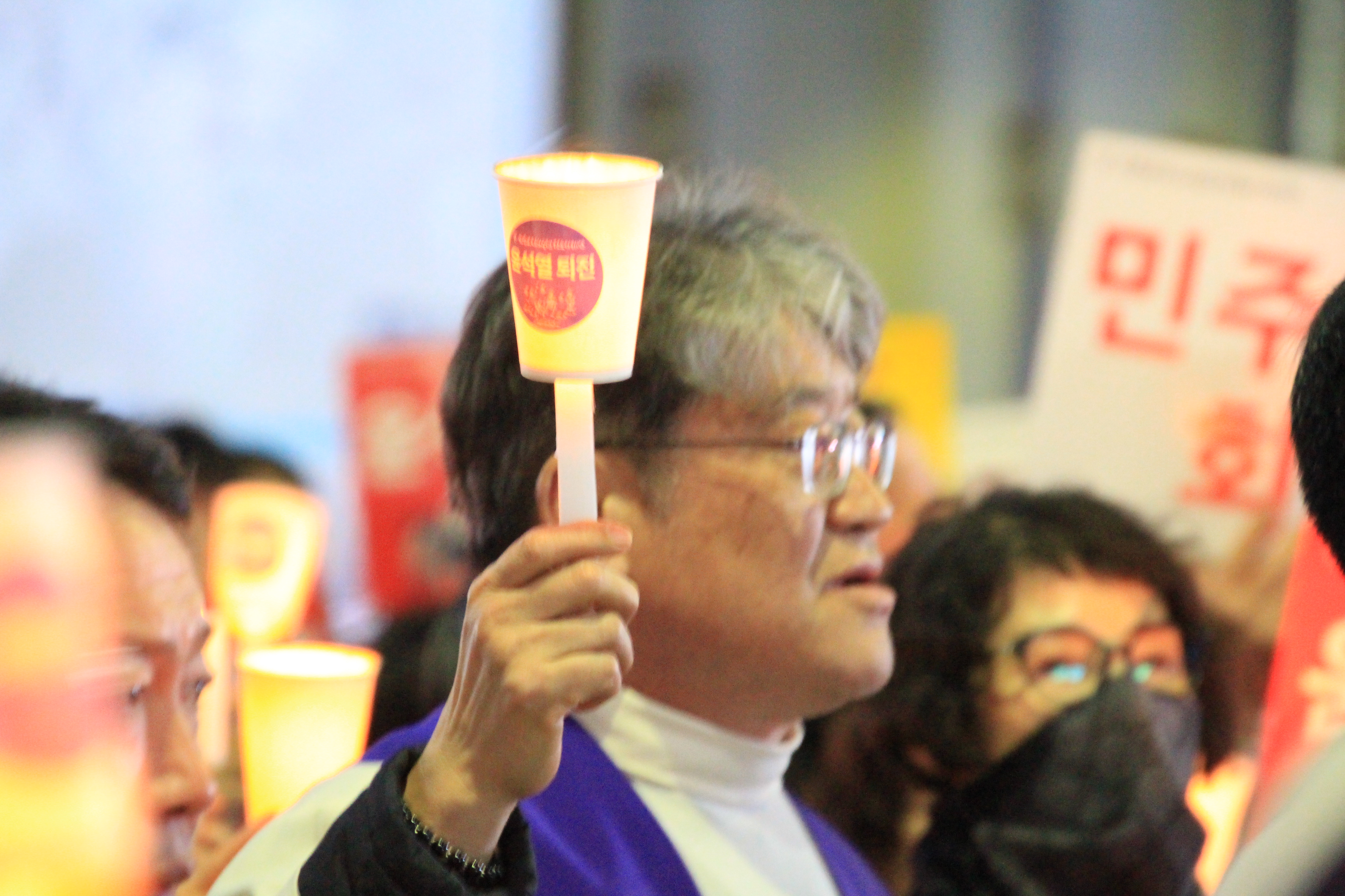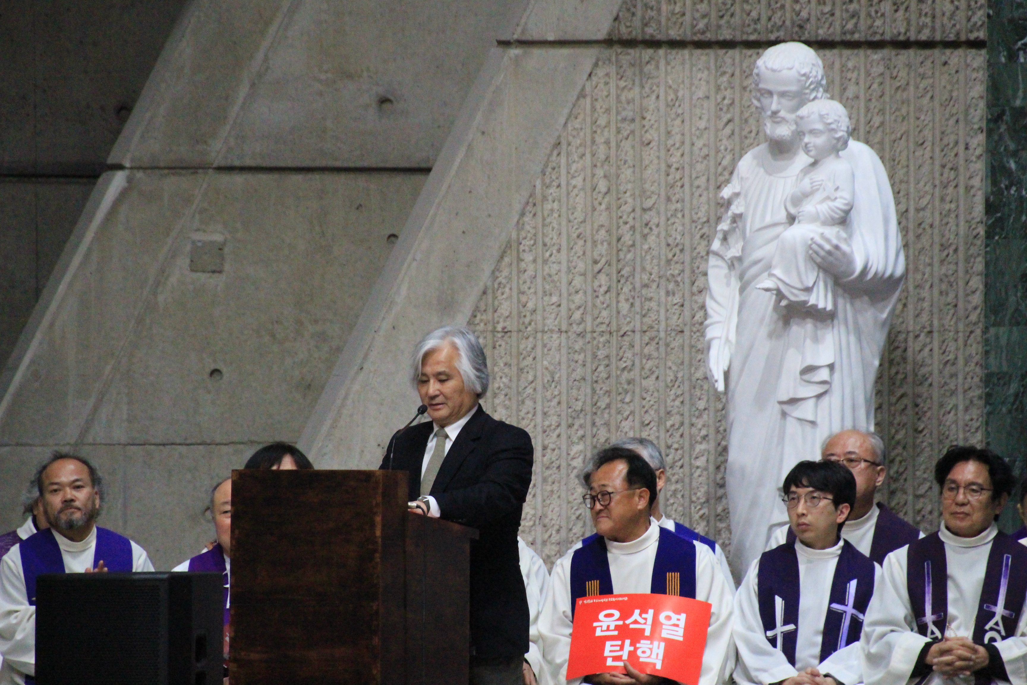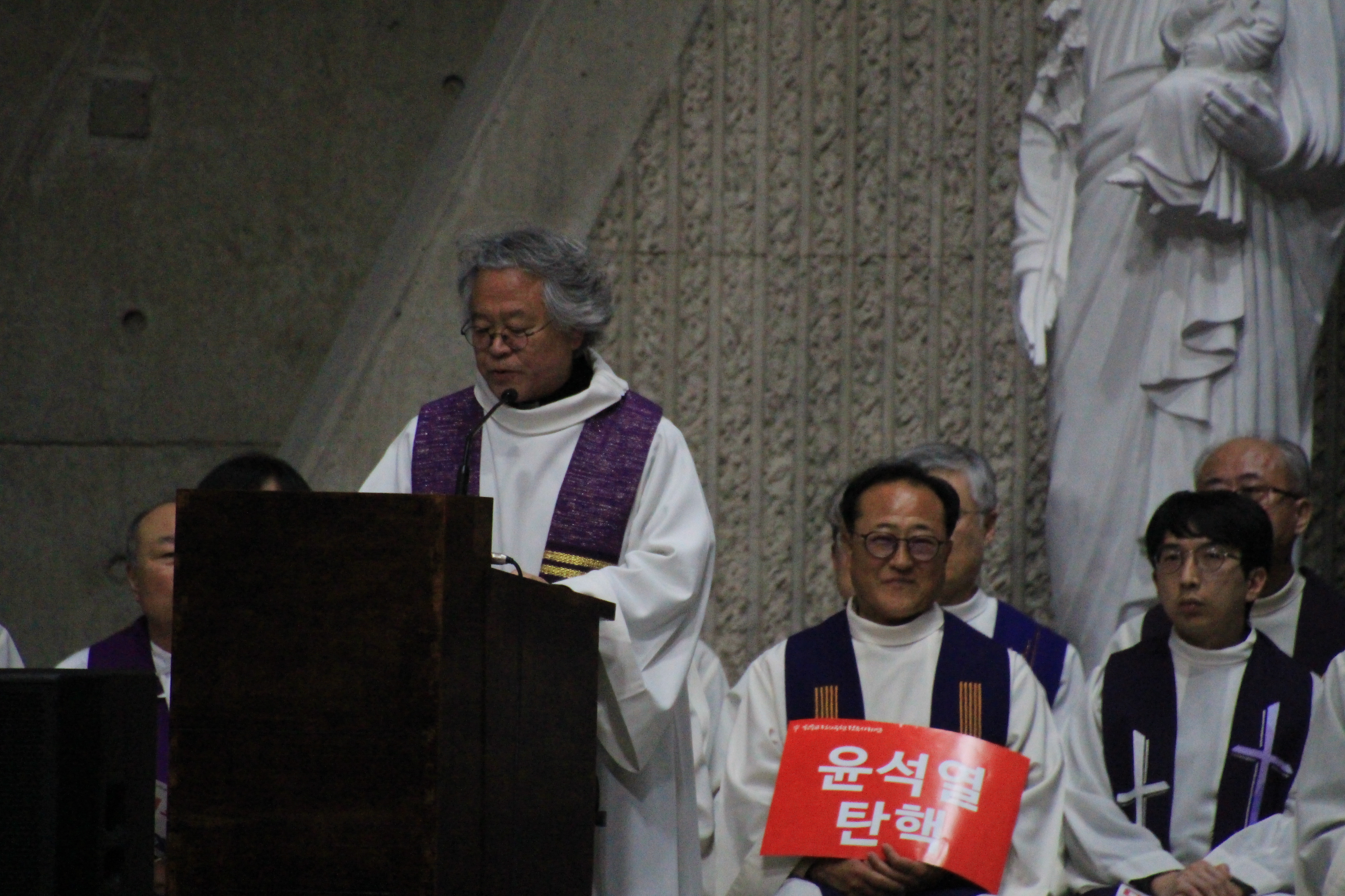 주례를 맡은 김형중 신부는 “(대통령) 한 사람의 독주가 우리 민주주의를 크게 훼손하고 있다”면서 “그는 ‘특검을 거부하는 자가 범인이다’ ‘죄가 있으니까 거부하는 것 아니냐’고 스스로 말했다. 그런 그가 스스로 특검을 거부했다. 그것은 곧 죄가 있다고 스스로 말하는 것이라고 생각한다”고 말했다.