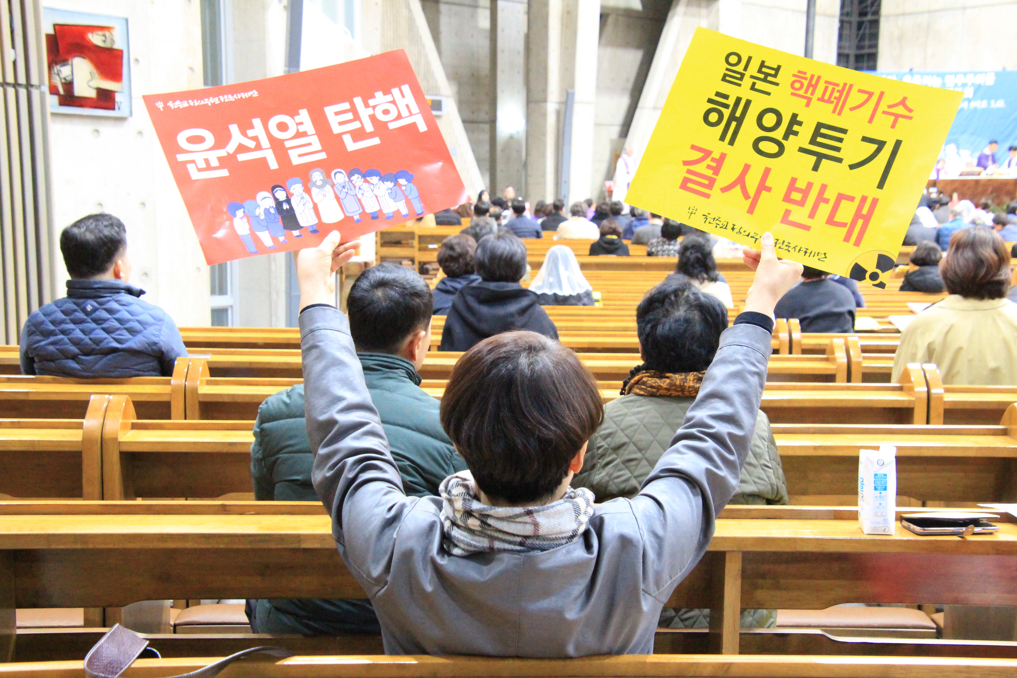 폐막 미사 강론을 한 양기석 신부는 “집권한 지 2년이 안 된 윤 대통령은 양곡관리법을 비롯해 노란 봉투법, 방송 3법, 간호법, 도이치ㅣ사 모터스 주가조작 특검과 대장동개발 50억 뇌물수수 관련 특검법 그리고 이태원 참사 특별법 등 총 9개 법안에 대해 거부권을 행사했다”며 “구조적 부당함으로 고통당하는 사회적 약자를 위로하고 아픔을 치유할 수 있는 최소한의 안전장치를 마련하는 시도를 애초에 막아버렸다”고 비판했다.