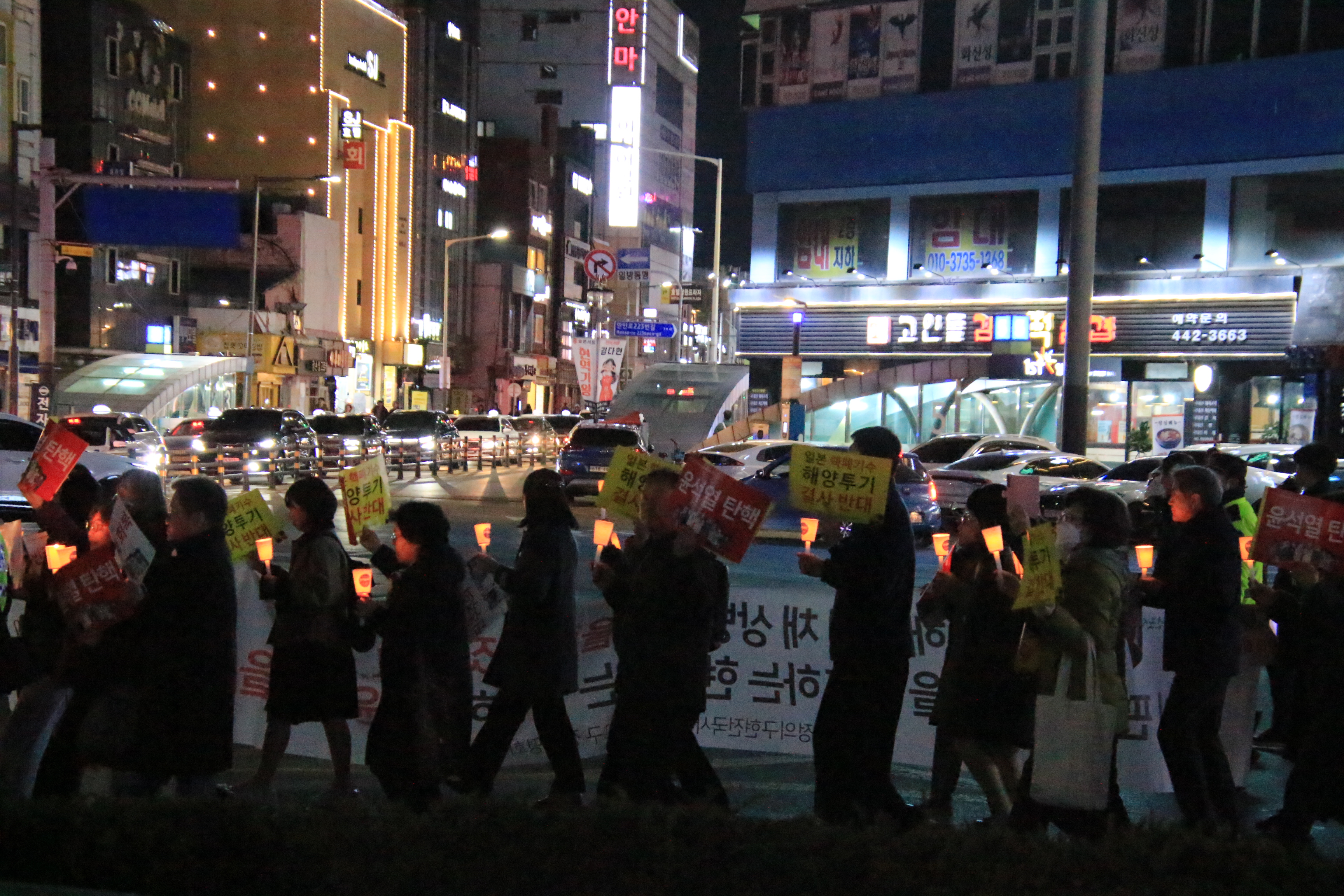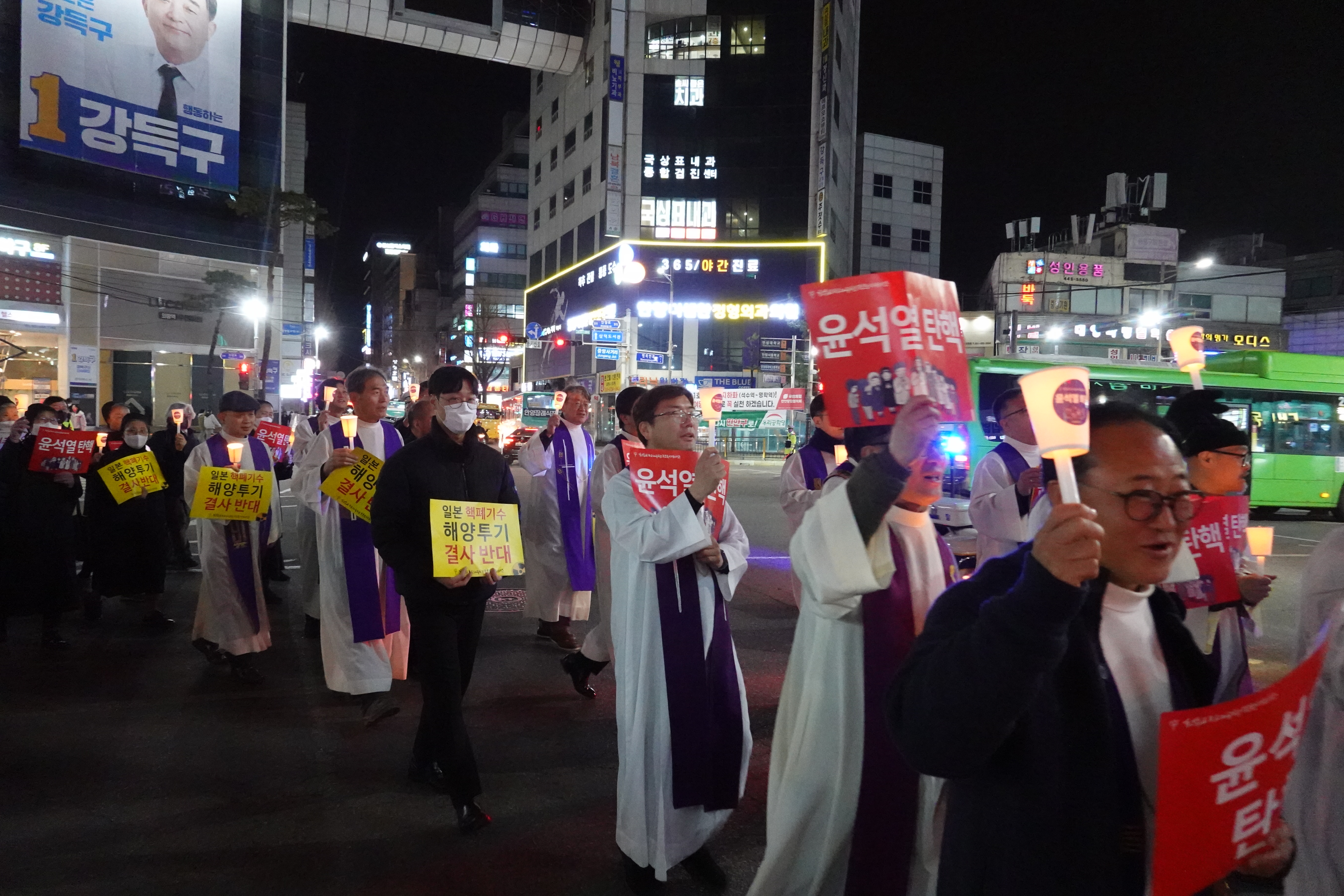 미사를 마친 사제단은 십자가를 앞세우고 시민들과 함께 안양중앙성당에서 안양역까지 행진하며 “집권당은 국민 앞에 석고대죄하고 윤석열을 탄핵하라” “윤비어천가 필요없다 언론을 개혁하라” “거짓평화 선동말고, 말만 공정 남발말고, 정의부터 회복하라” “묵은 땅을 갈아엎고 정의를 드높여라” 등의 구호를 외쳤다.