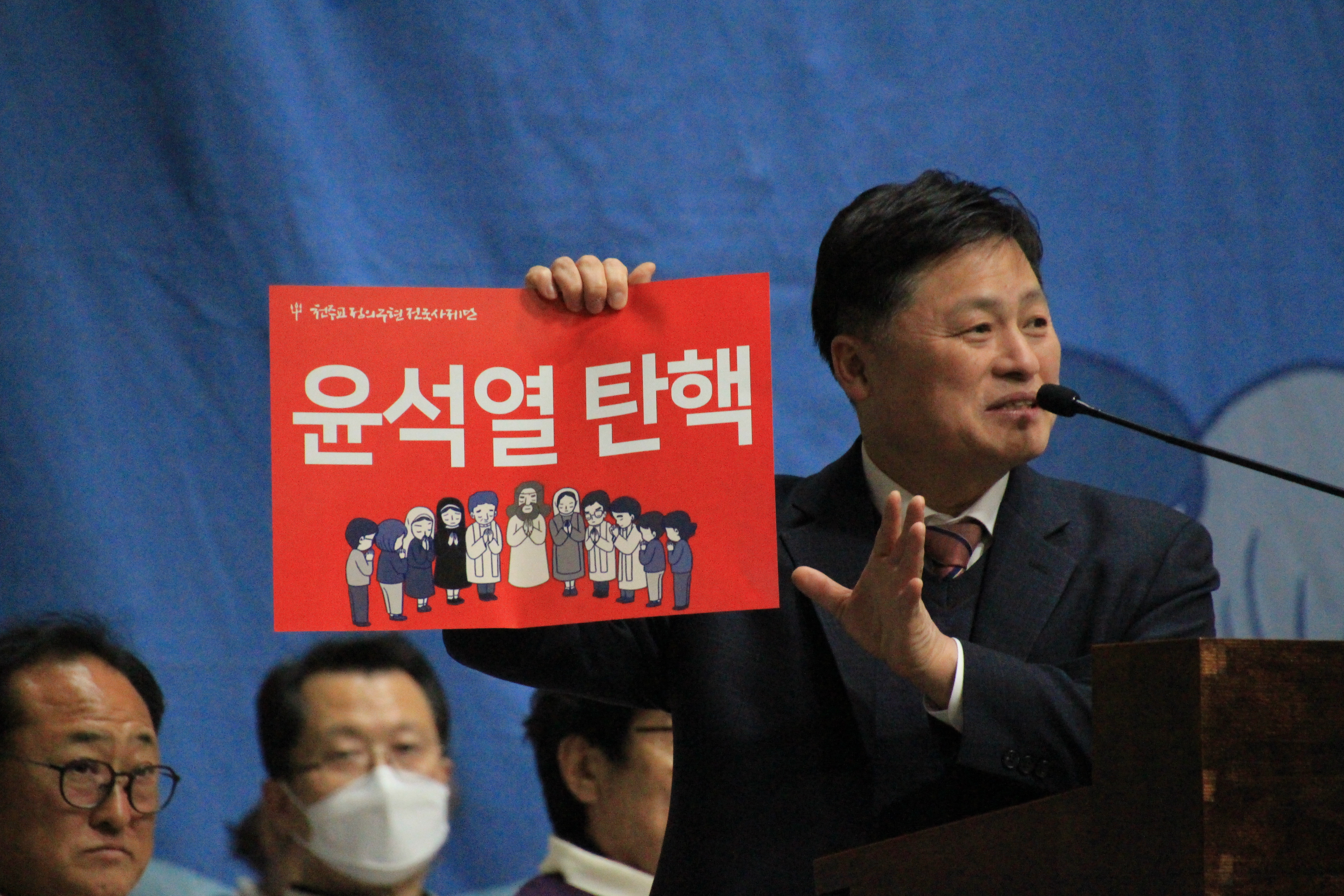 김 신부는 “독주하는 윤석열 정부에게 우리는 요구한다”면서 “이 나라의 민주주의를 위해서 스스로 ‘큰 결심’을 해주기를 바란다”고 말했다. 대통령이 스스로 책임지고 물러나야 한다고 말한 것으로 해석된다.