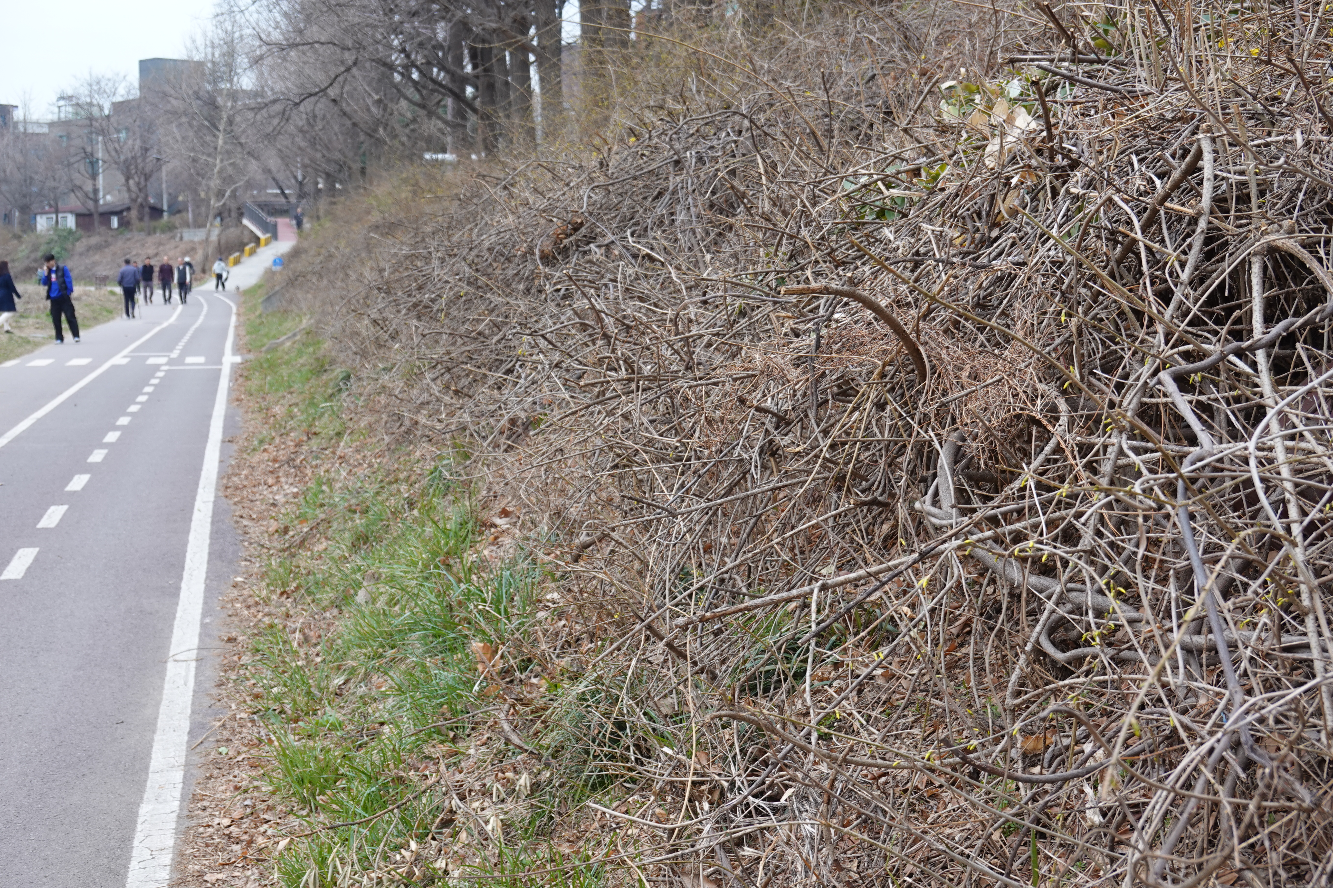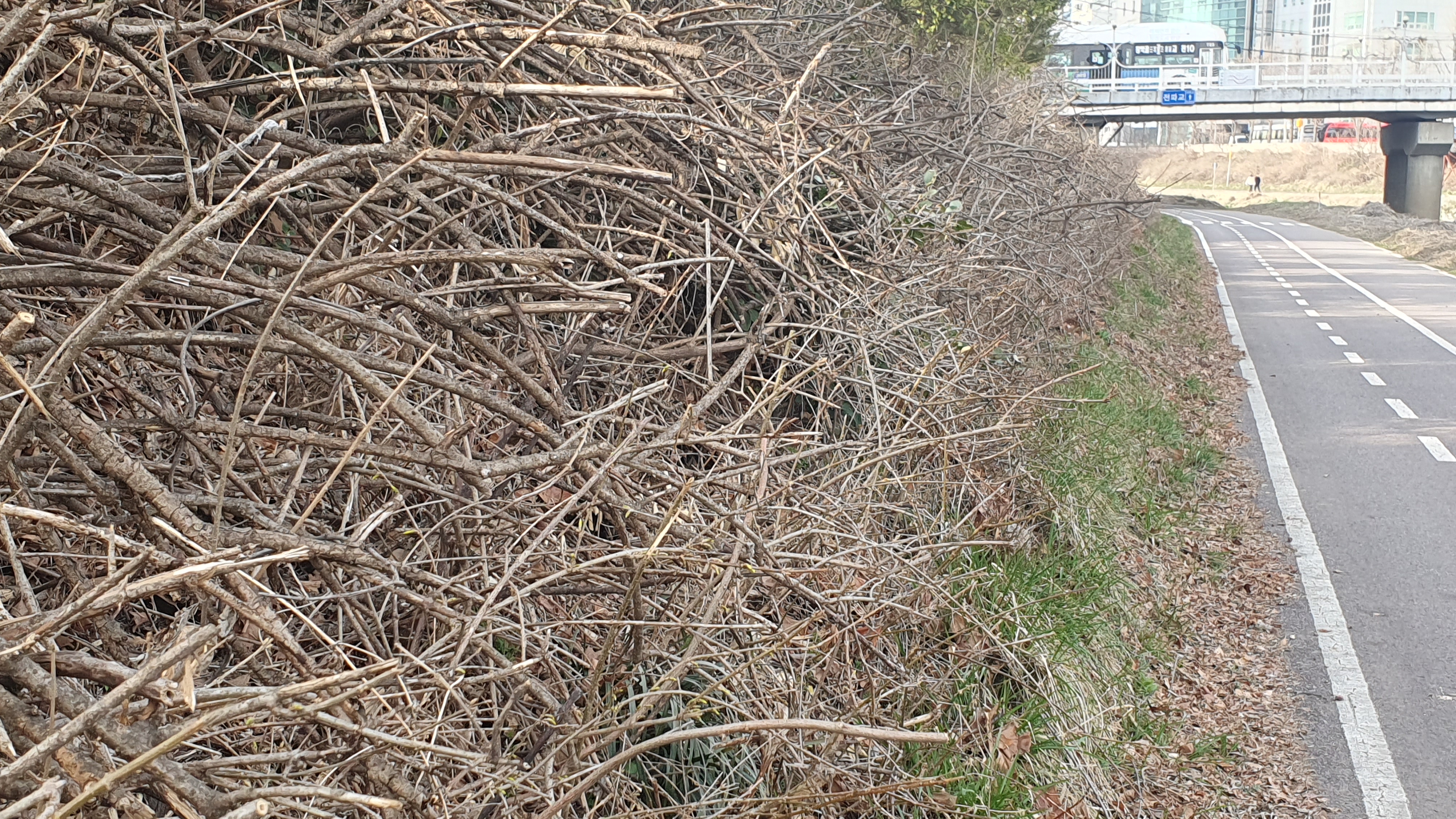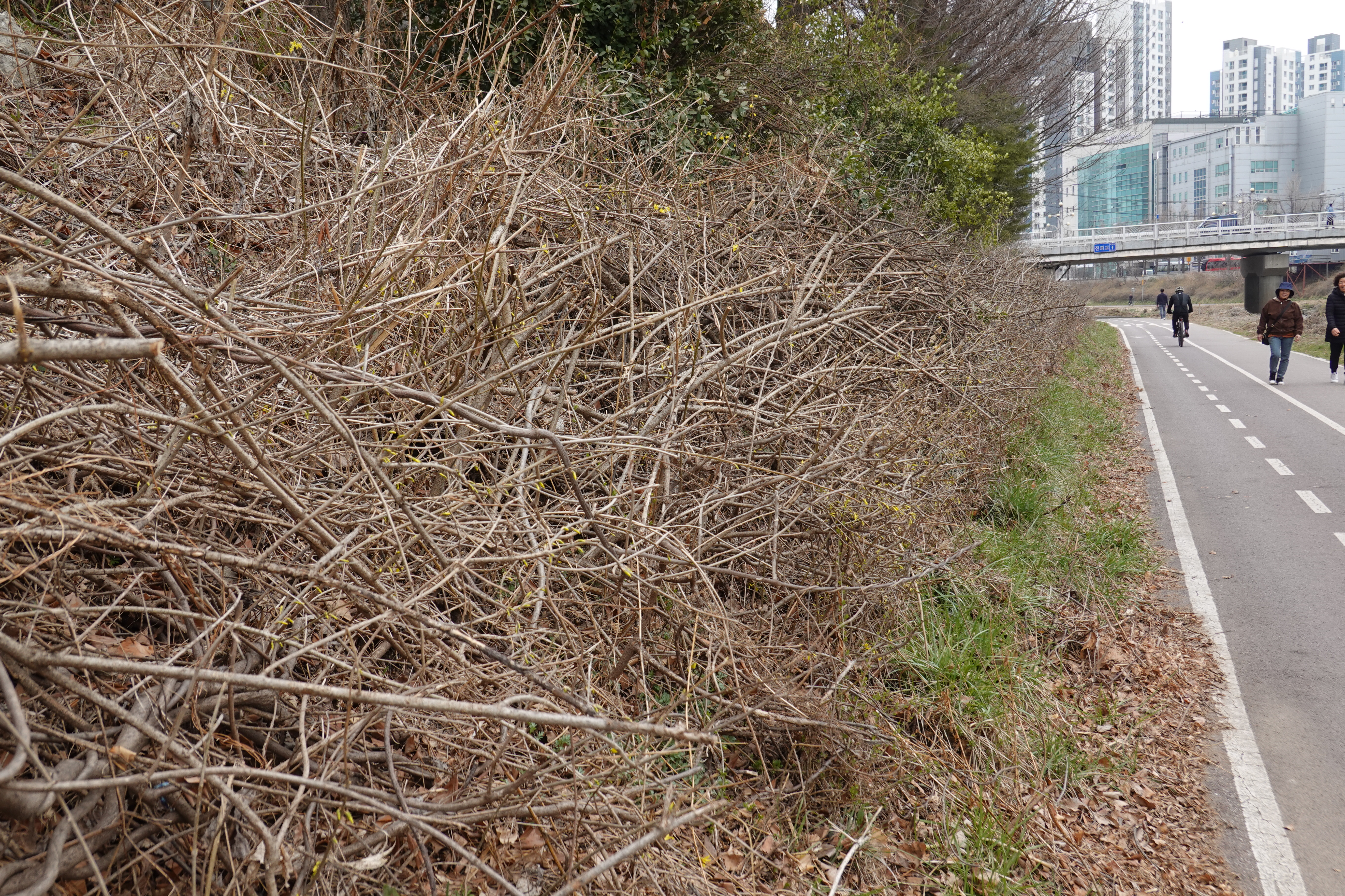 하지만 3월 22일 현장을 다시 가보니 지난 2월 서로교-명학대교 구간의 일부애서만 베어진 모습이던 개나리 군락지는 대부분 사라지고 말았다. 오히려 개나리 군락지 제거를 계속하여 서로교부터 명학대교 구간을 모조리 베어낸 것이다.