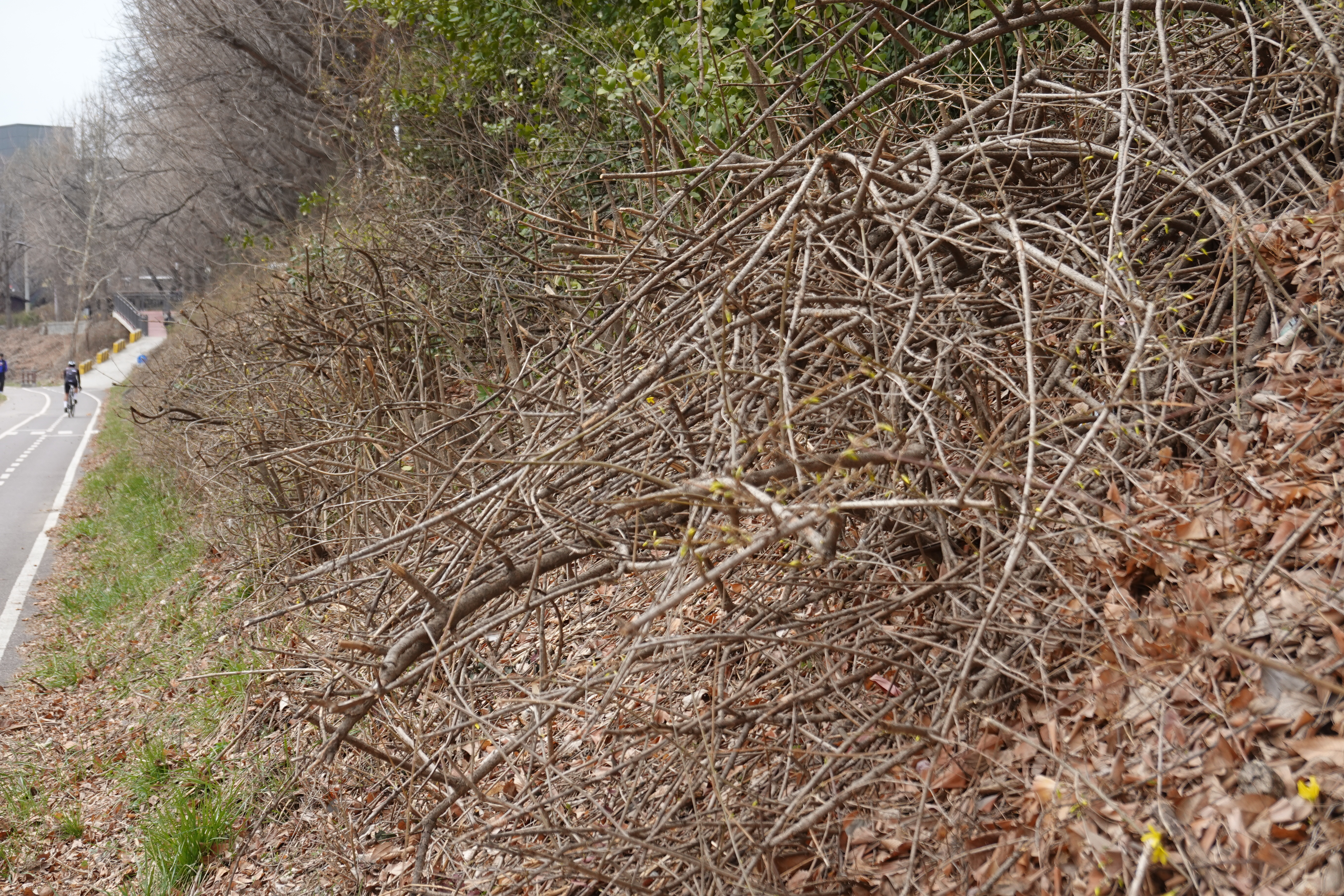 그런데 개나리 군락지가 훼손되기 시작됐다. 지난해 여름 안양천 수해로 안양시 관내 일부지역이 침수피해를 본 이후 안양변의 나무와 수풀들을 제거하기 시작하더니 급기야는 개나리 군락지까지 베어낸 것으로 보인다.