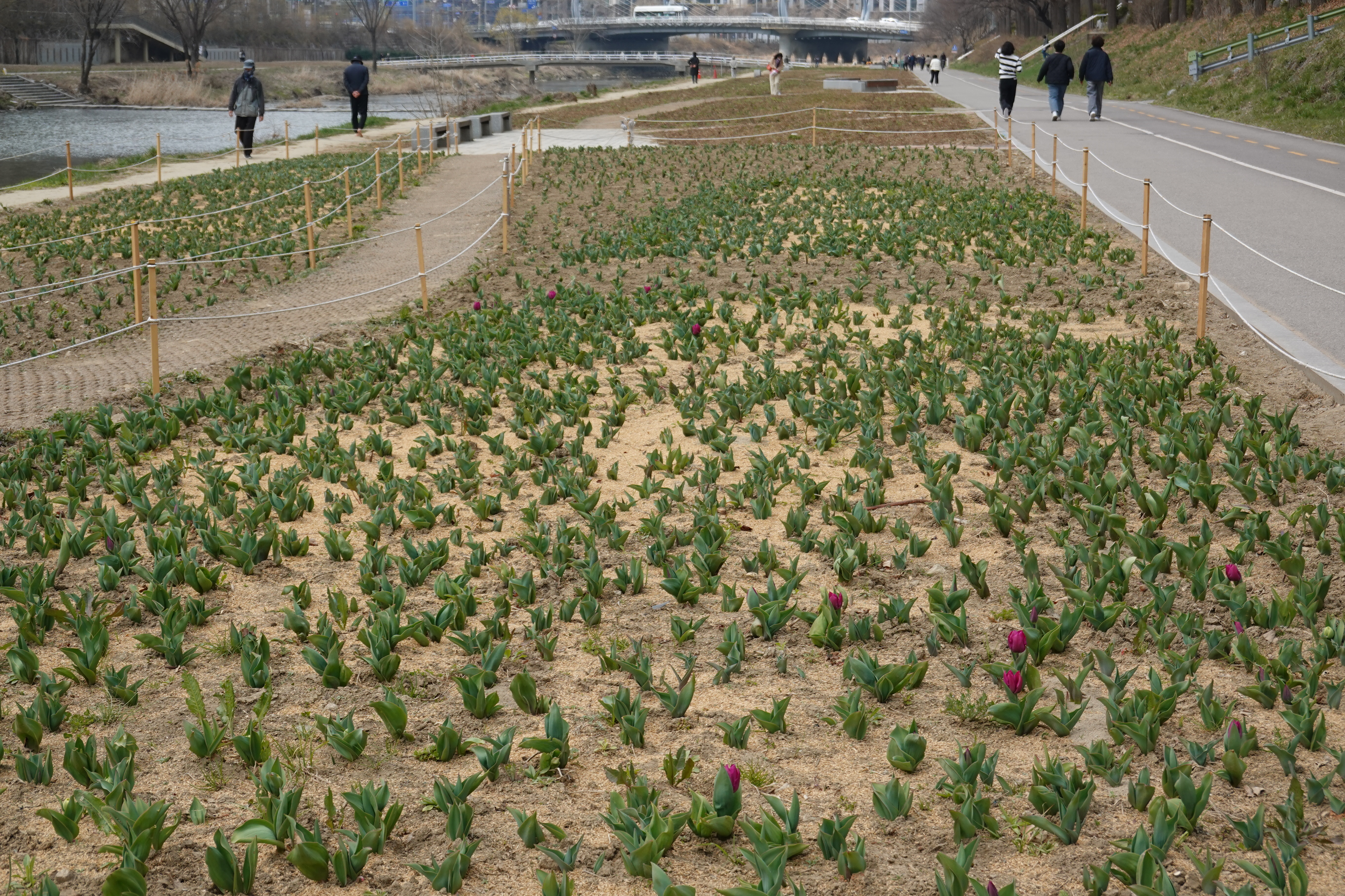 2024.03.22/ #도시기록 #튜율립꽃밭 #안양천/ 안양천 쌍개울-비산습지 구간의 동쪽 천변에 겨울내내 덮여있던 볏짚 거적이 제거되자 튜율립들이 얼굴을 뻬꼼 얼굴을 내밀기 시작했다. 안양천 국가정원화 추진 사업의 시작인가 싶은데 예쁘다며 꽃밭 정원을 반기는 반응과 안양천이 점점 인공하천이 되어가는 모습과 하천 범람시 훼손 등 우려의 목소리가 교차한다.