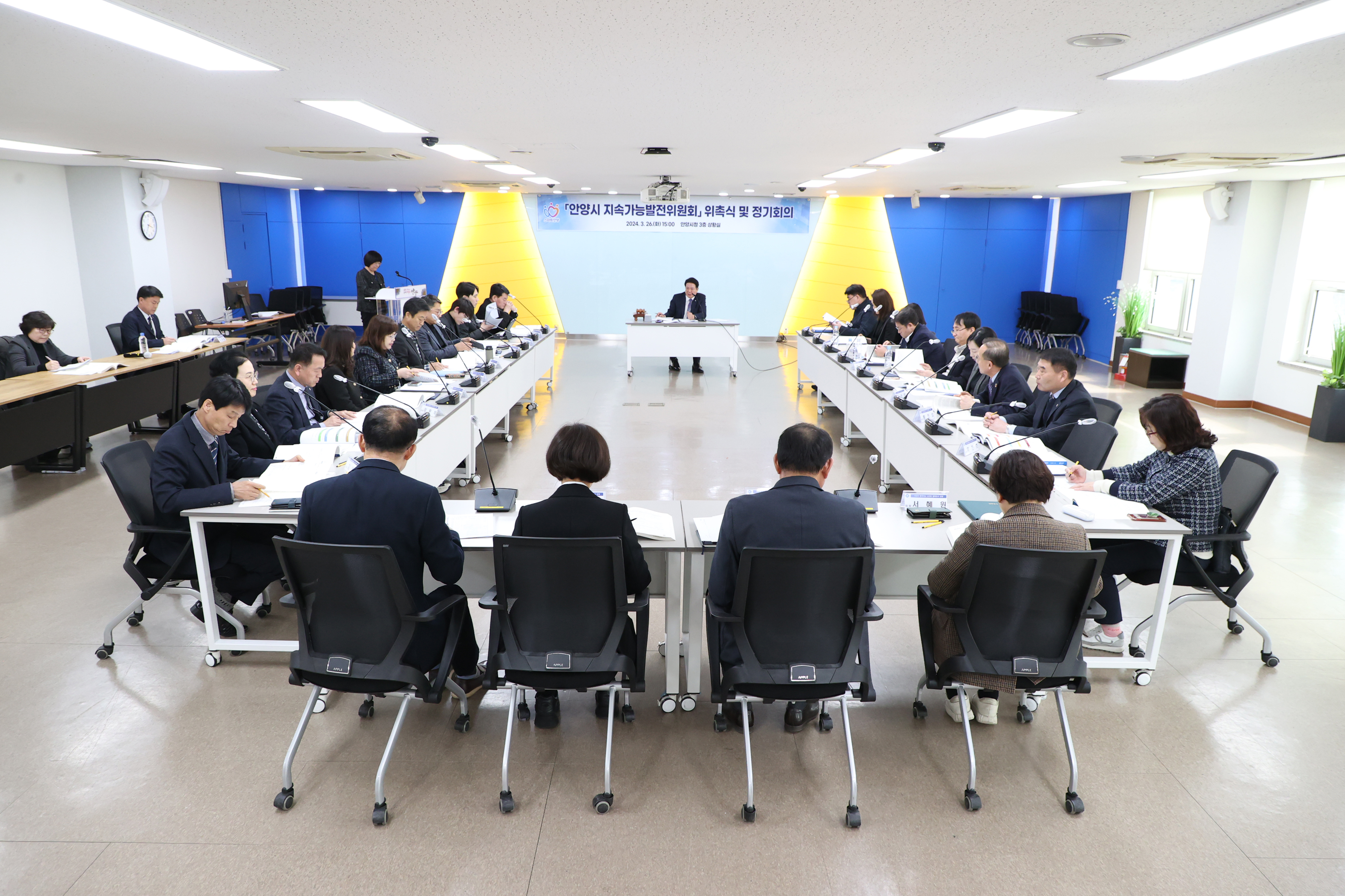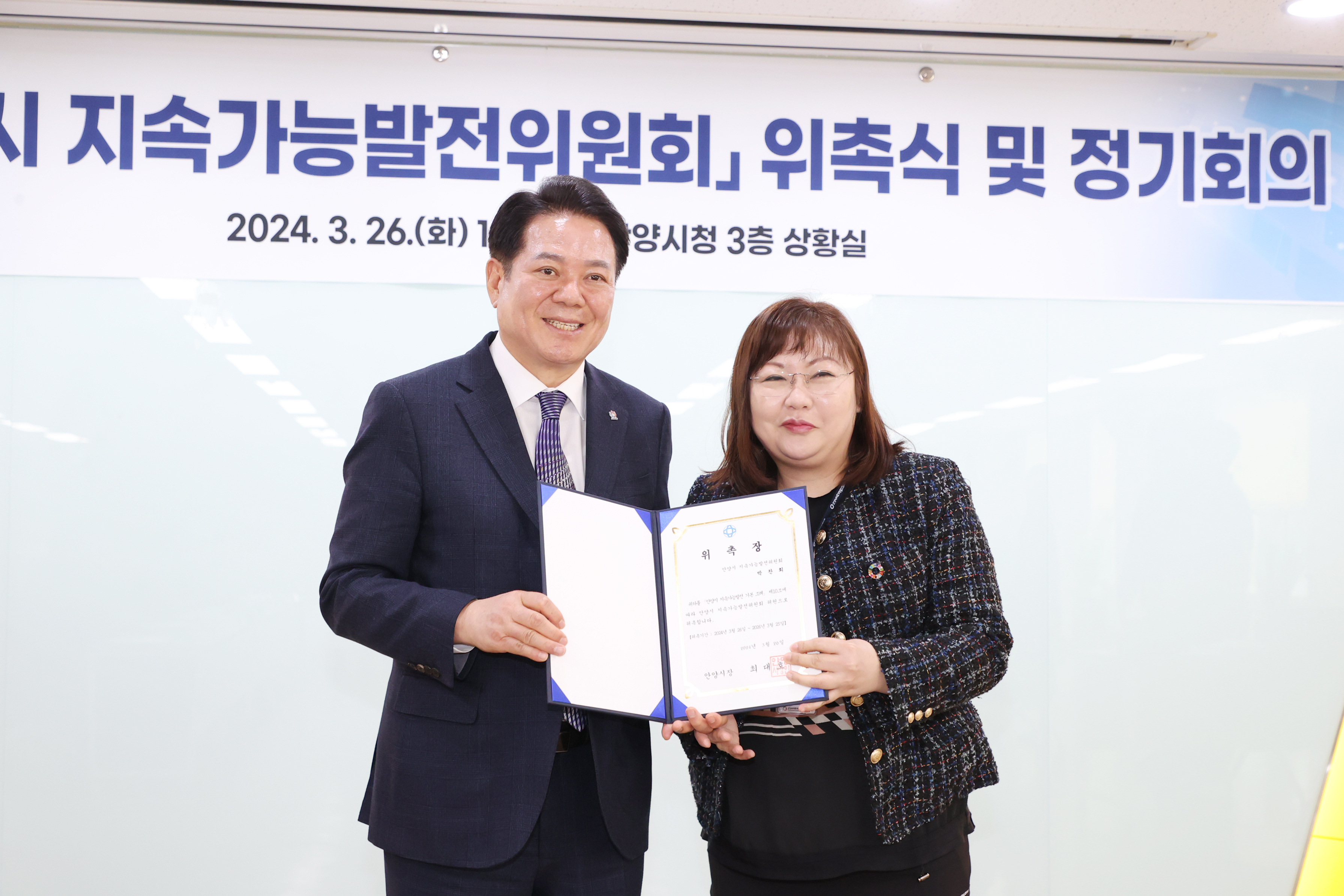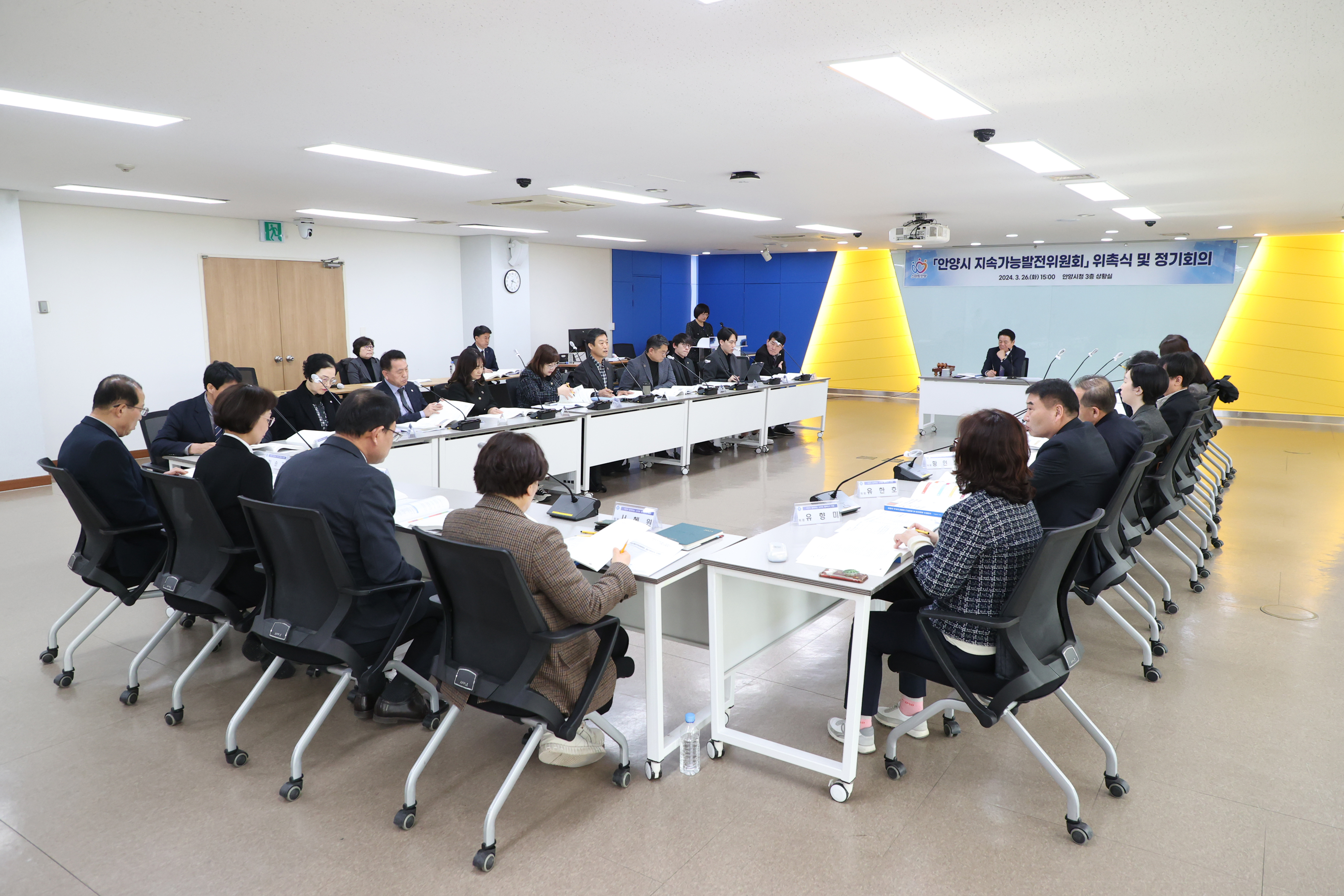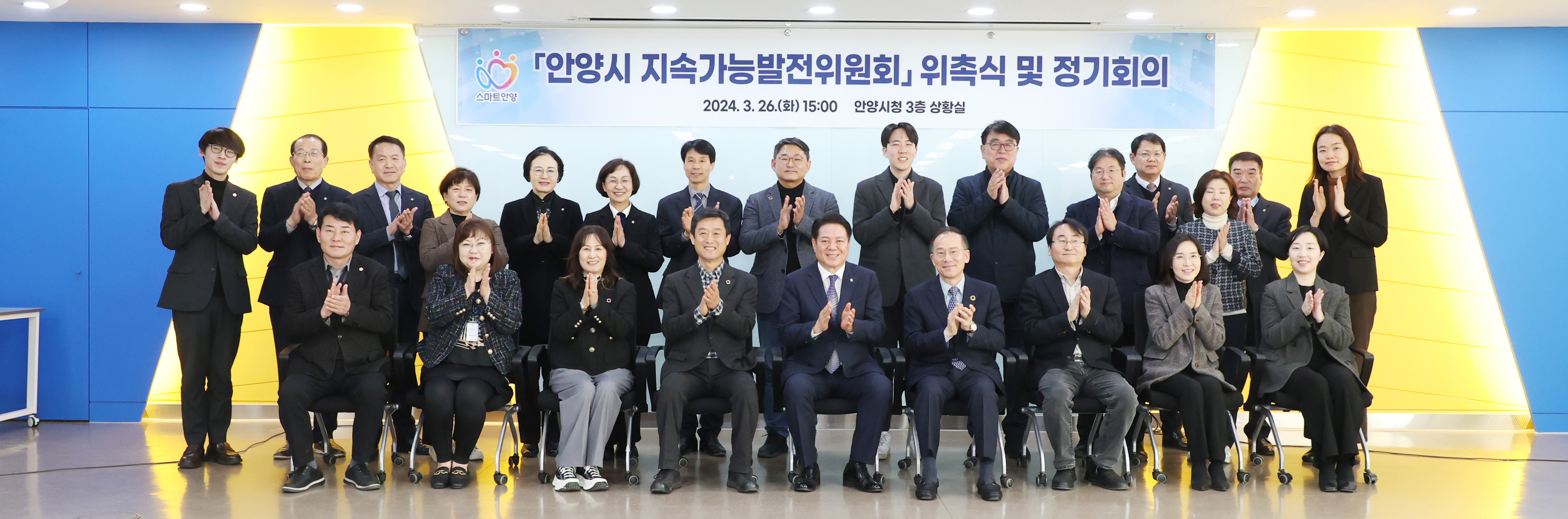 이날 오후 3시 안양시청 3층 상황실에서 열린 안양시 지속가능발전위원회 위촉식에서는 위원장인 최대호 안양시장을 비롯한 안양시 실·국·소·원장 등 당연직 위원 11명, 안양시의원과 민간위원을 포함한 위촉직 위원 15명이 위촉됐다.