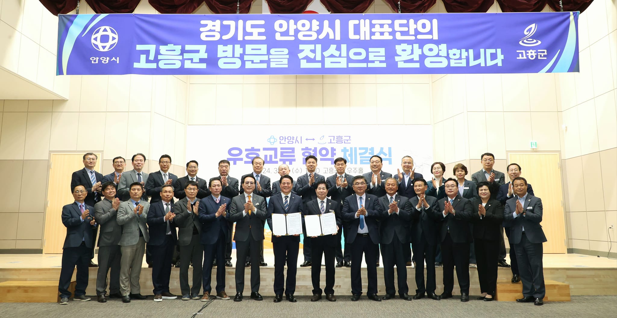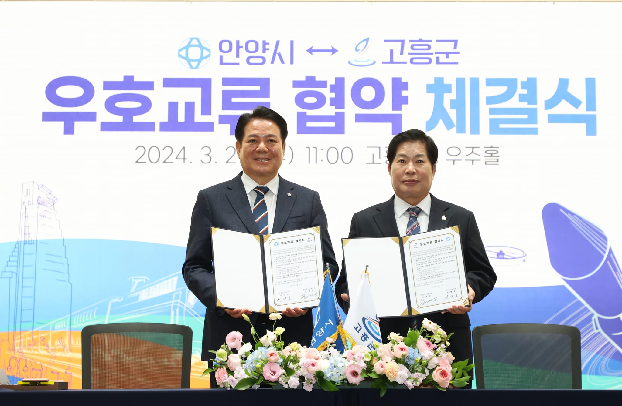 안양시와 고흥군은 지난 27일 전남 고흥군청 1층 우주홀에서 최대호 안양시장과 공영민 고흥군수가 양 지자체간 우호도시 협약을 체결하는 양해각서를 교환했다.