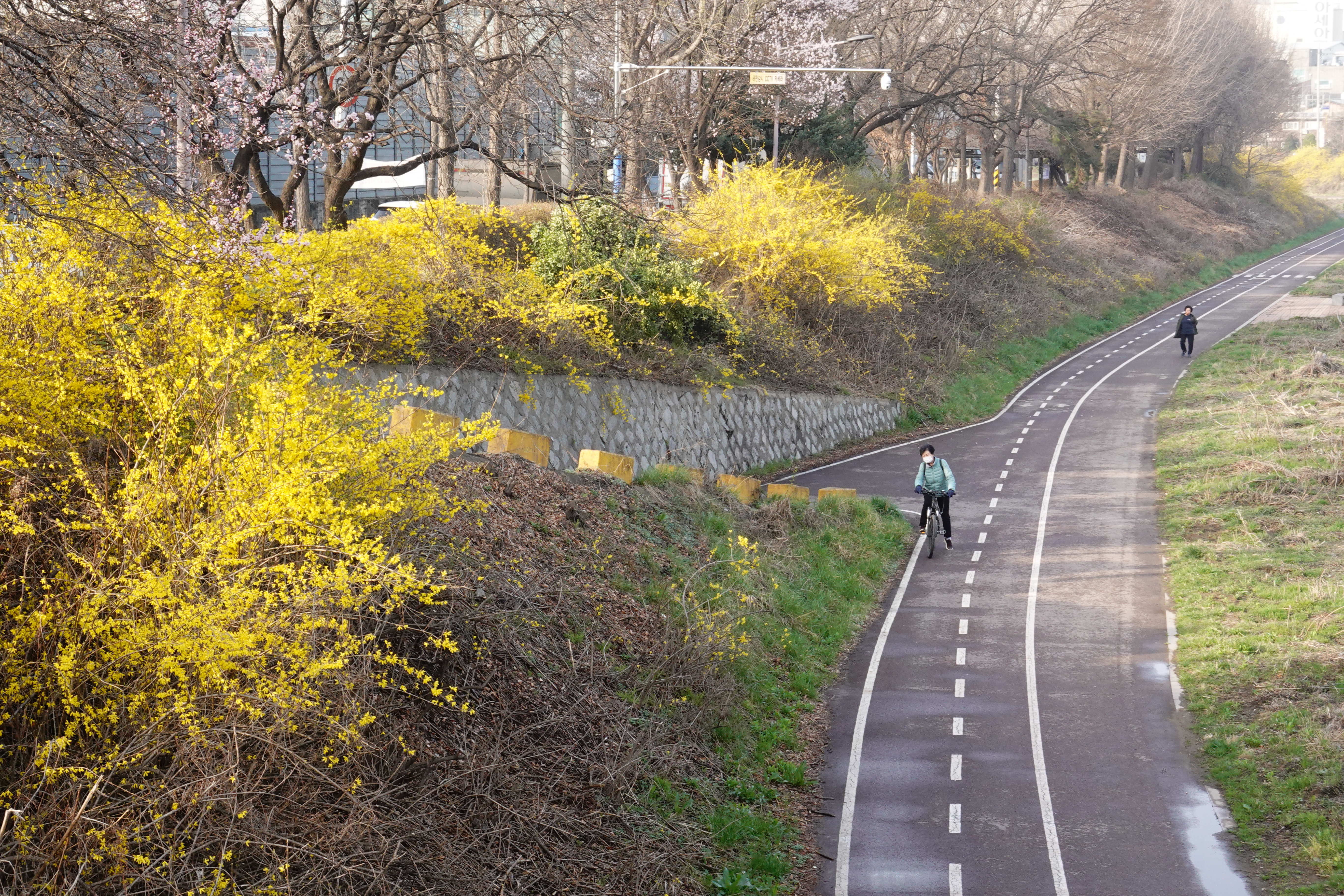 2023.03.29/ #도시기록 #개나리 #안양천 #노란물감/ 안양천 뚝방에 노란 개나리꽃 만발. 안양천 물에 비친 노란 개나리 물결은 마치 노란 물감을 풀어놓은듯 하다.