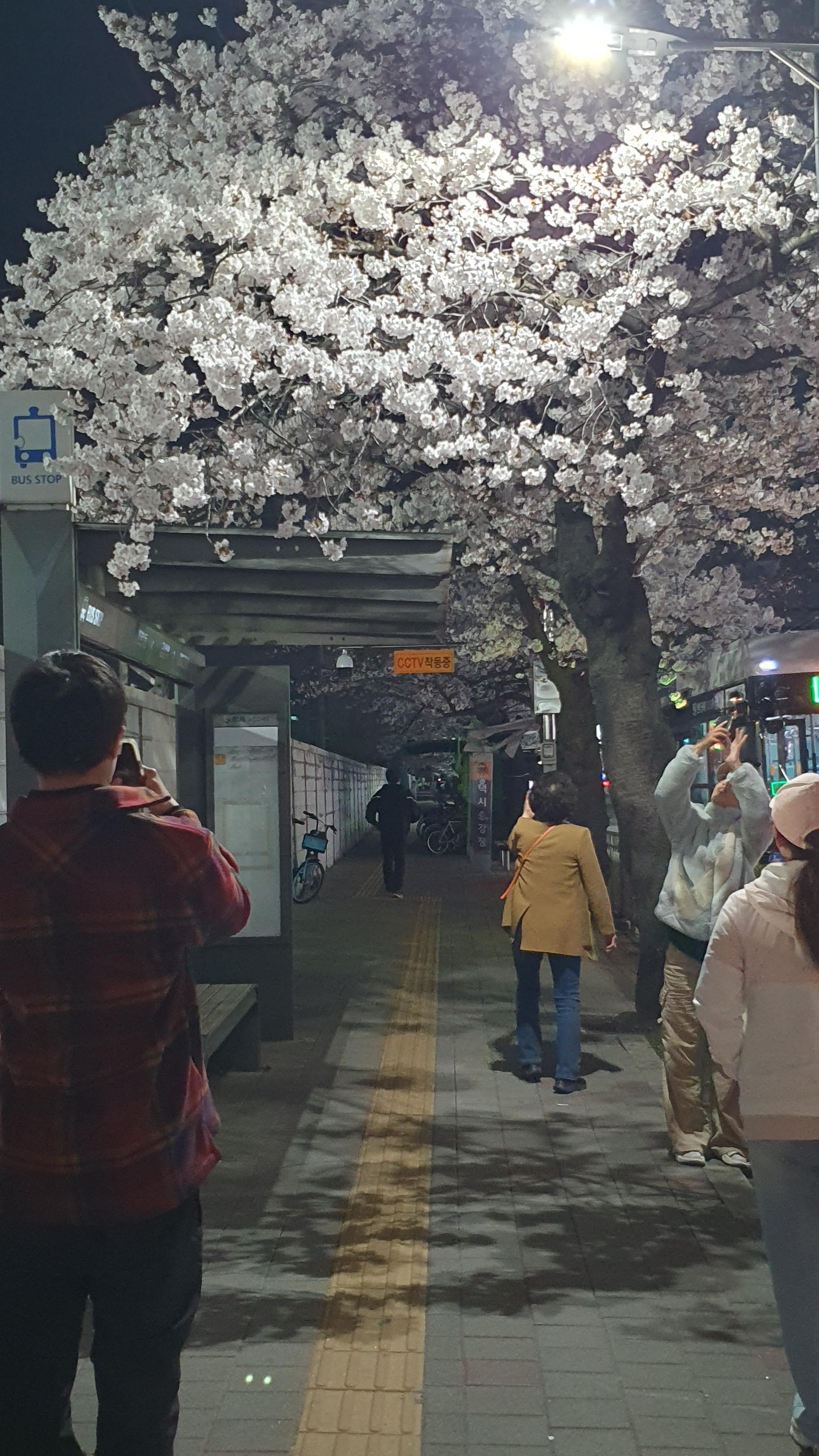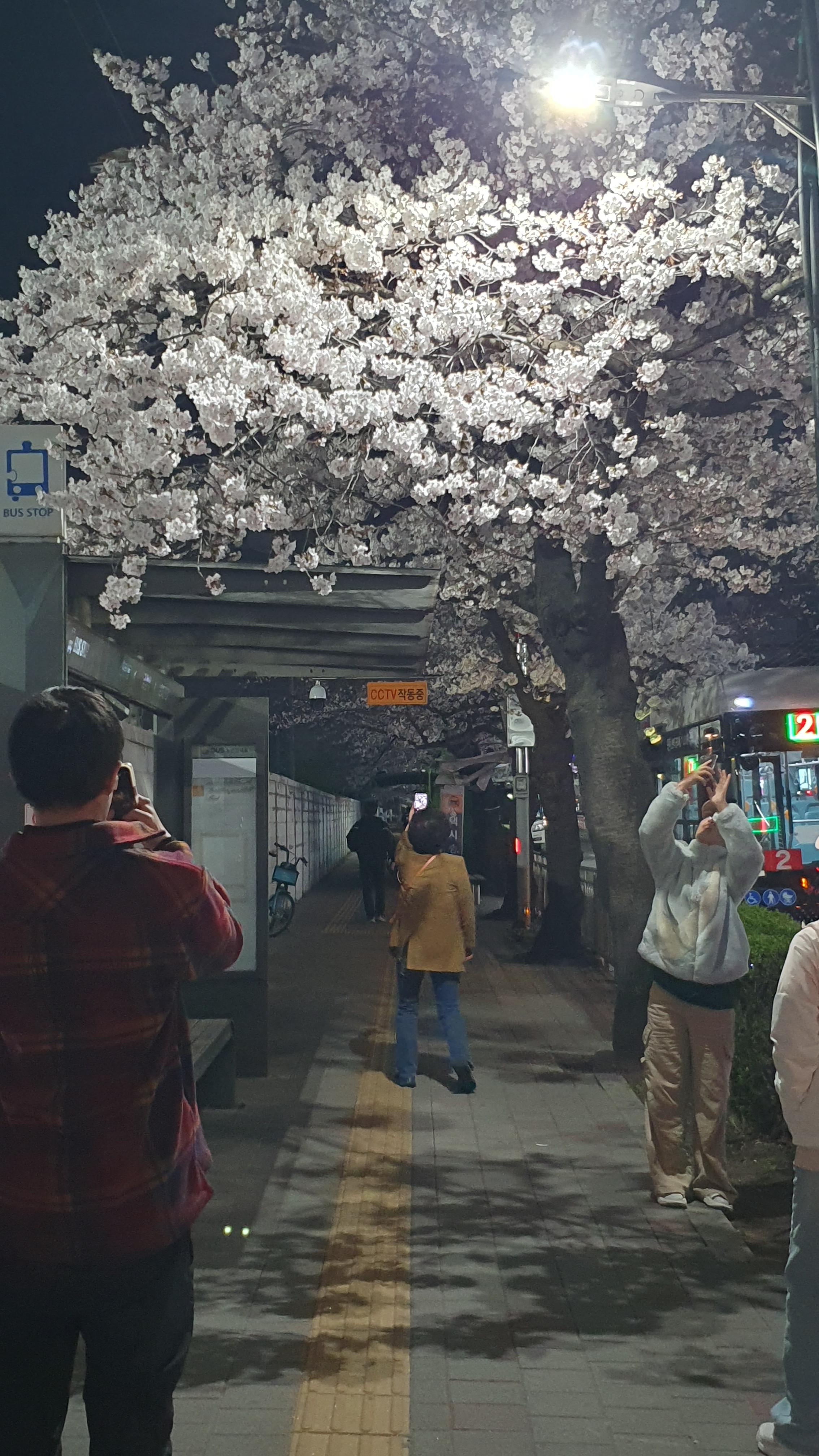 2024.04.02/ #도시기록 #군포 #벚꽃길/ 군포시 관내 벚곷 명소중 한곳인 금정역앞 벚꽃길. 벚꽃이 하얗게 만개했네요. 가로등 불바빛에 보이는 밤 풍경도 에쁘네요. 퇴근길 전철역을 나와 지나가던 시민들 핸드폰을 꺼내 여기저기서 사진 찍느라 바쁩니다.