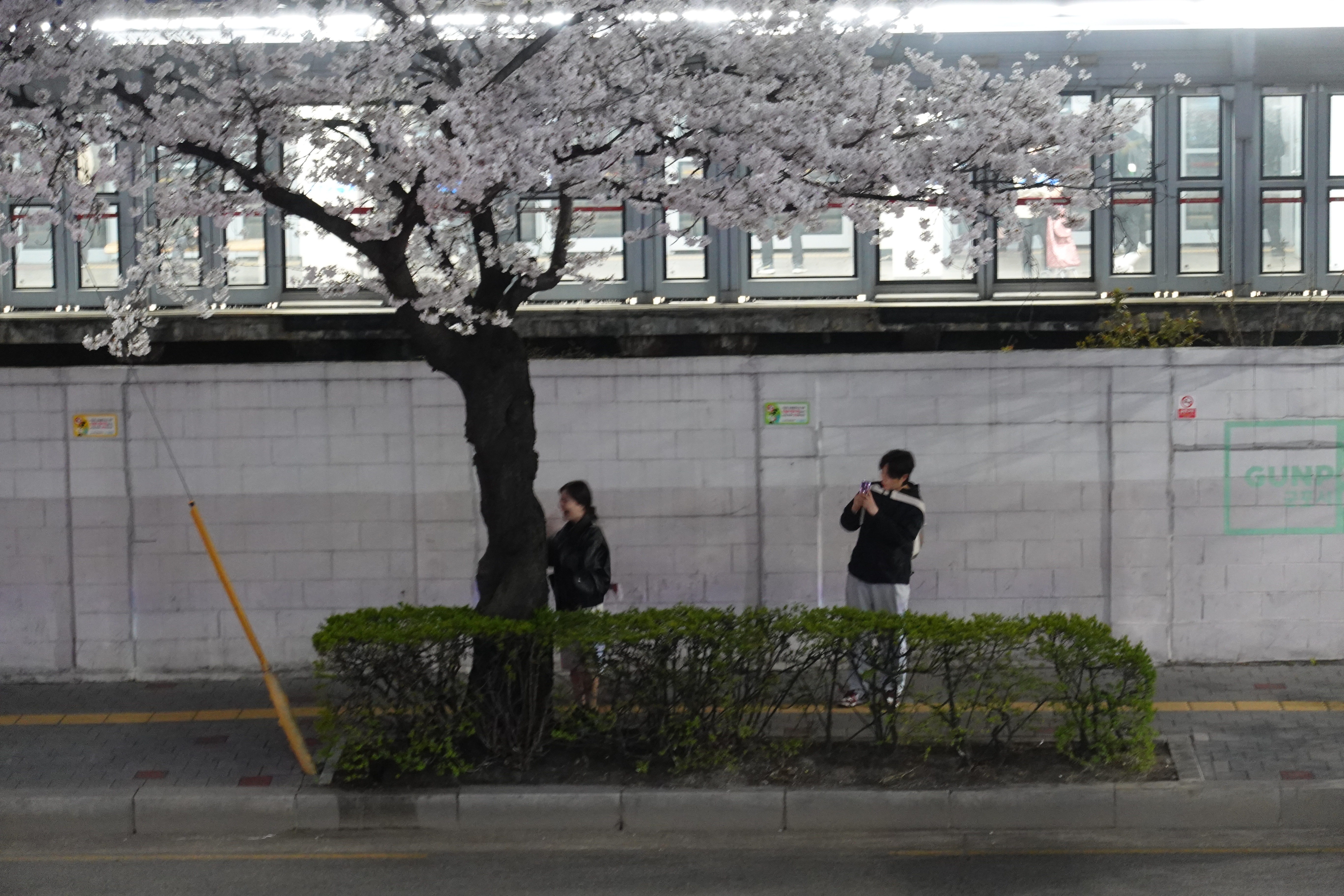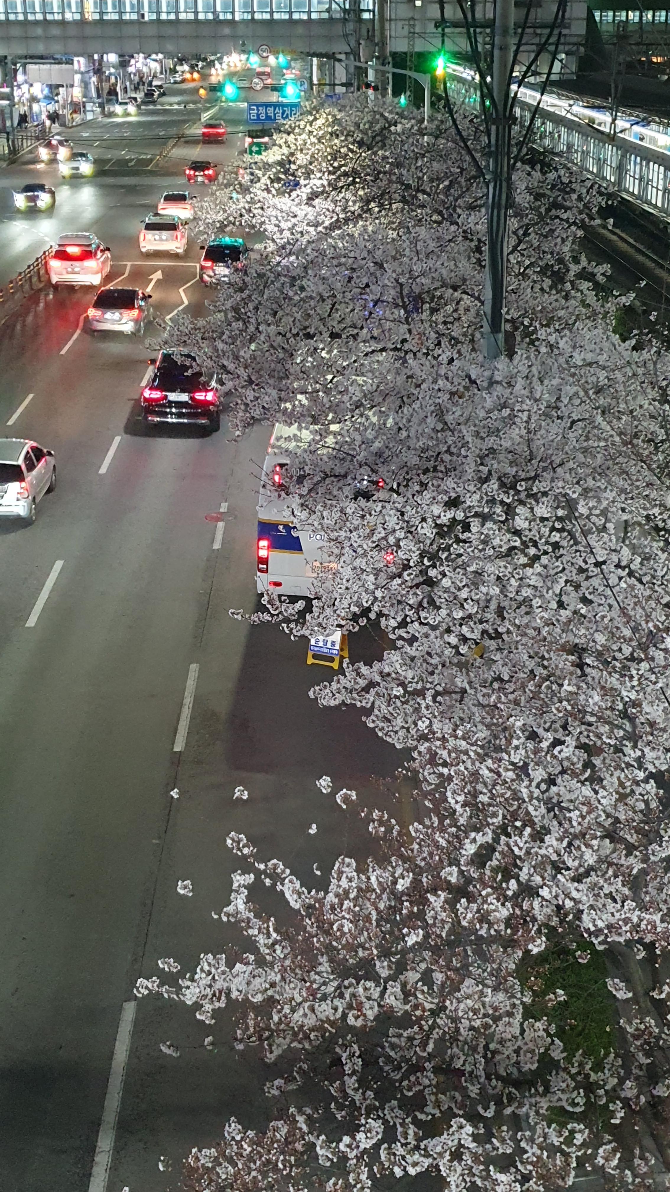 2024.04.02/ #도시기록 #군포 #벚꽃길/ 군포시 관내 벚곷 명소중 한곳인 금정역앞 벚꽃길. 벚꽃이 하얗게 만개했네요. 가로등 불바빛에 보이는 밤 풍경도 에쁘네요. 퇴근길 전철역을 나와 지나가던 시민들 핸드폰을 꺼내 여기저기서 사진 찍느라 바쁩니다.