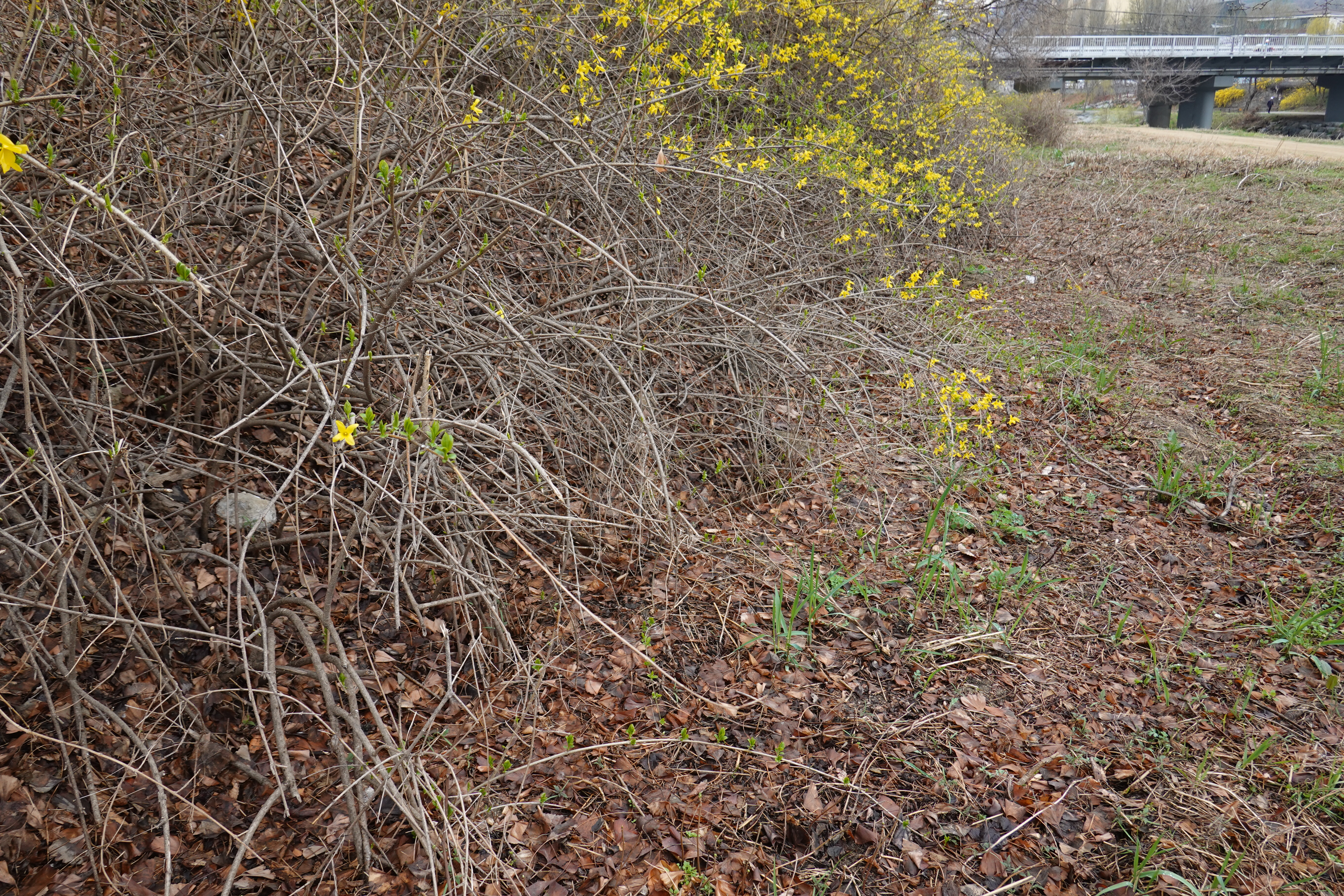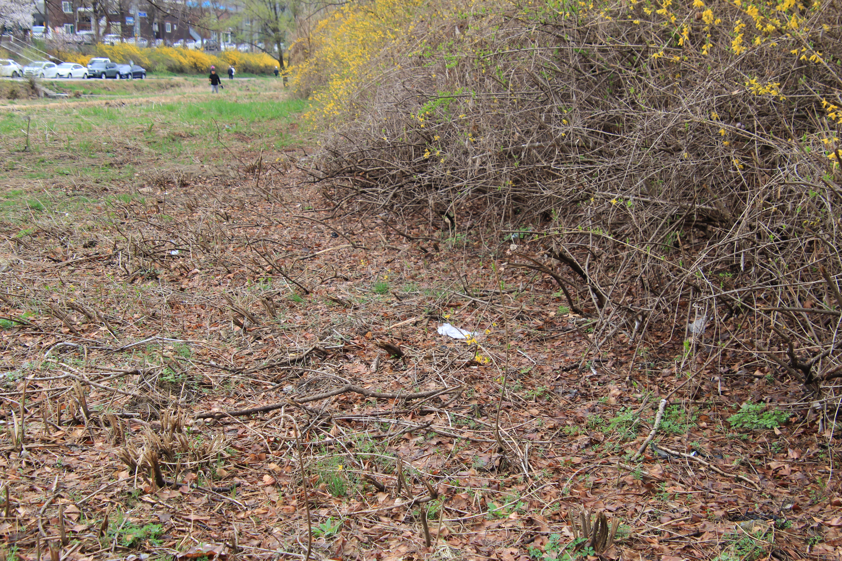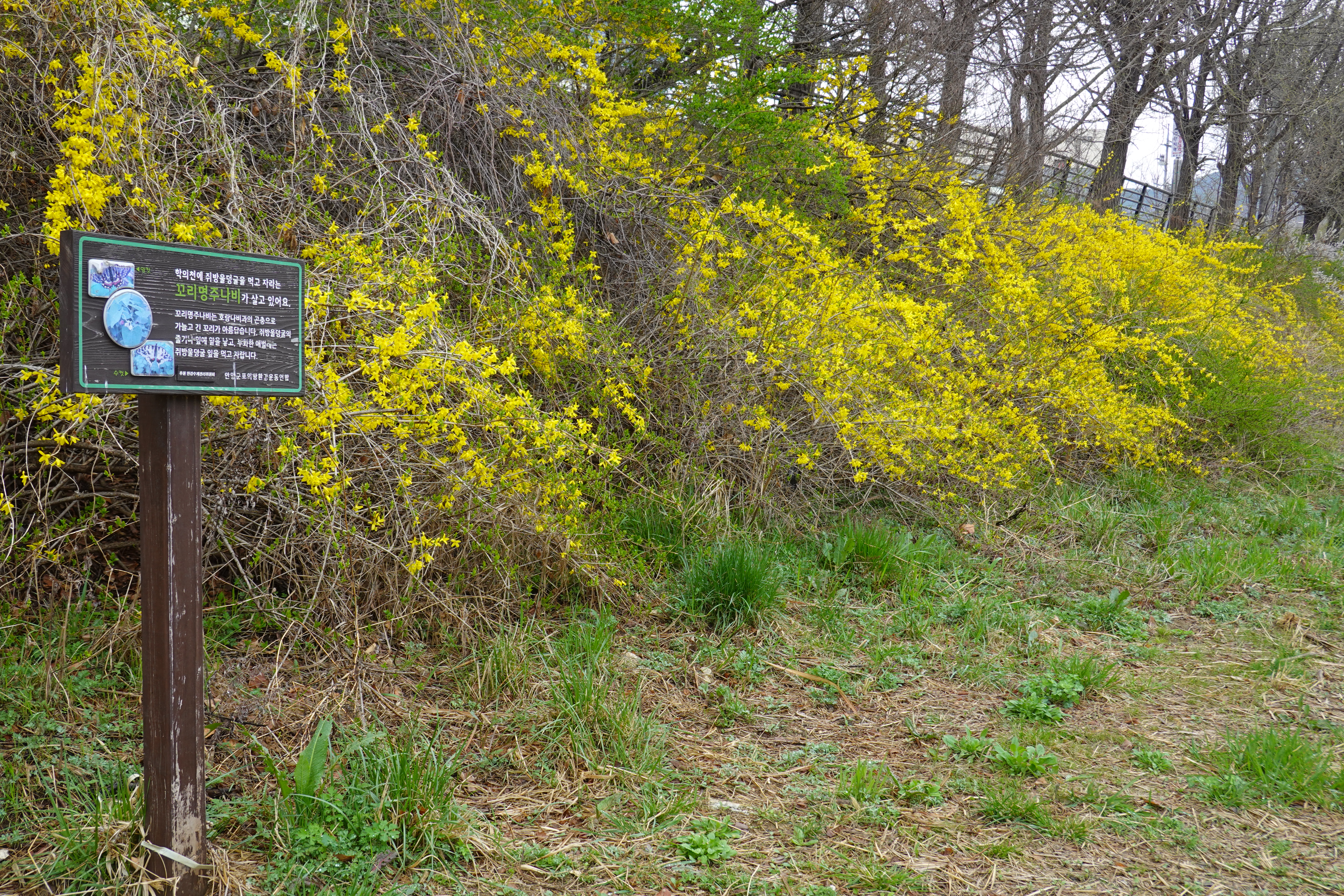 2024.04.03/ #도시기록 #개나리 #안양 #학의천/ 안양시 상징꽃(시화) 개나리 군락지가 학의천에서도 무참히 뜯기고, 찟기고, 베어지고, 잘려지는 등 훼손된 모습을 발견하다. 발견 구간은 안양 관양동 인덕원교에서 관양교 구간까지 학의천 남쪽 제방 사변과 둔치로 둔치와 제방에 있는 덤불을 제거하면서 훼손시킨 것으로 추정된다. 이 과정에서 학의촌의 쥐방울덩굴 군락지 일부도 훼손됐다. 한마디로 생물다양성이 뭔지도 모르면서 찬변에 자라는것은 무조던 잡초라며 마구 베어버리니 안양시 상장으로 시민의 자긍심인 개나리도 없애버리고, 도심속 동식물 또한 오갈데 없이 내쫓기는 것이다. 덩달아 꼬리명주나비도 없어지고 있다. 쥐방울덩굴은 꼬리명주나비 애벌레의 먹이사슬이라는 점에서 이곳 군락지는 안양시와 안양시만이 소중히 보호하고 후새에 보전시켜야 할 자산이다. 꼬리명주나비는 세계자연보전연맹에 의해 멸종위기 보호종으로 지정된 호랑나빗과 곤충으로 국접(國蝶), 즉 우리나라의 나비로 지정될 뻔했던 나비다.