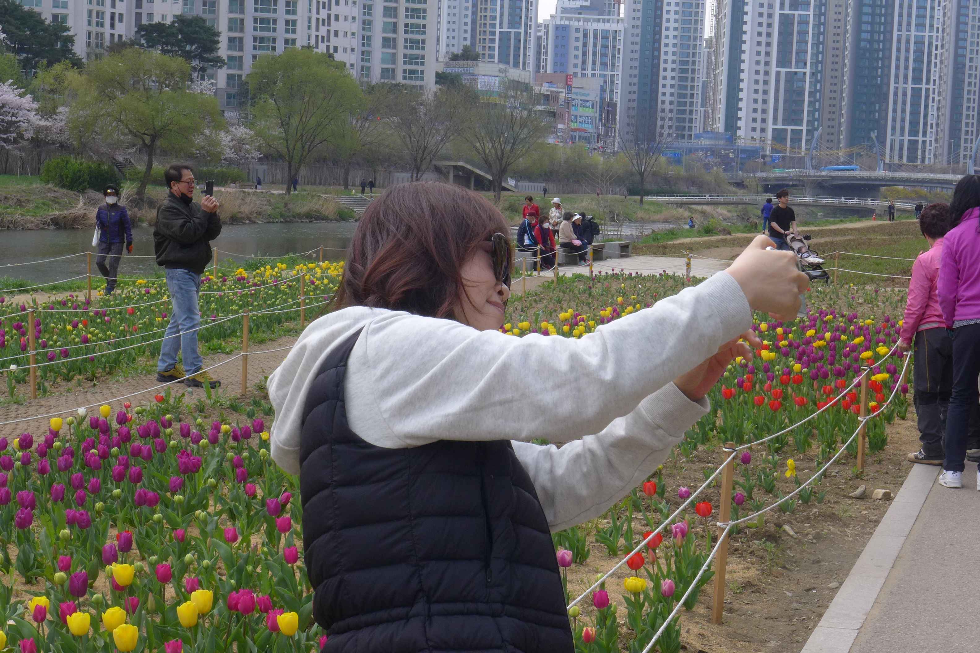 2024.04.04/ #도시기록 #안양 #안양천 #쌍개울둔치 #꽃밭/ 안양천 쌍개울 둔치에 조성한 튜울립 꽃밭. 안양천의 국가정원을 추진하는 안양시가 시작한 지방정원 사업의 하나로 보인다. 일단 보기에 예뻐서 사진 찍으면서 좋아하는 시민들도 있지만 생태하천은 커녕 점점 조경하천으로 변하는 모습에 걱정과 우려 목소리도 적지않다. 여름철 큰물 한번 지나가면 싸그리 쓸려 버릴텐데...
