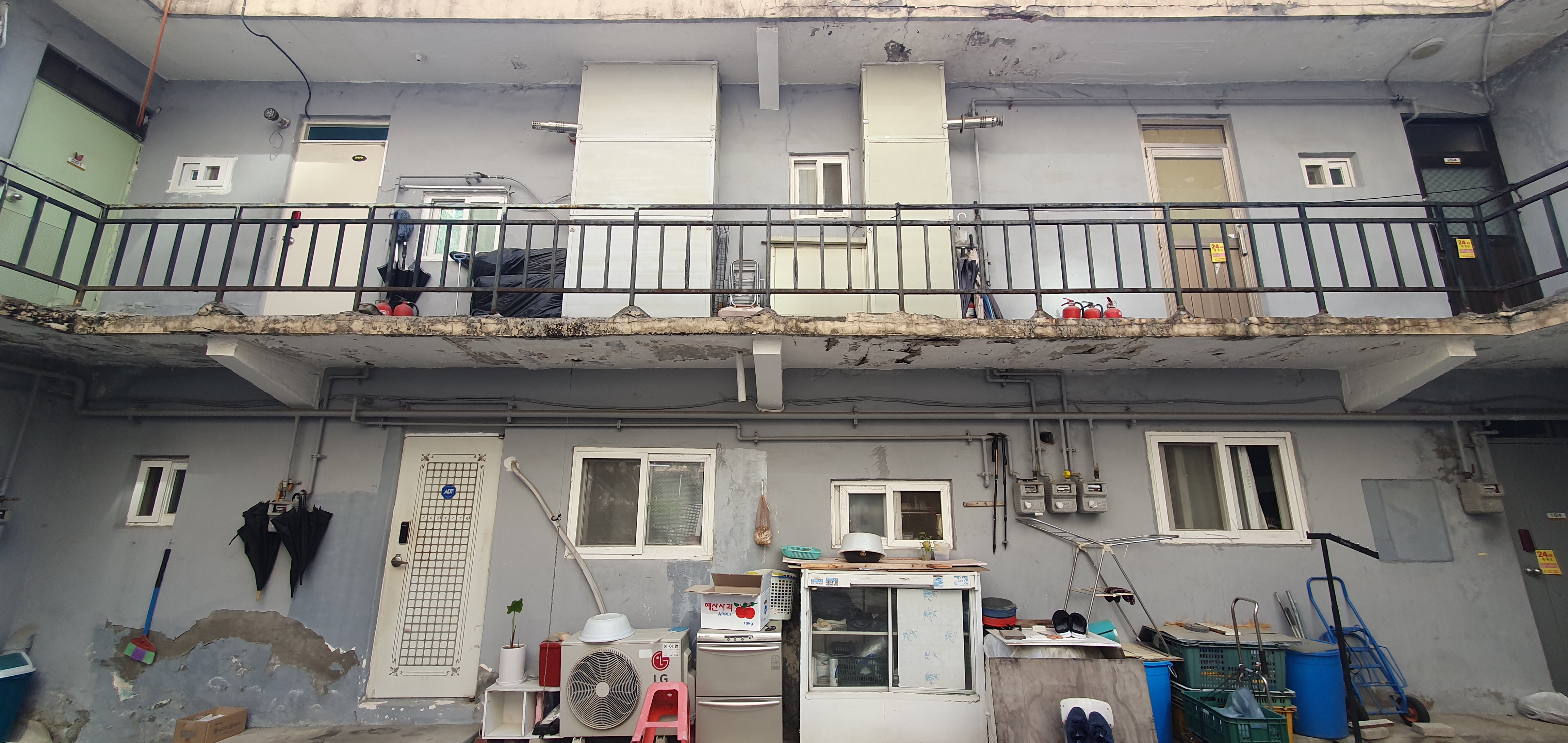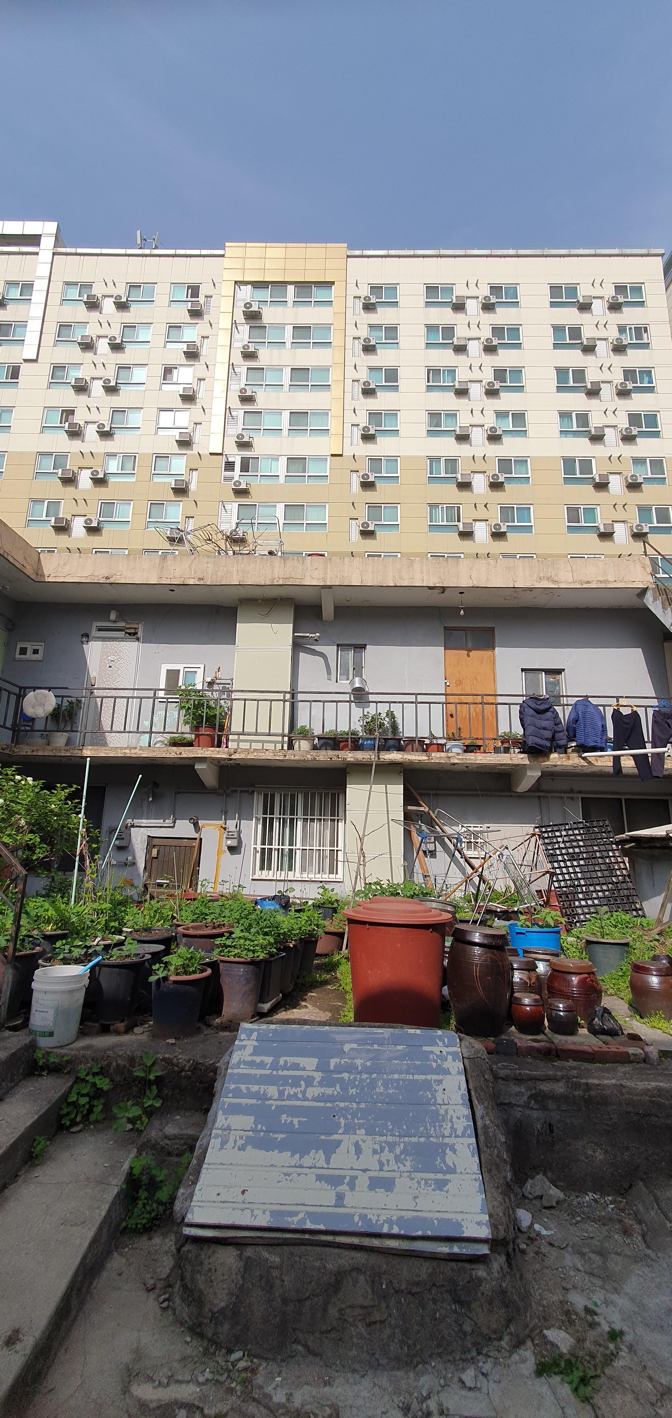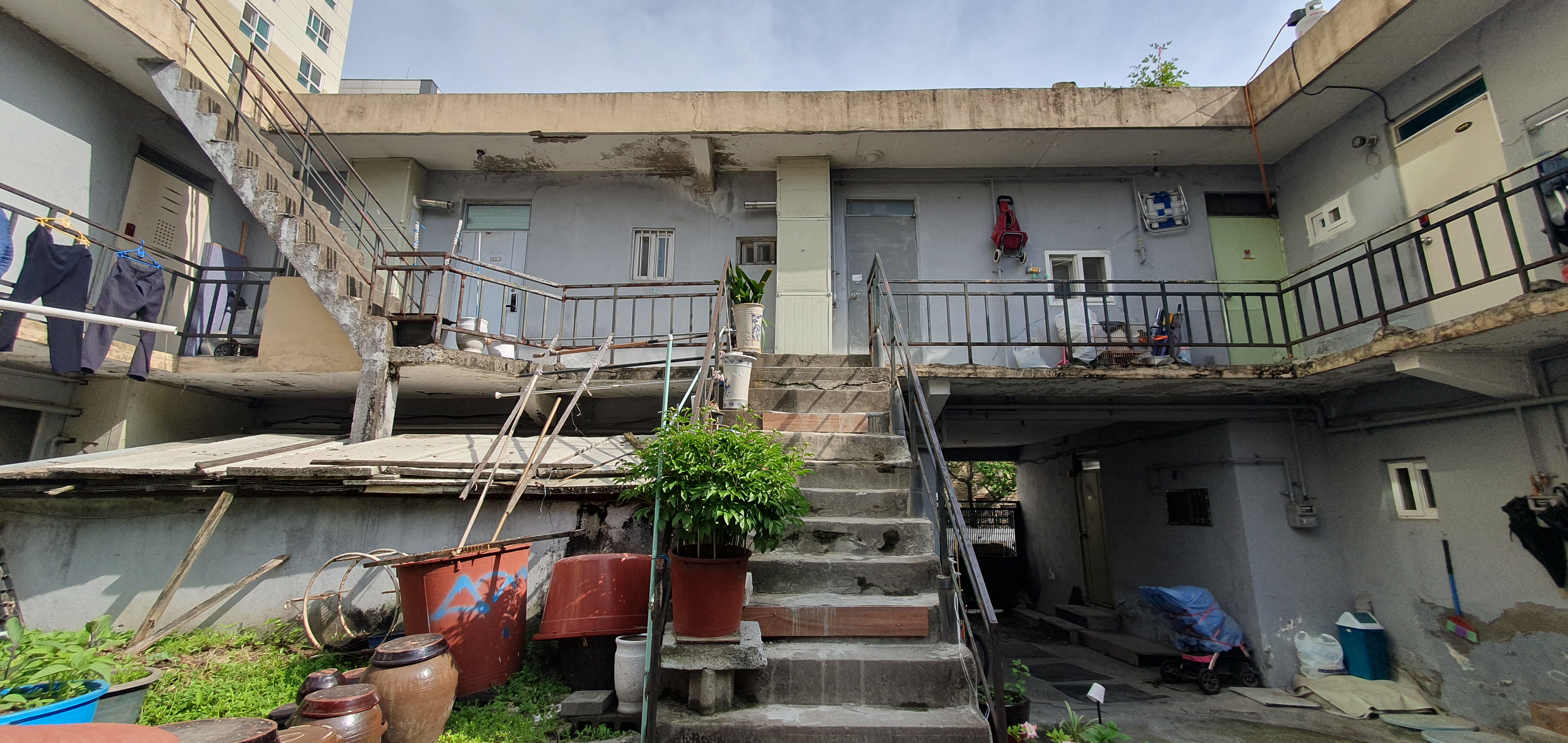 2024.04..26/ #도시기록 #안양 #동네 #골목 #안양6동 #이화연립/ 안양6동에 있는 미음자주택에 오랫만에 들려보다. 안양6동 변전소 가는 도로에서 좁은 골목길로 접어들면 중정(마당)이 있는 오래된 공동주택(안양6동 수리산로 28번길 10) 하나가 시선을 끌 정도로 매력적이다, 이 건물의 명칭은 이화연립으로 1978년 지어져 세월만큼이나 노후화되고 낡아 지난 1993년 정부(당시 내무부가 1993년 1월15일부터 4월15일까지 전국의 건물 9천1백14개소 2만8천2백46채에 대해 안전점검 실시)의 건물 안전진단 결과 재건축진단을 받았다. 하지만 외형적으로 보이는 낡음과 안전문제와는 별도로 건물안에 들어서면 요즈음에는 보기 드문 공동체 지향적 건축물이라는 점에서 볼수록 정감이 가는 공동주택으로 영화나 드라마 촬영 장소로 이용되기도 한다.