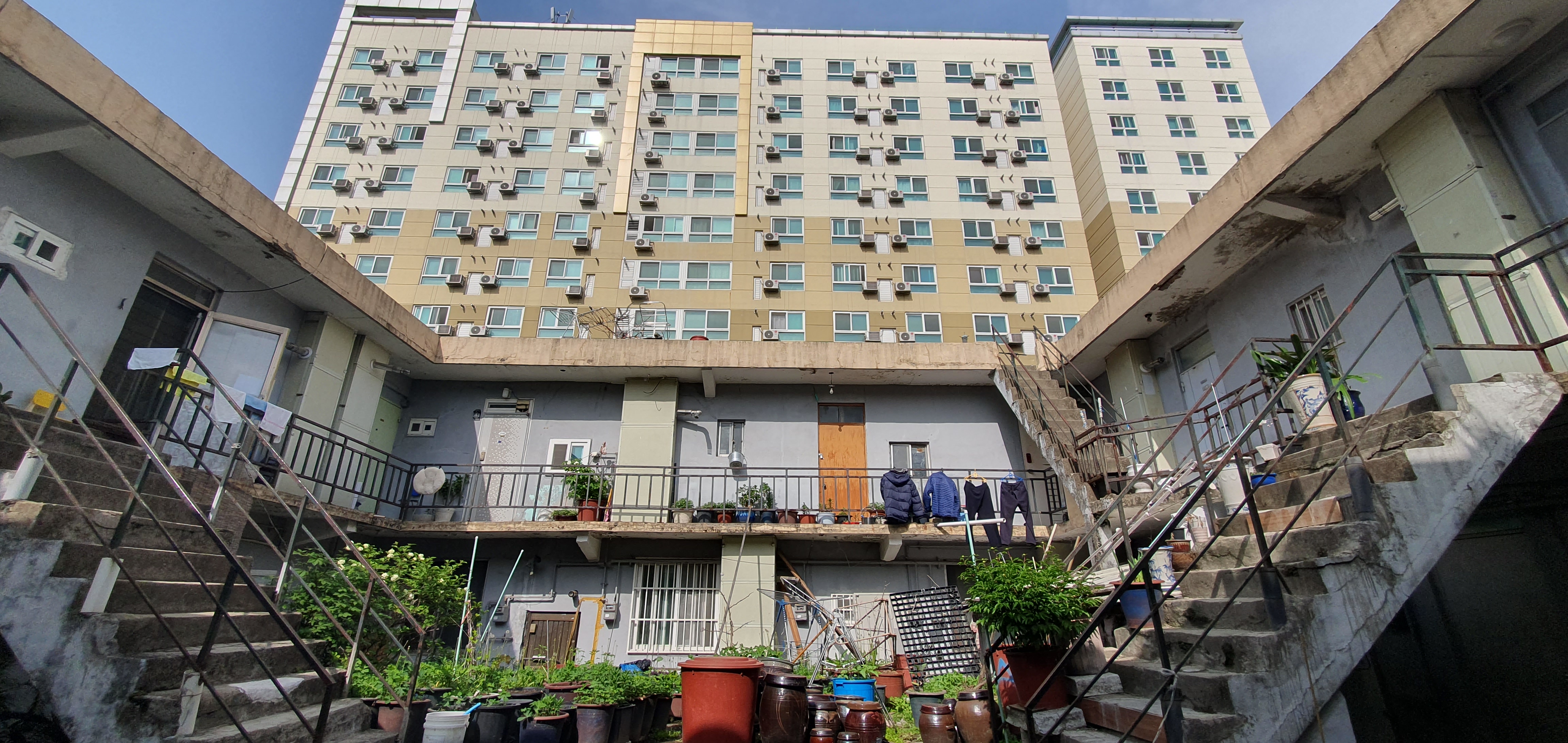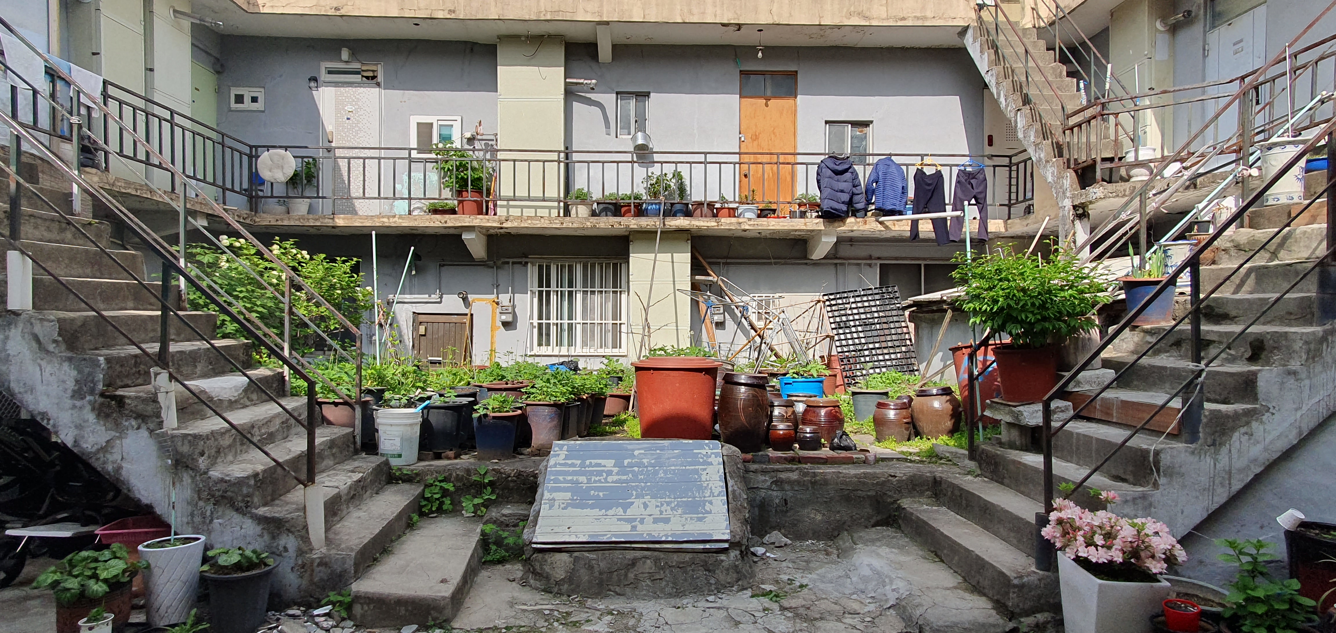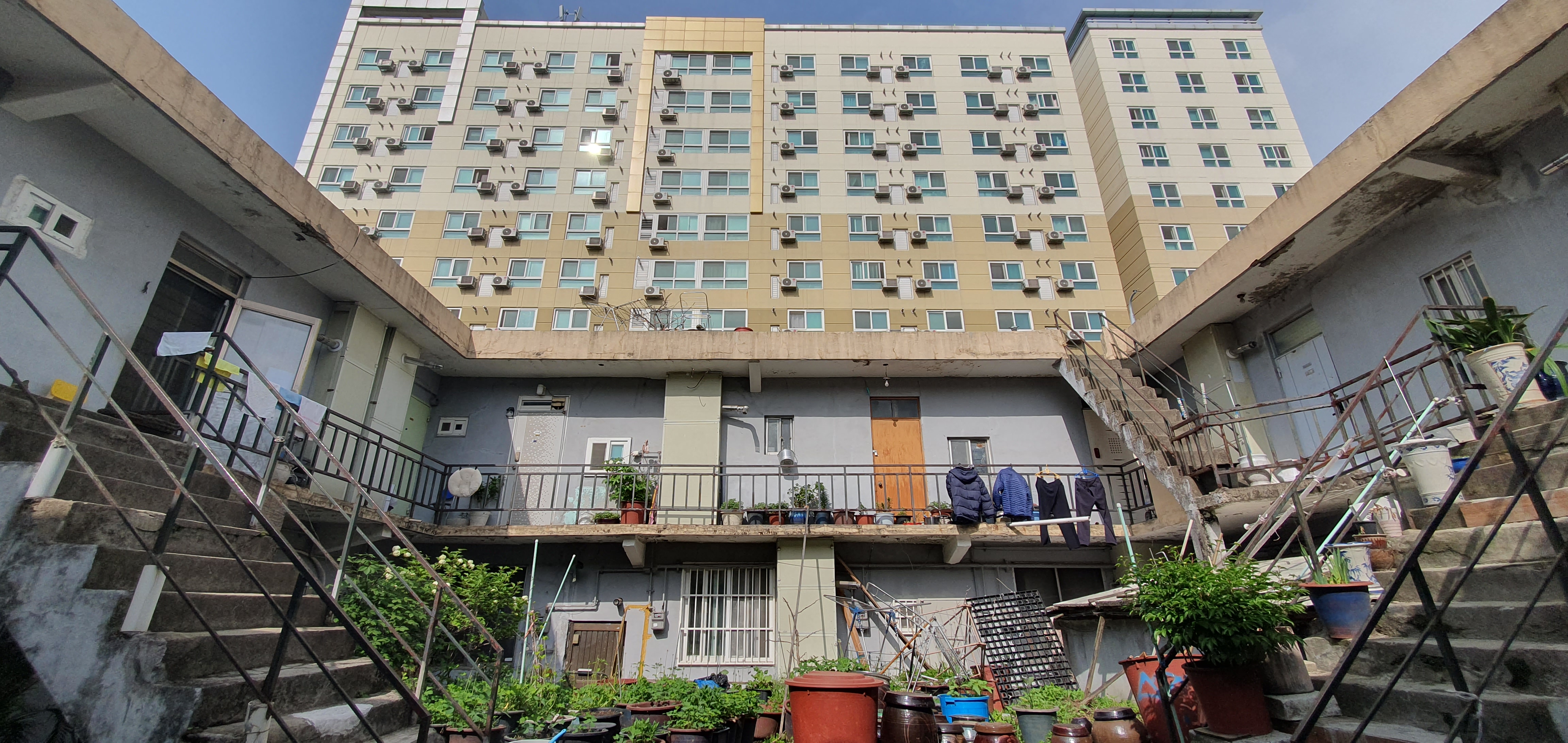 2024.04..26/ #도시기록 #안양 #동네 #골목 #안양6동 #이화연립/ 안양6동에 있는 미음자주택에 오랫만에 들려보다. 안양6동 변전소 가는 도로에서 좁은 골목길로 접어들면 중정(마당)이 있는 오래된 공동주택(안양6동 수리산로 28번길 10) 하나가 시선을 끌 정도로 매력적이다, 이 건물의 명칭은 이화연립으로 1978년 지어져 세월만큼이나 노후화되고 낡아 지난 1993년 정부(당시 내무부가 1993년 1월15일부터 4월15일까지 전국의 건물 9천1백14개소 2만8천2백46채에 대해 안전점검 실시)의 건물 안전진단 결과 재건축진단을 받았다. 하지만 외형적으로 보이는 낡음과 안전문제와는 별도로 건물안에 들어서면 요즈음에는 보기 드문 공동체 지향적 건축물이라는 점에서 볼수록 정감이 가는 공동주택으로 영화나 드라마 촬영 장소로 이용되기도 한다.