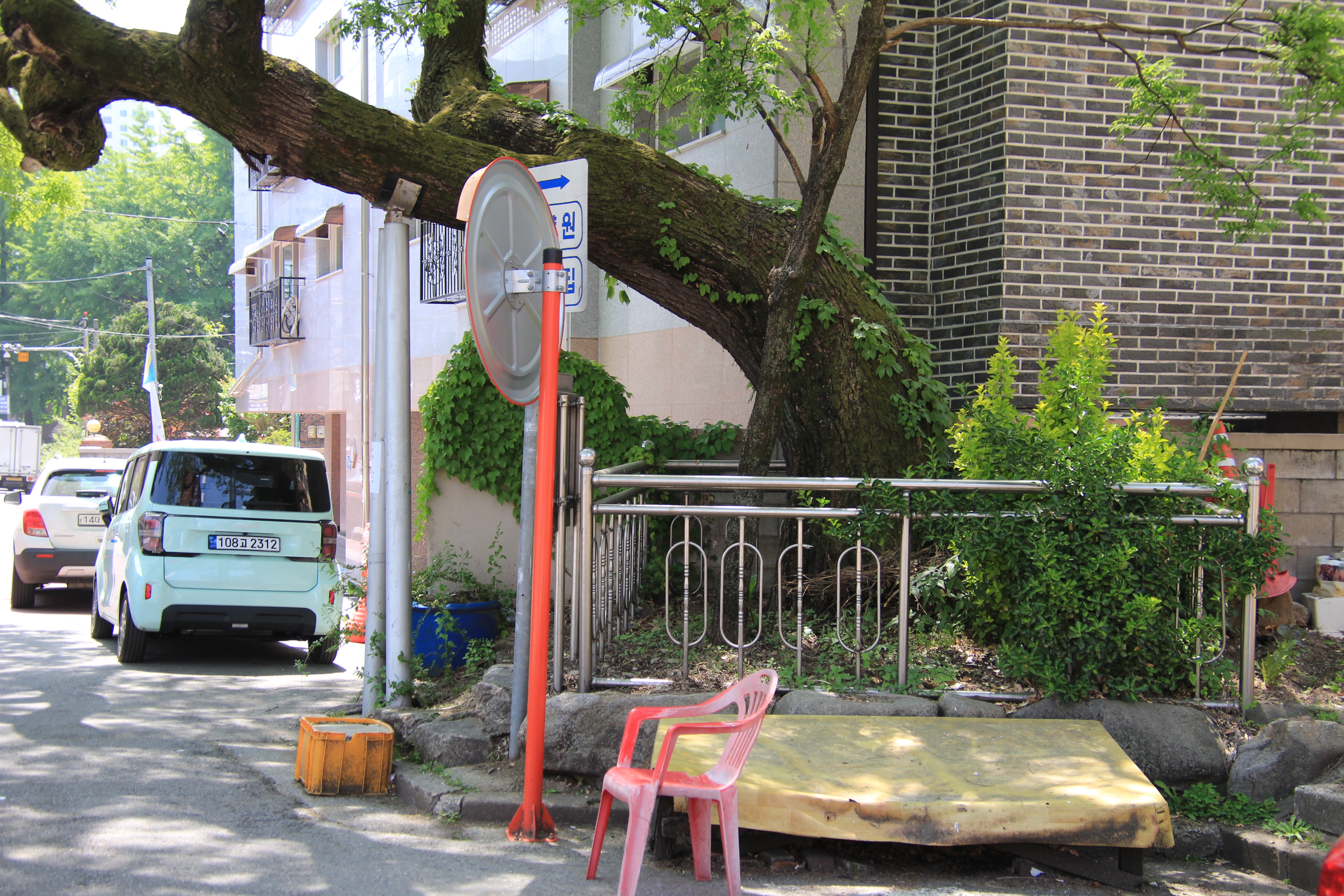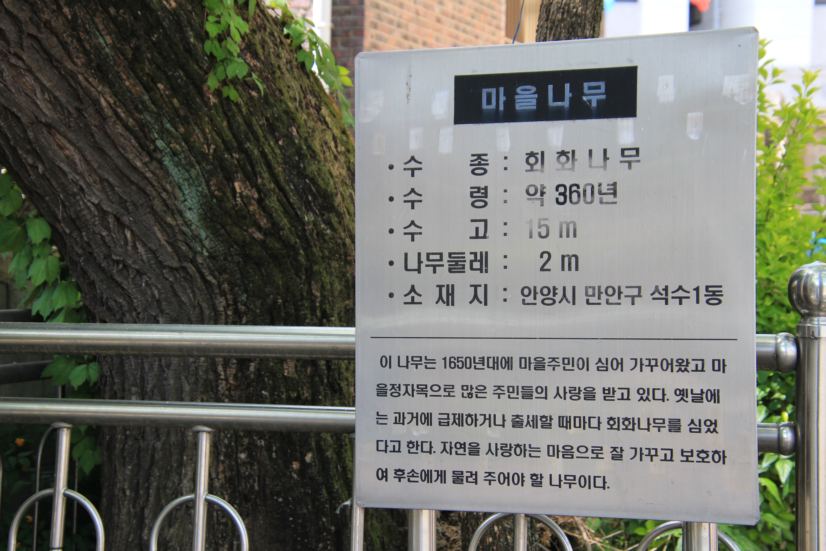 2024.05.03/ #도시기록 #안양 #회화나무 #동네 #골목 #미래유산 #안양예술공원 / 안양시 만안구 석수1동 안양박물관 후문앞에 자리한 회화나무. 표지판에는 수령 약 380년이라 적혀 있지만 동네주민 말로는 400년이 훌쩍 넘었다고 한다. 이 나무의 높이는 15m, 나무의 둘레는 2m로 1850년대에 마을주민이 심어 가꾸어 왔고, 마을정자목으로 20년전까지만 해도 제를 지낼 정도로 주민들의 사랑을 받았으나 동네 주민은 안양시가 보호수로 지정해 보호 및 관리대책을 마련했으면 싶다고 말하지만 정작 주민들이 버리는 쓰레기와 나무앞에는 불법주차로 몸살을 앓고 있다. 시나 구청, 동 주민자치센터, 지역시의원이 관심을 갖지 않는다면 주민 스스로가 주민참여에산제 등을 통해 나무아래 주민과 나그네가 잠시나마 쉬어갈수 있는 벤치, 침상등을 설치히는 등 깔끔하게 정비히면 어떨까. 지나칠때 마다 나무에게 미안스럽다.