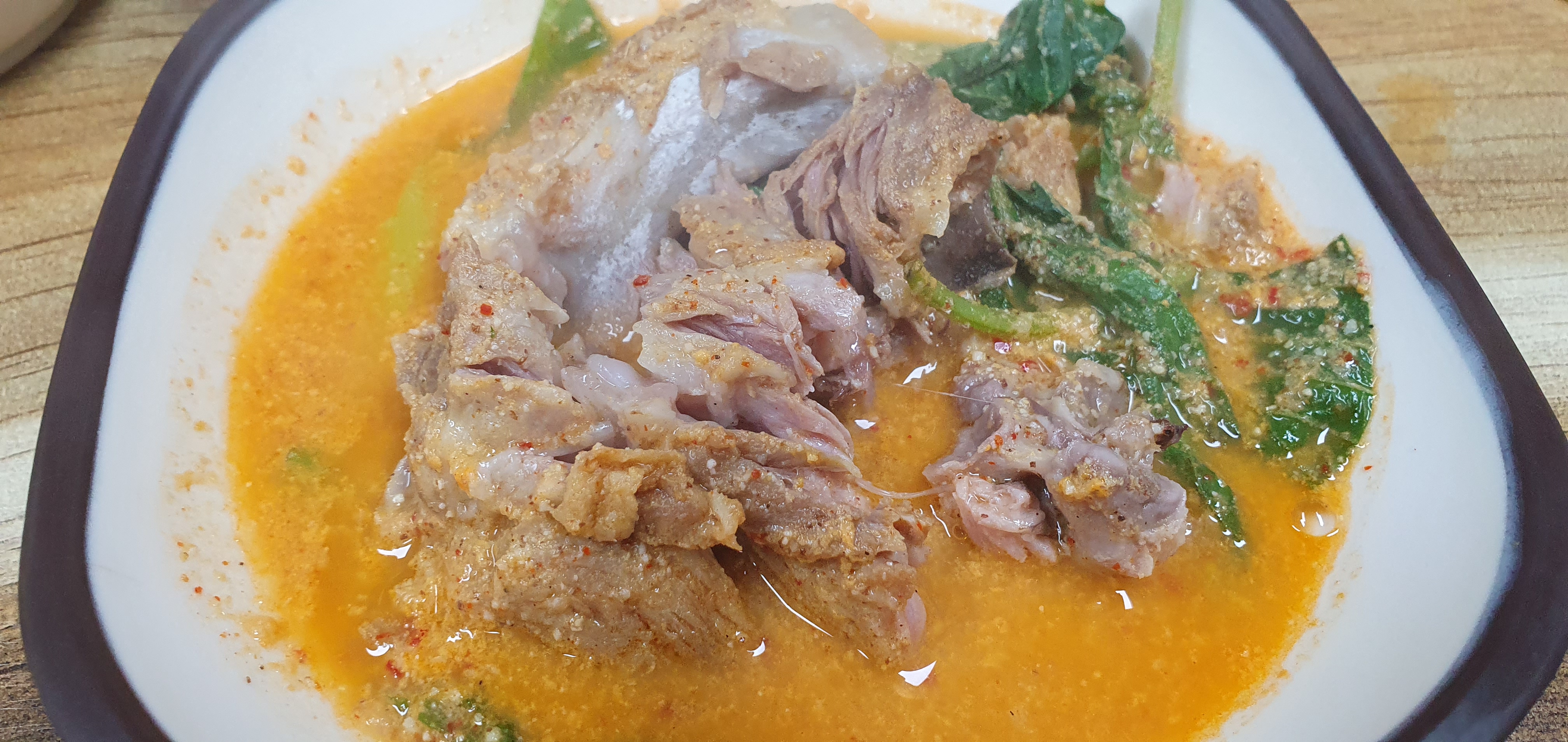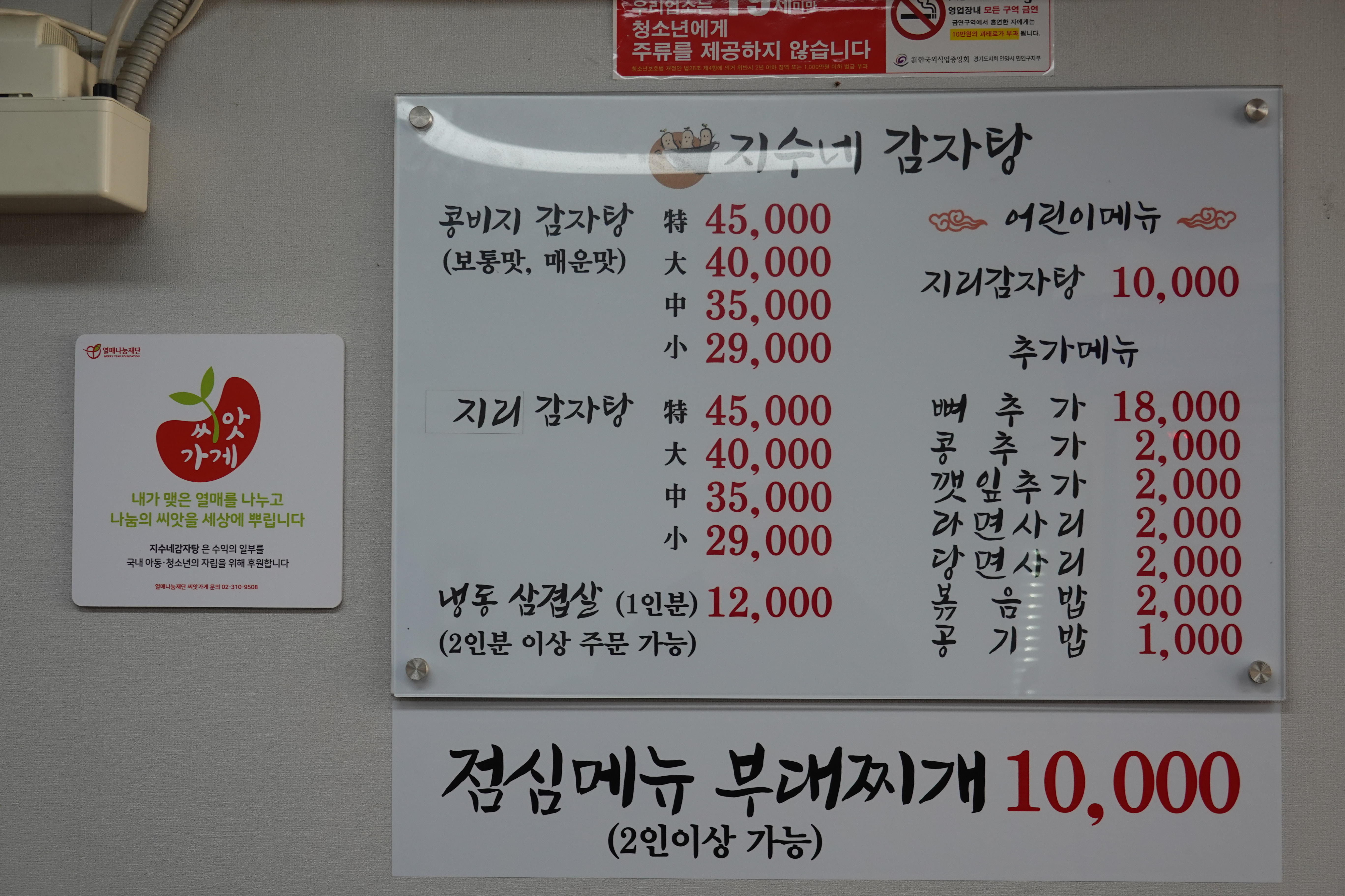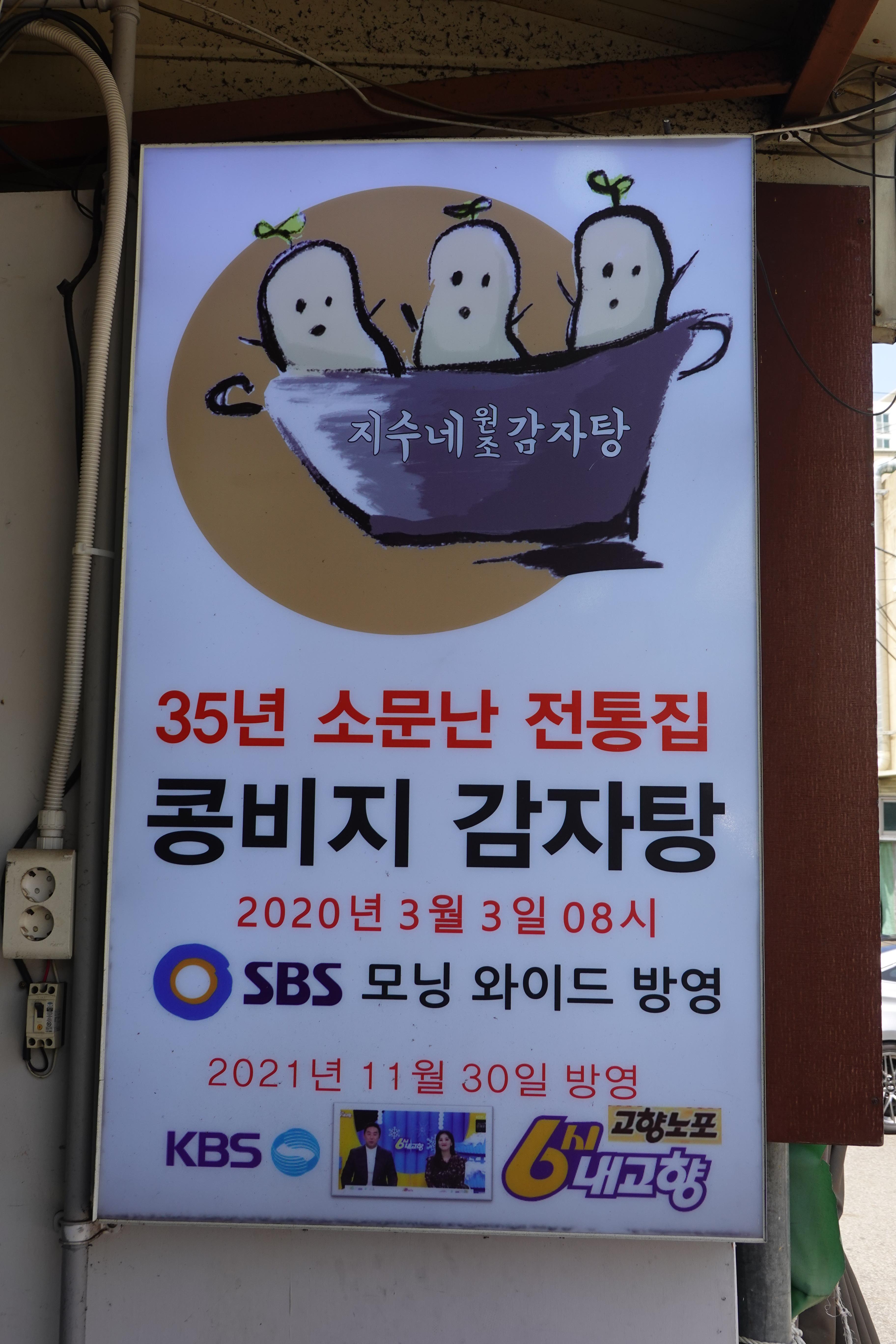등갈비에 콩비지(국산콩을 갈은것)를 넣은 감자탕. 깨끗, 깔끔한맛에 고기의 잡내도 거의없고 아주 깊고 풍부한 맛으로 안양 최고의 감자탕으로 입소문난 집. 가격 대비 양과 질, 맛이 좋아 단골들이 인생 감자탕집이라 칭찬한다. 묵은지와 향기로운 깻잎, 등갈비뼈와 국산콩을 갈은 콩물이 들어가 매콤, 칼칼, 구수, 시원한 국물이 그야말로 술안주뿐 아니라 식사하기에도 좋다.