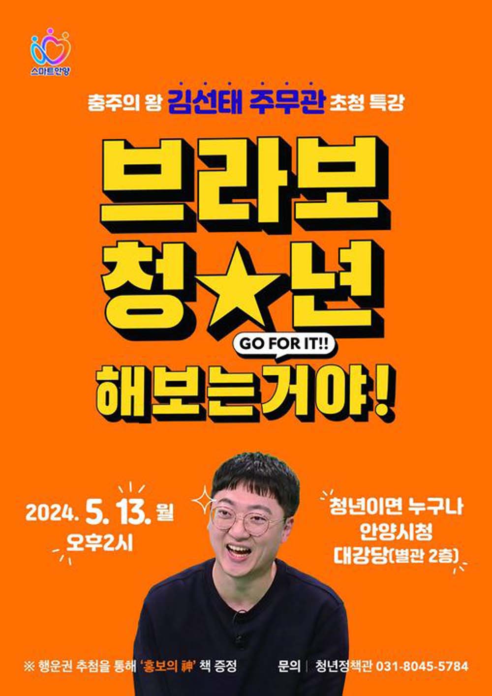 우리나라 공무원중 가장 많은 유튜브 구독자(현재 71만 6천여명)를 보유하고 있는 충주시청 충 TV 김선태 주무관이 오는 13일 오후2시 안양시청을 찾아 특강(브라보청년 해보는거야!!)을 한다.