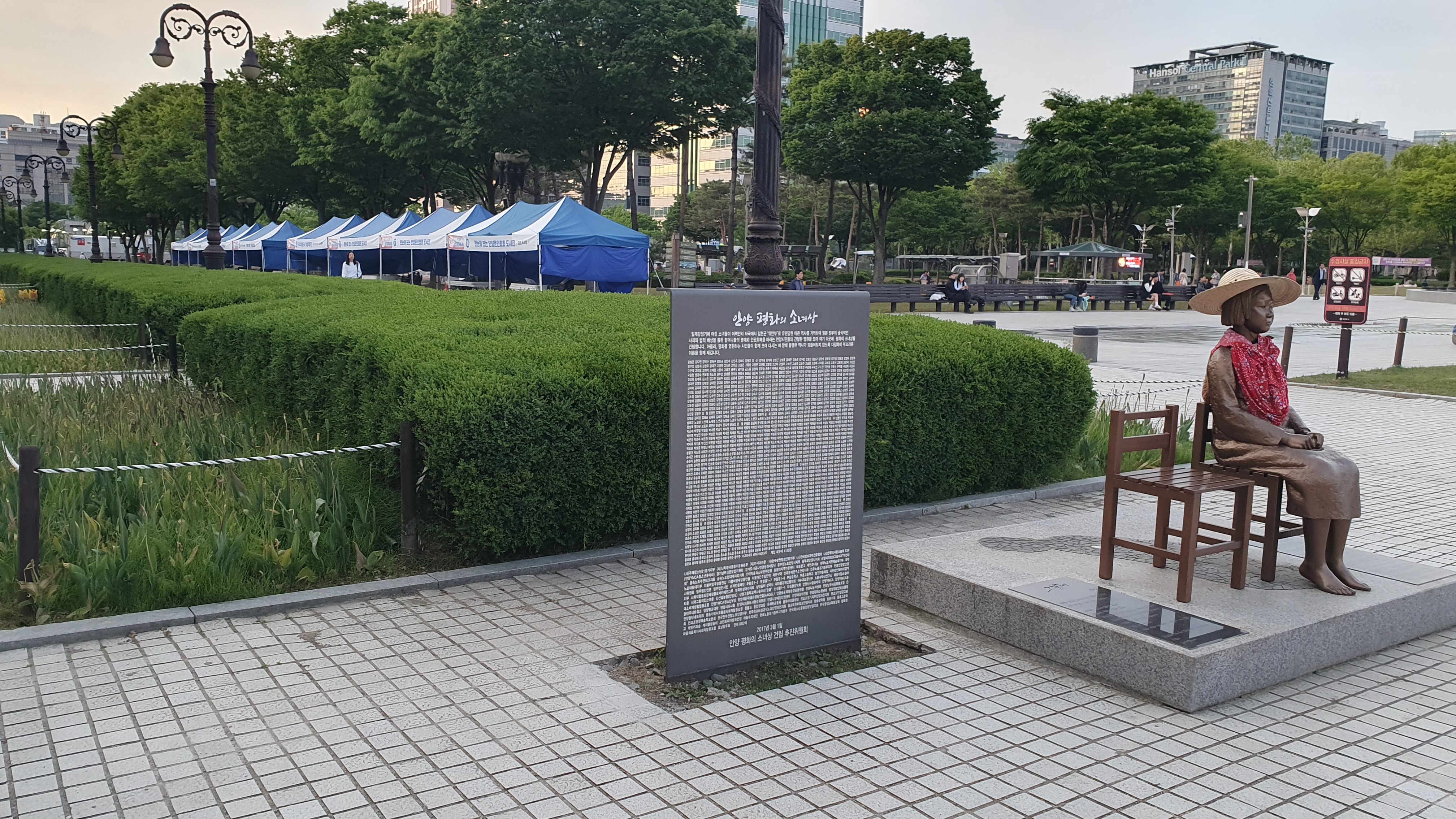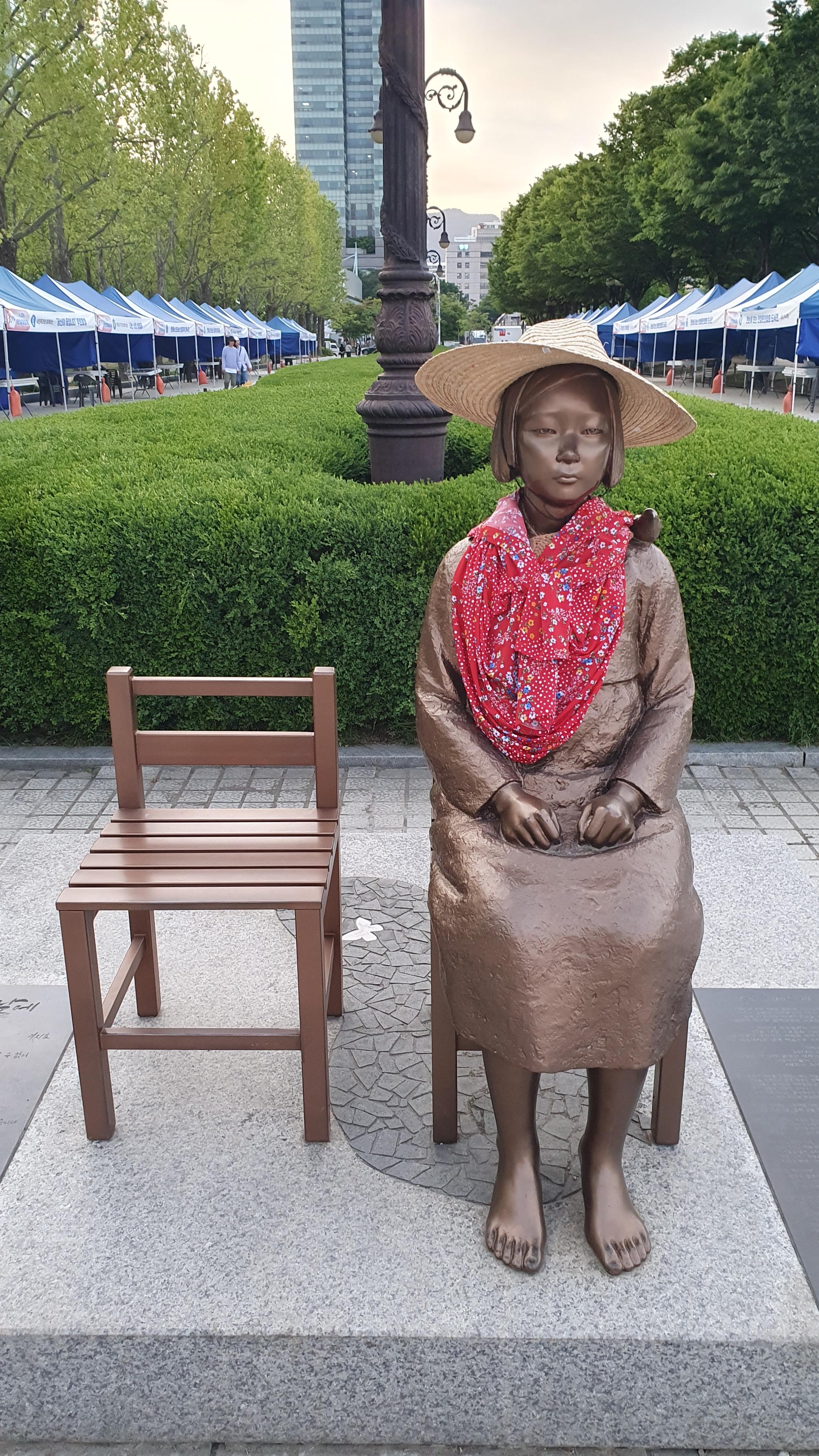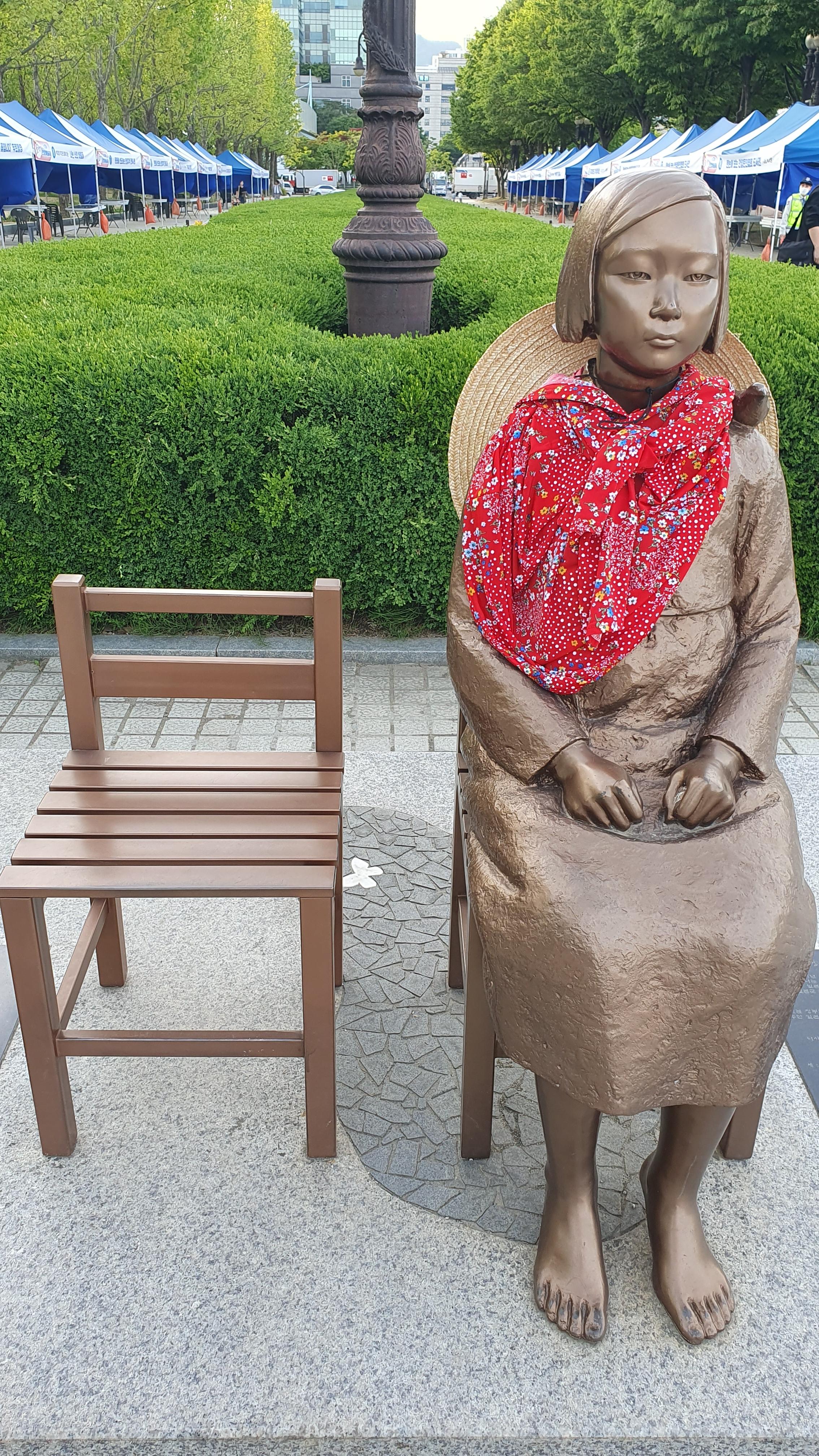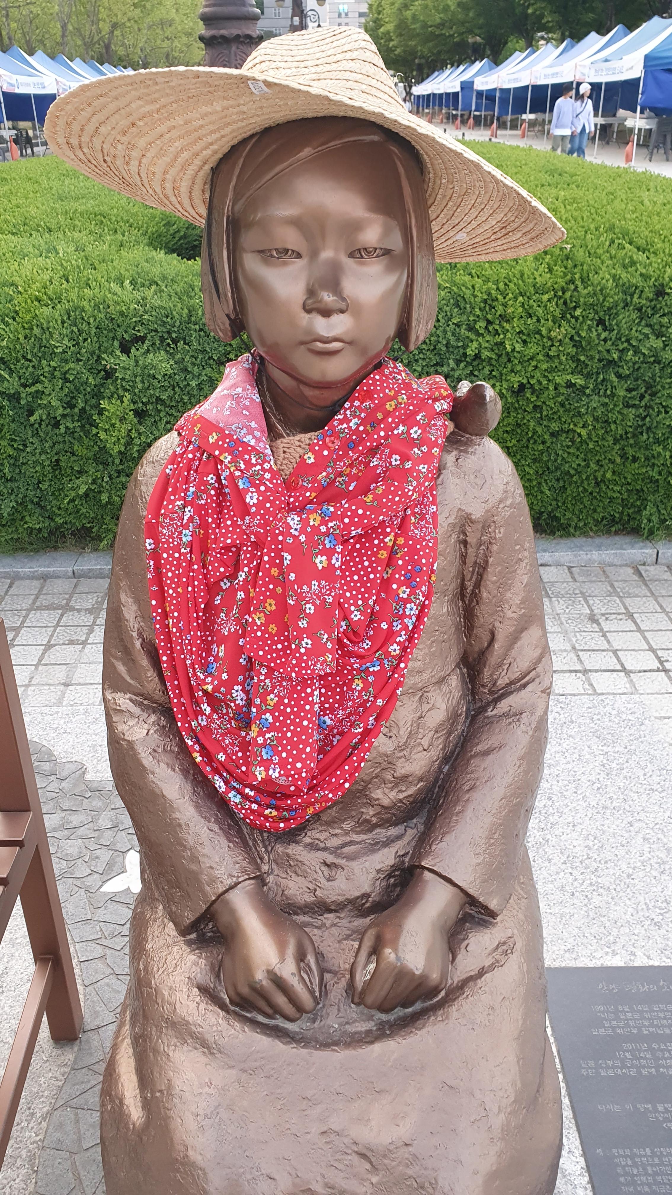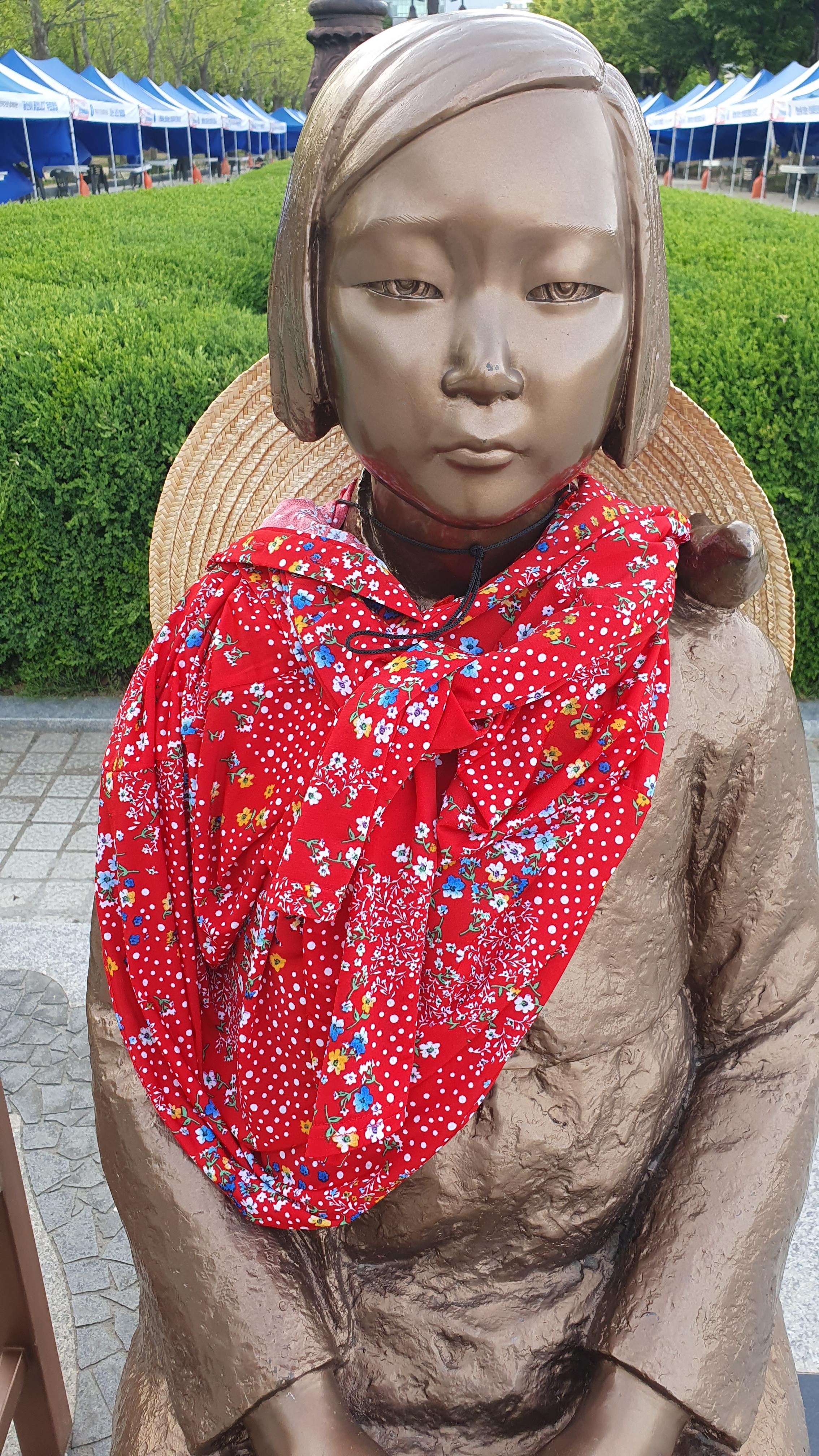 2024.05.10/ #도시기록 #안양 #평화의소녀상 #평촌중앙공원/ 평촌 중앙공원에서 행사(안양예술제)가 있어 왔던길. 간만에 찾아본 평화의 소녀상. 어느분이 와서는 소녀상 목에 머플러를 매주고 밀집모자를 걸어주고 가더니 얼마뒤 또 다른 분이 와서는 머리에 모자를 씌워주고 머플러 매무새를 가다듬고 가네요. 우리곁에 친근한 소녀상입니다.