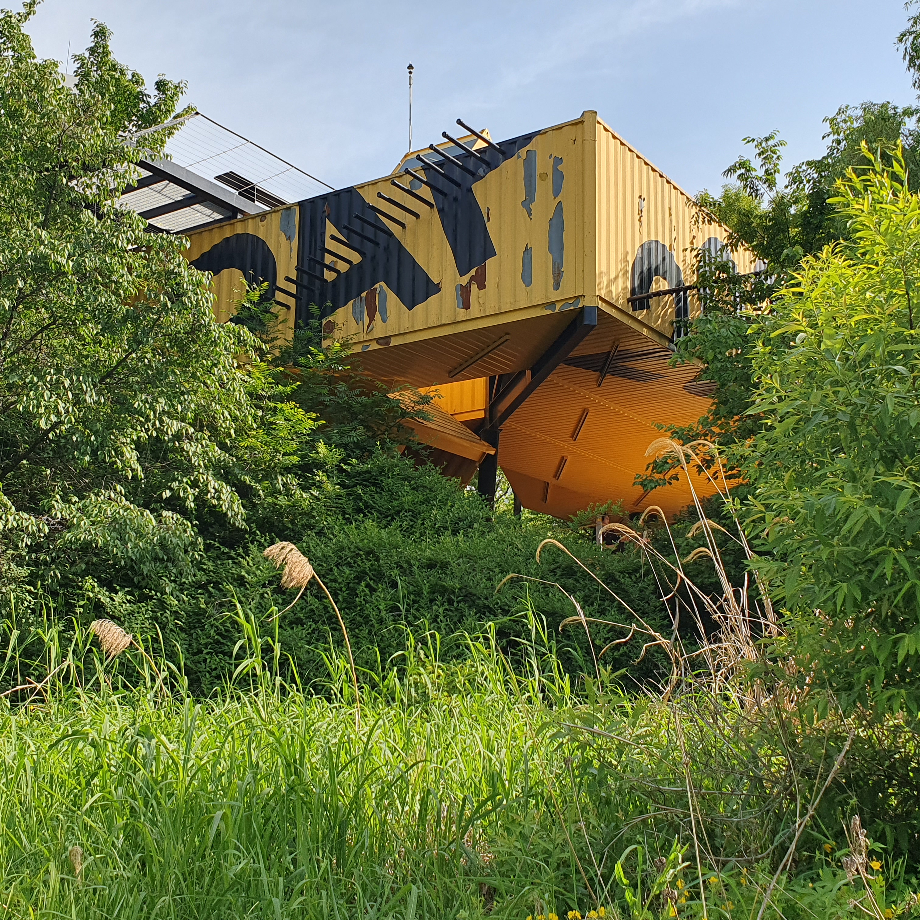 2024.05.12/ #도시기록 #안양 #학의천 #학운공원 #apap #오픈스쿨/ 안양시 관양동 학운공원 B구역(학의천 내비산교옆)에 있는 시설물인 오픈스쿨은 2010년 개최된 제3회 안양공공예술프로젝트(apap)에서 설치한 영구작품이다. 이 작품은 뉴욕을 중심으로 활동하고 있는 롯-텍(Lot-Ek)이 설계한 것으로 건축면적이 238㎡에 달하는 이 구조물은 노란색 컨테이너 8개가 화살표 모양으로 조합돼 있는 필로피 구조로 1층을 공중으로 뛰어 산책로를 확보했고, 실내는 강연과 전시가 가능하도록 설계돼 있다. 2011년 미국 뉴욕건축가협회 주최로 뉴욕에서 열린'2011년 디자인 어워드'에서 치열한 경쟁끝에 건축부문 수상작으로 선정될 만큼 국제적으로도 유명해진 작품이나 제대로 활용을 못한채 마치 버려진듯한 공간으로 전락해 안타깝다. 더욱이 시간이 흐르면서 노란 페인트칠이 벗겨져 보수를 하지만 최근 여기저기 벗겨짐이 심해 흉물스러운 모습이다.
