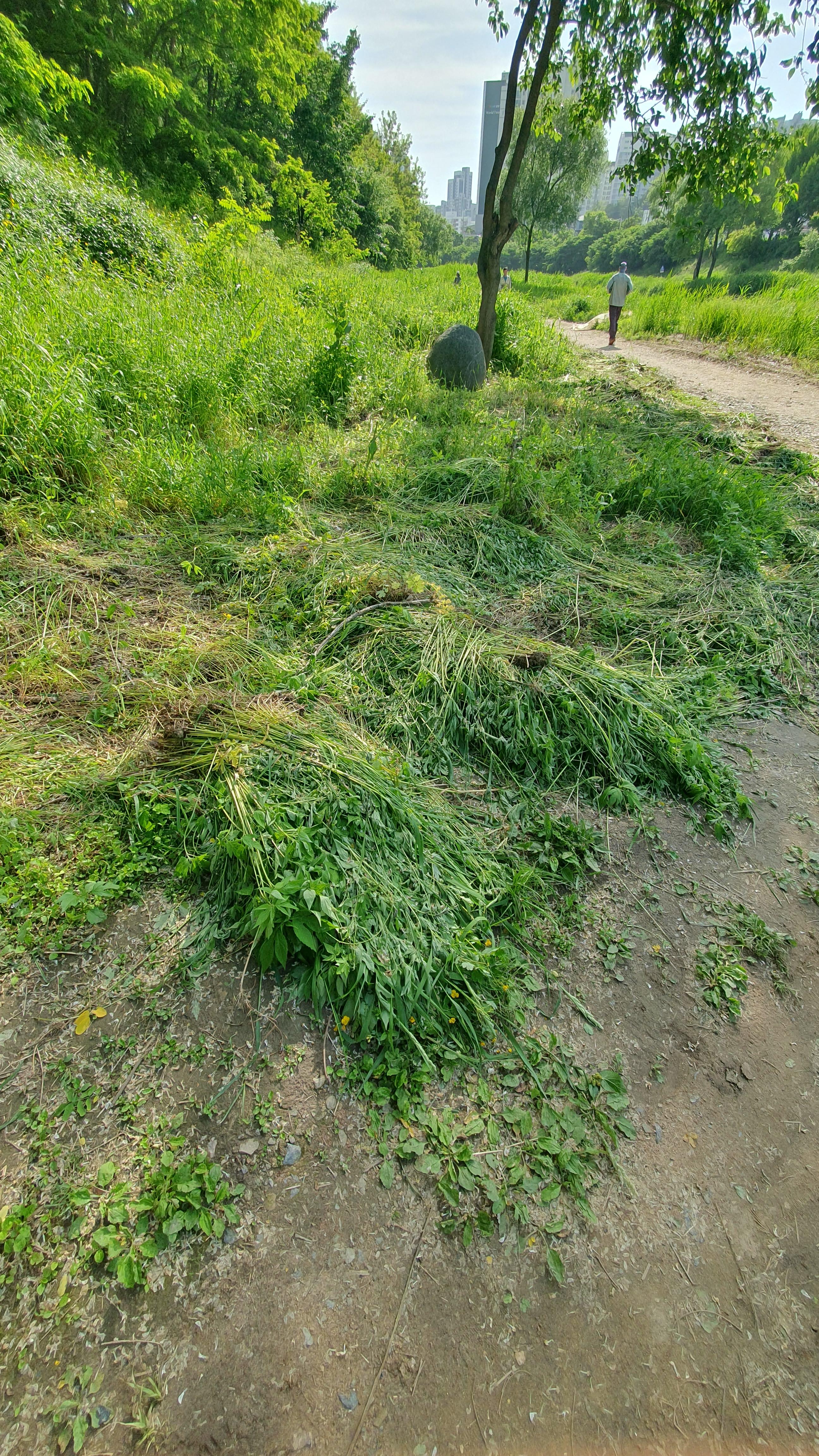 2024.05.12/ #도시기록 #안양 #학의천 #에공/ 안양 학운공원 둔치인 학의천 남단 산책로(흙길)의 수풀을 베어낸 모습이다. 흙길 산책로 옆으로 일부만 베어낸 모습을 볼때 기획적이고 의도적인 행동이고 이유가 있어 보이는데 왜 그랬을까. 이같은모습은 학의천 흙길 산책로뿐만 아니라 북단 포장길 산책로옆도 마찬가지다. 분명 이유가 있겠고 궁금하지만 자연 그대로 두었으면 싶은 흙길 산책로 주변의 수풀은 대체 왜 베어냈을까. 이런 작업을 할때 큰 안내판은 아니어도 안내문이라도 나무에 걸어 이해를 구하면 어떨까 싶다. 삼성천 오리 해코지에 주민이 종이에 글씨 써 코팅해 부착한 것처럼 소통이 중요하다.