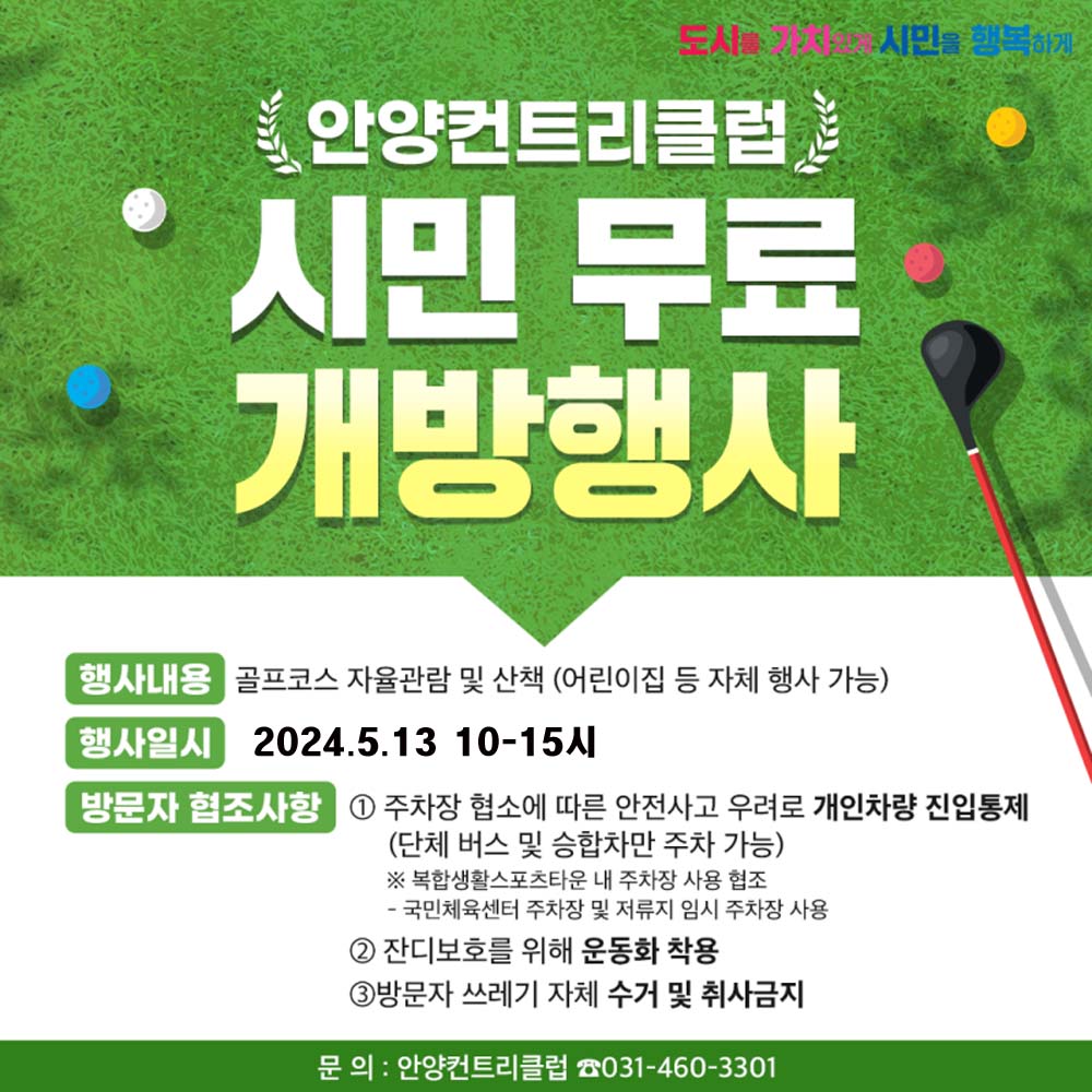 1968년에 개장한후 국내최고의 조경관리로 아름다운 골프장으로 골퍼들에게도 선망의 대상인 안양컨트리클럽이 지난 5월 13일 무료개방 행사를 실시해 골프 코스 일부를 관람하고 아름다운 자연환경을 만끽하며 산책하는 등 안양컨트리클럽의 속살을 들여다 볼수 있었다.