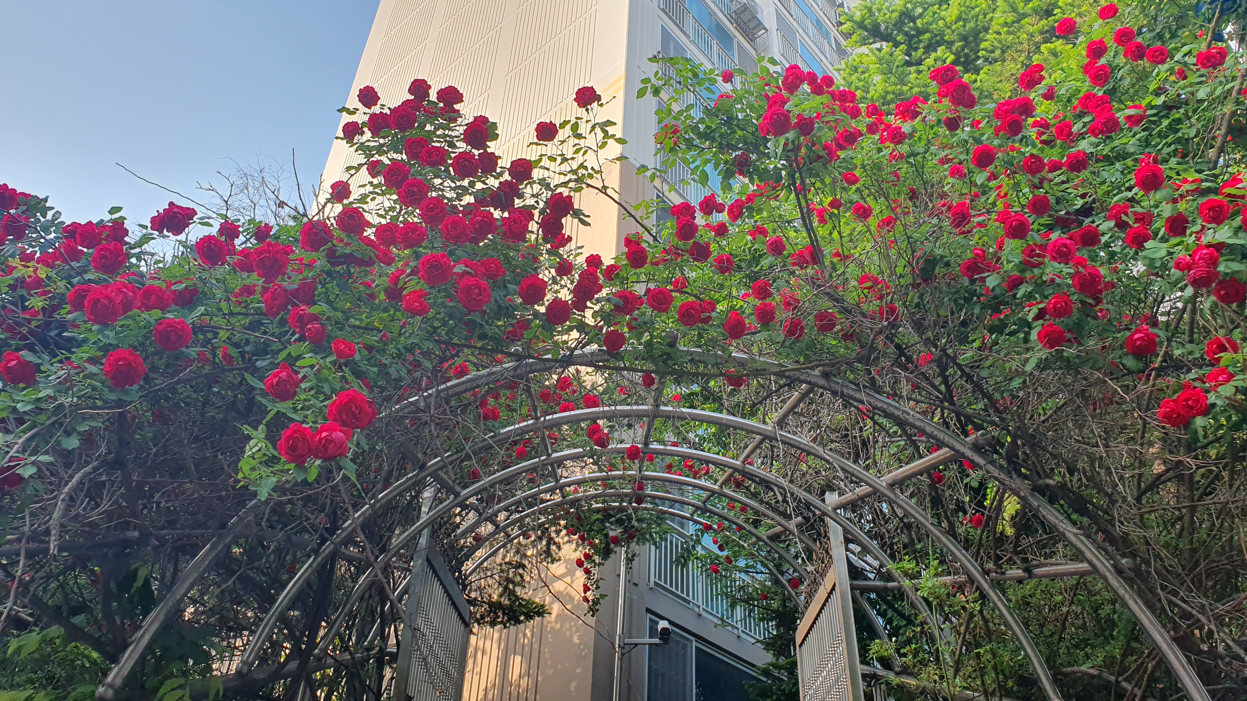 2024.05.17/ #도시기록 #안양 #현대홈타운 #장미꽃/ 안양 학원가 귀인마을 현대홈타운아파트의 명물. 101동앞 상가쪽 출입구 계단에 매년 5월 피어나는 빨간 장미 덩굴이 아름답습니다.