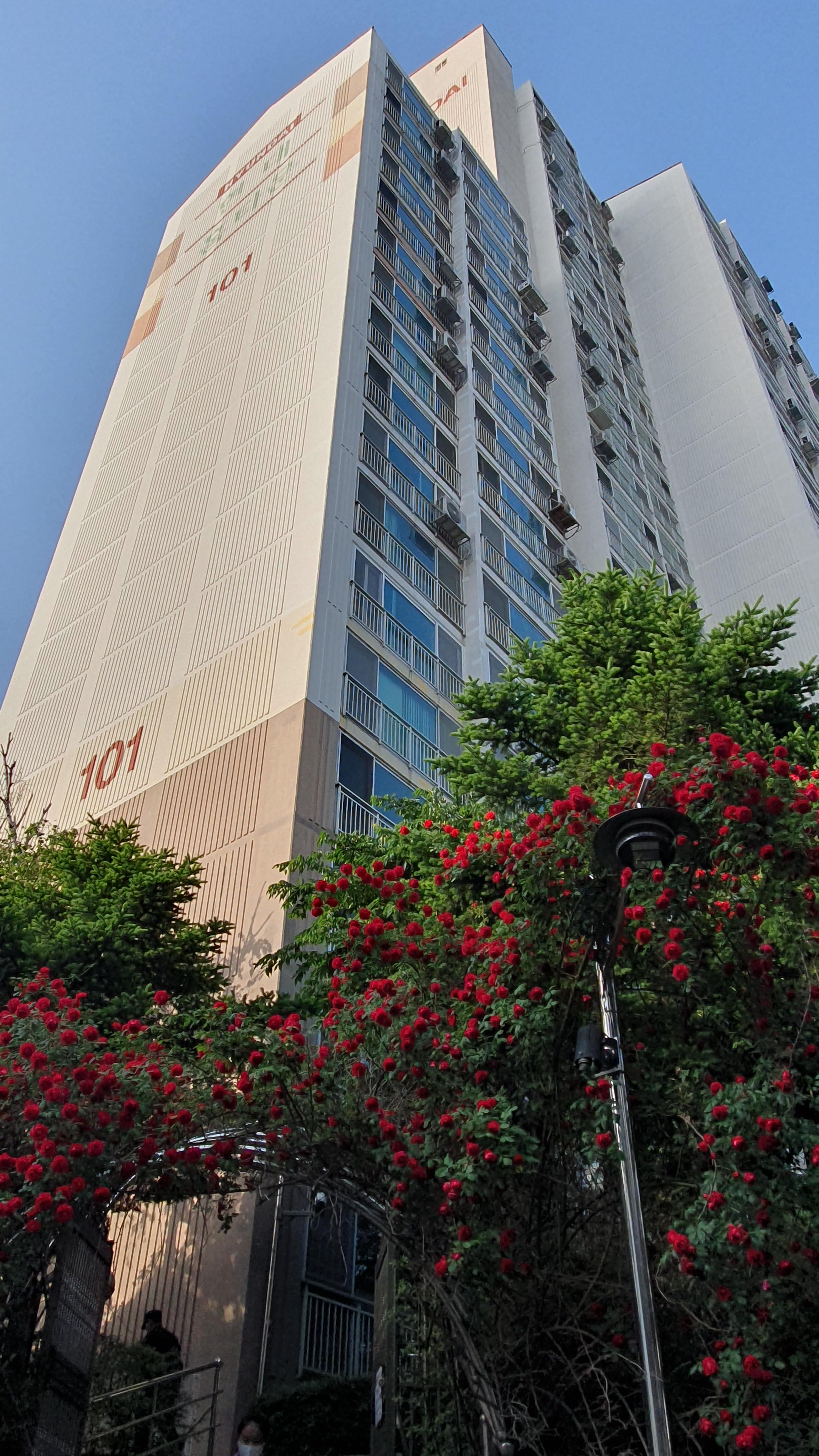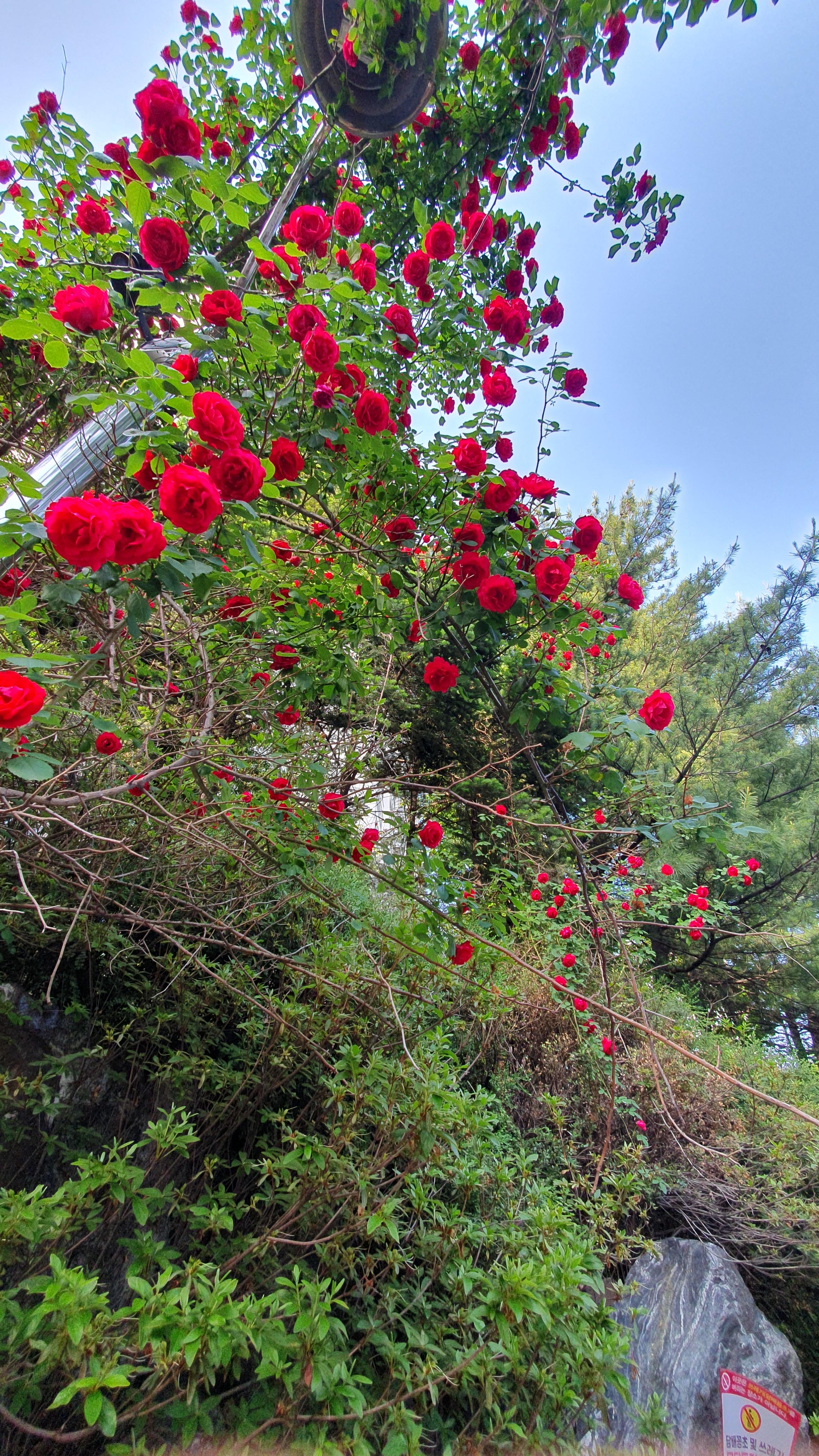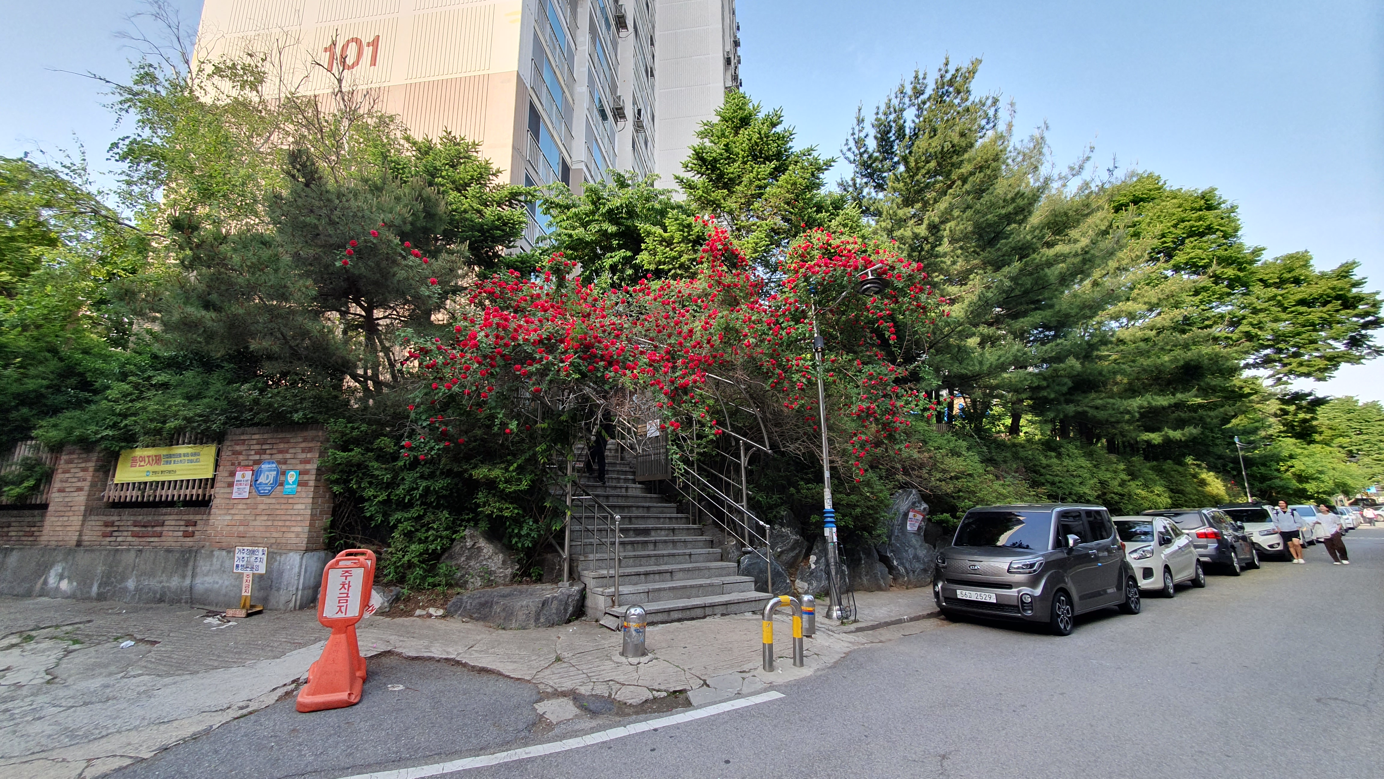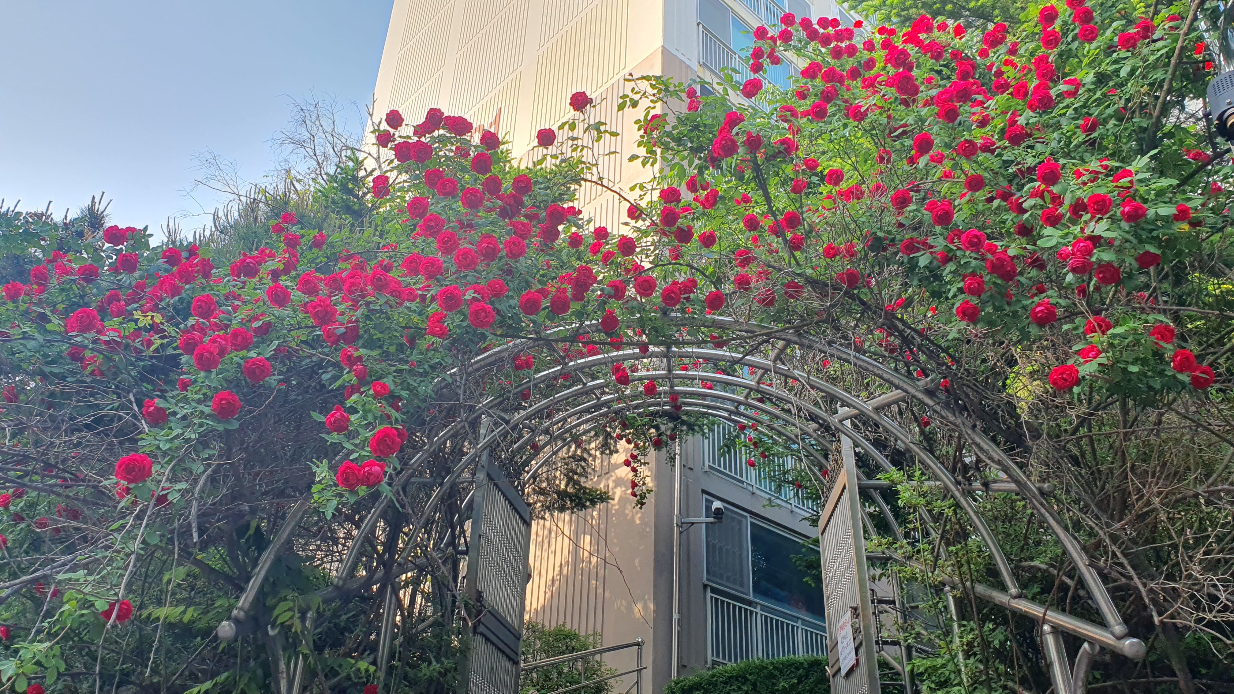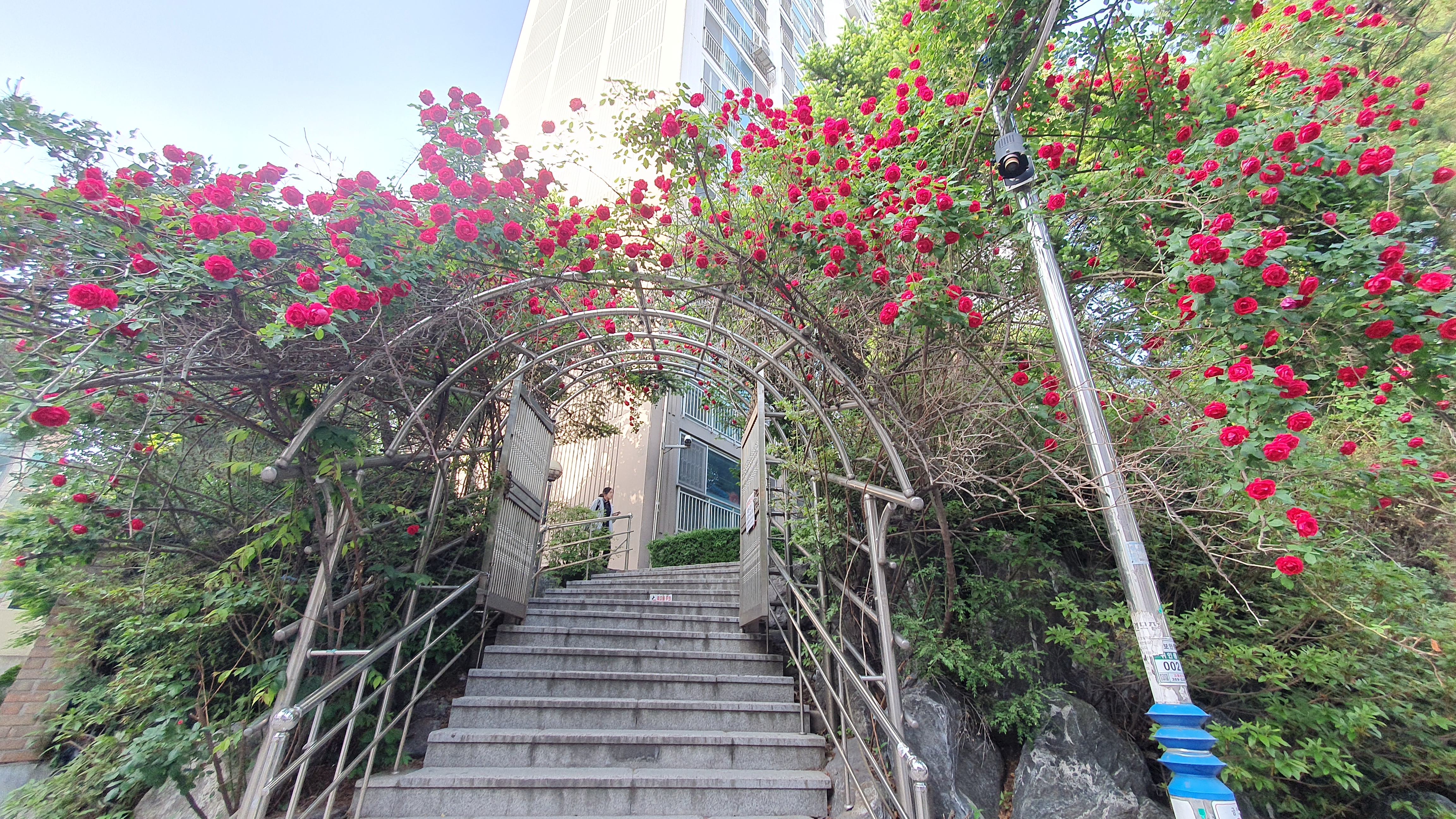 2024.05.17/ #도시기록 #안양 #현대홈타운 #장미꽃/ 안양 학원가 귀인마을 현대홈타운아파트의 명물. 101동앞 상가쪽 출입구 계단에 매년 5월 피어나는 빨간 장미 덩굴이 아름답습니다.
