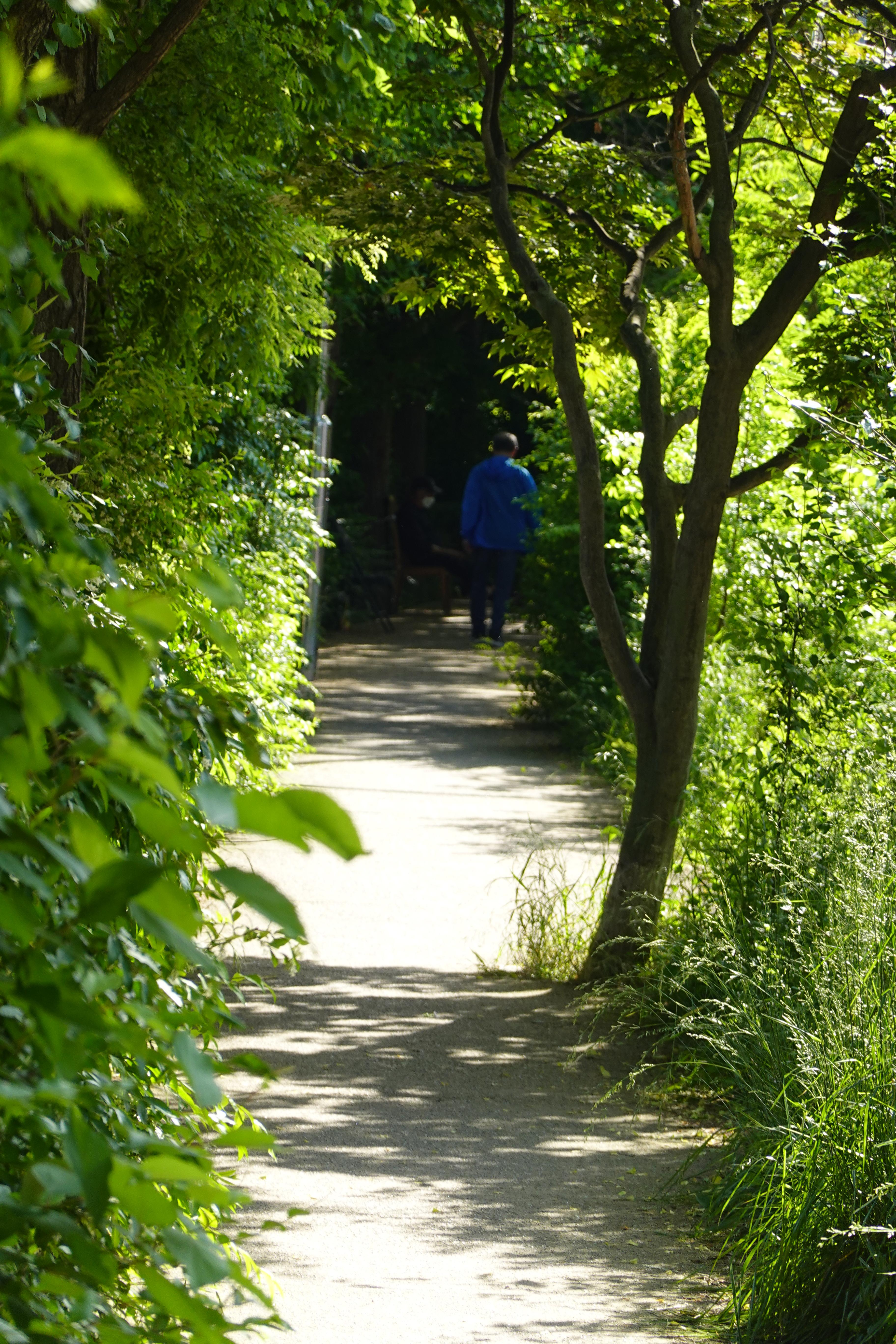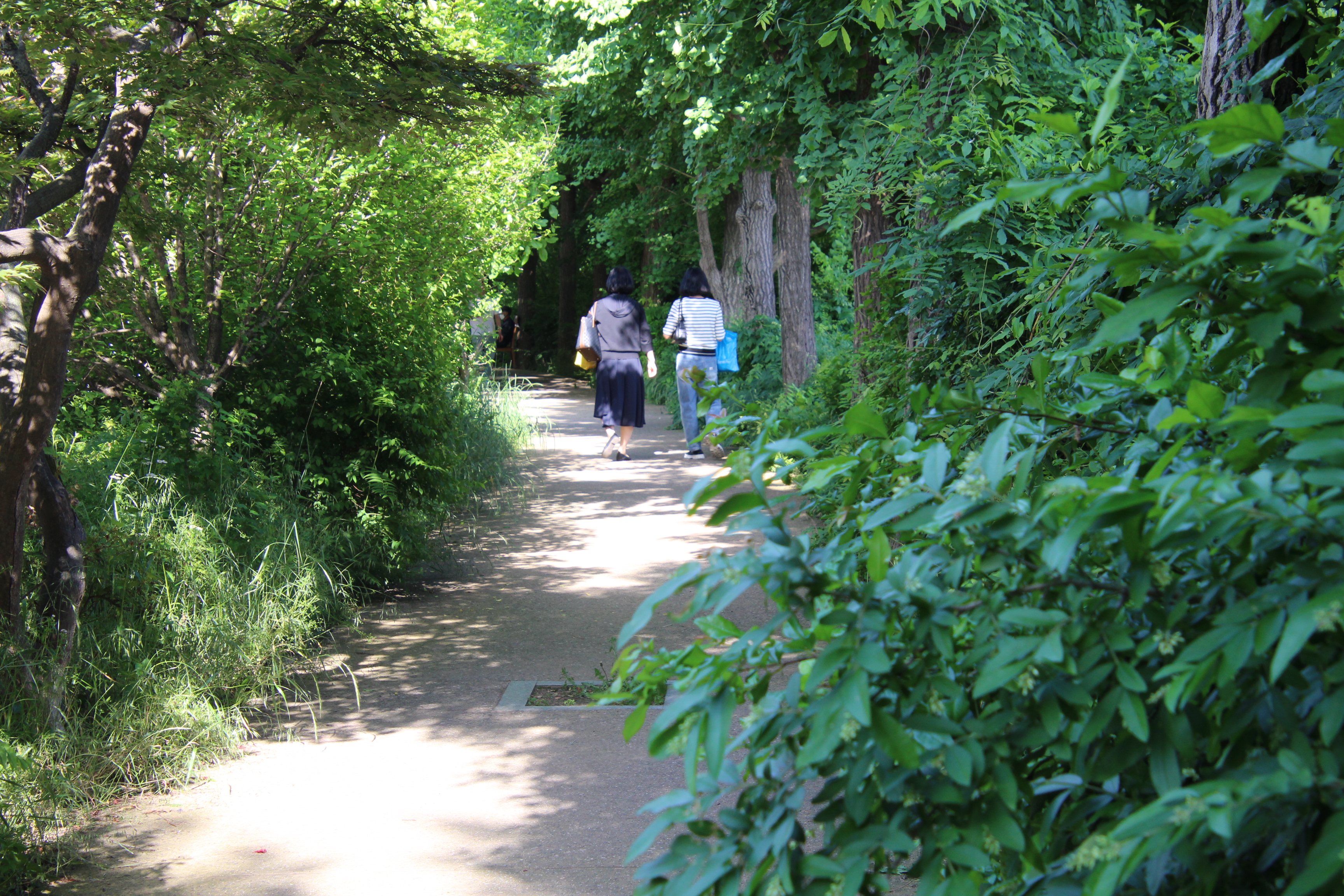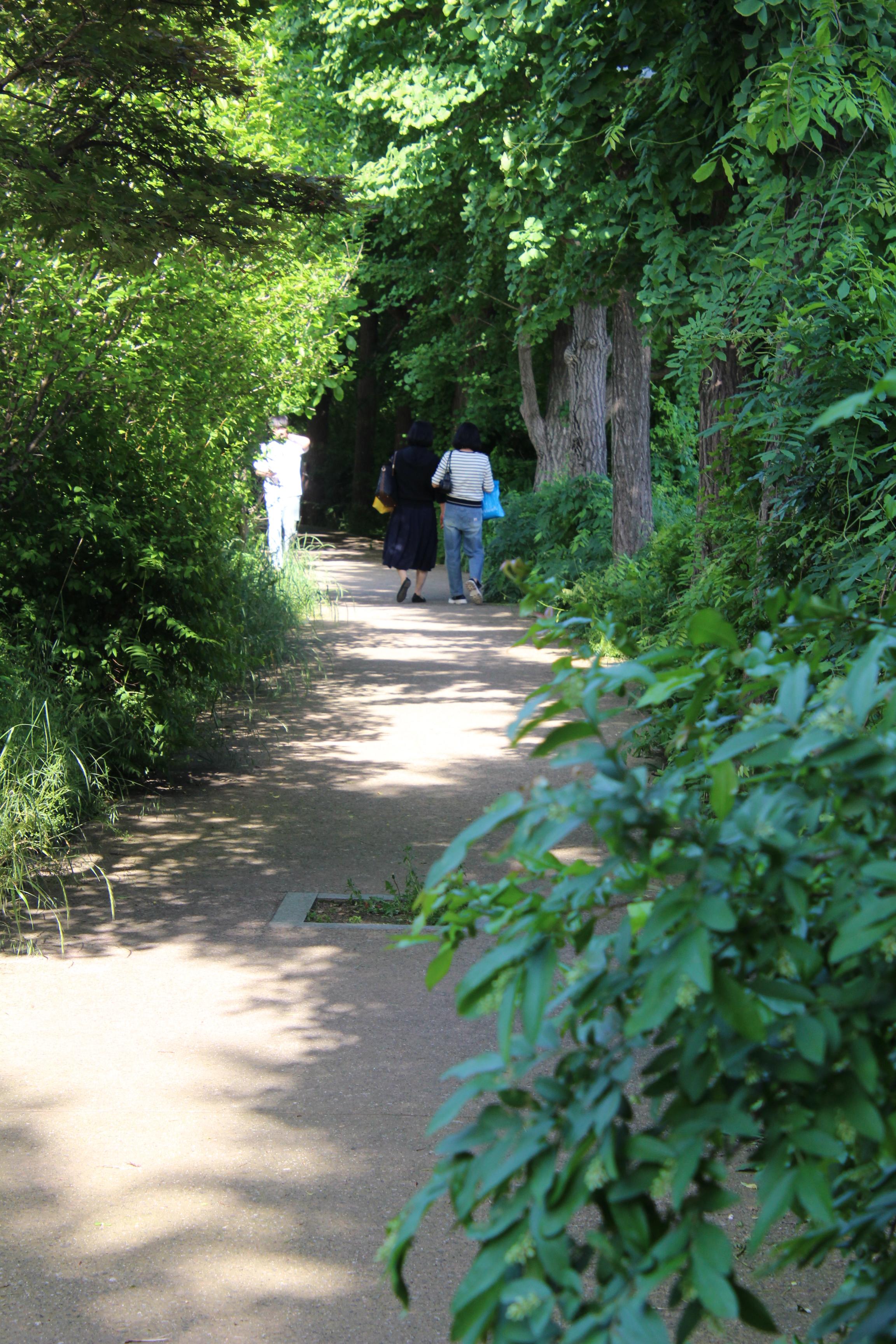 제방위 산책길 양옆로 짙푸른 나무숲이 우거져 둘이 걷기에 비좁은 길은 마치 짙푸른 숲터널을 연상케 할 정도이다.