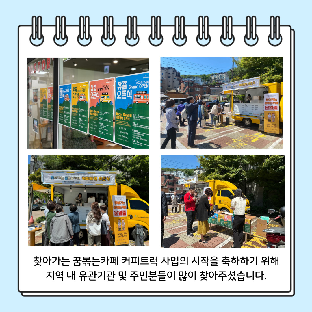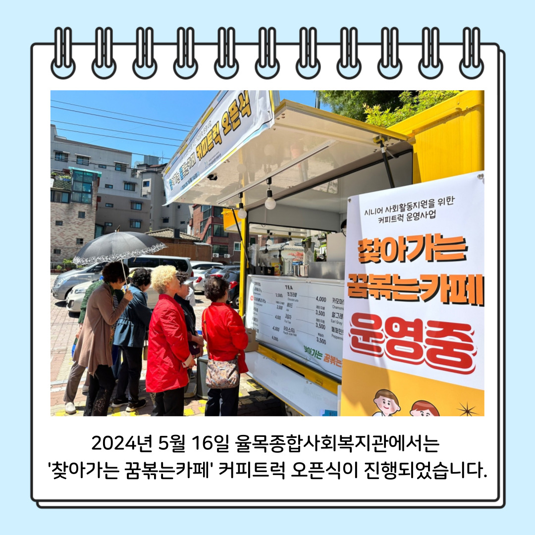 지난 5월 16일 진행되었던 안양시율목종합사회복지관이 운영하는 "찾아가는 꿈볶는카페 커피트럭"이 지난 16일 오픈식을 가졌다.