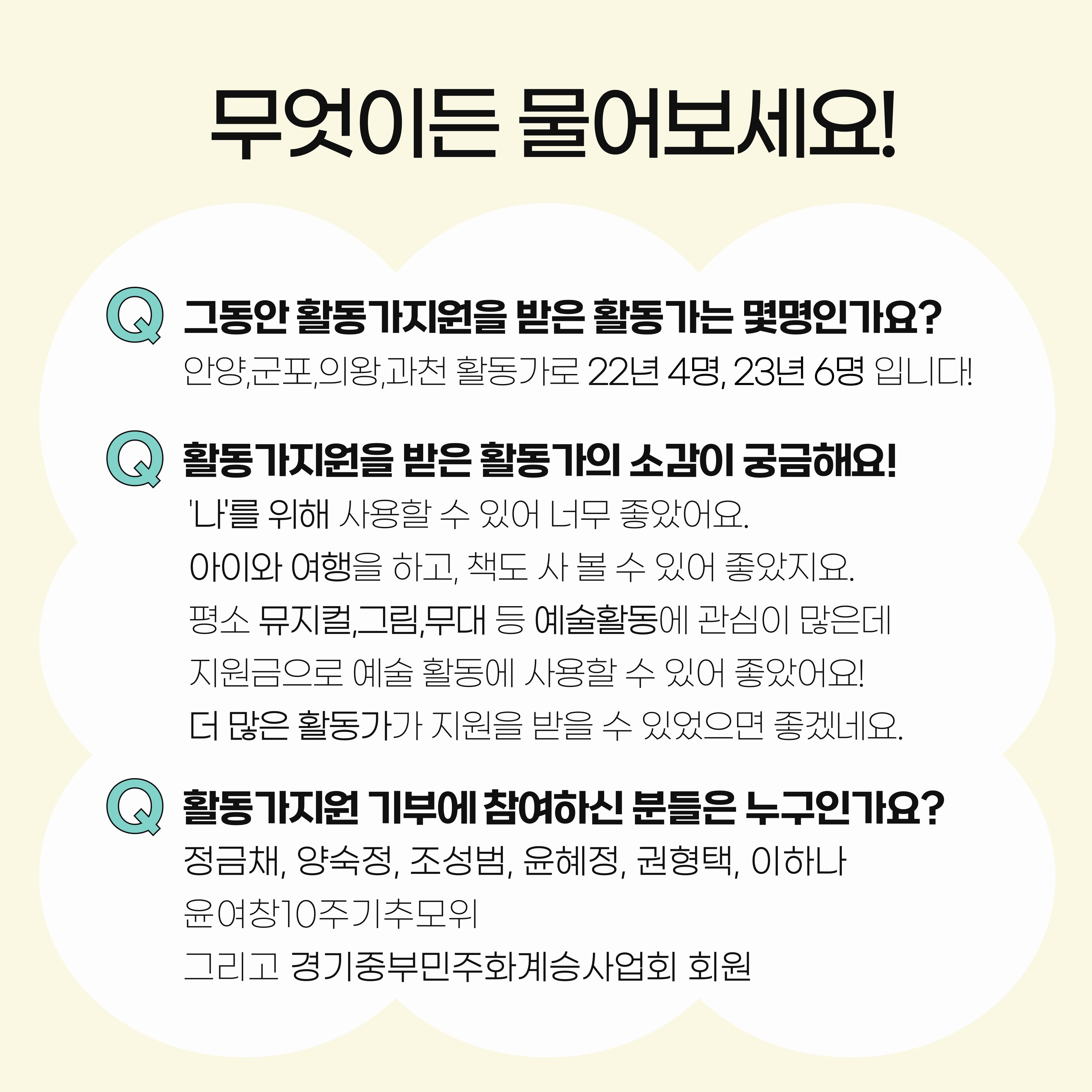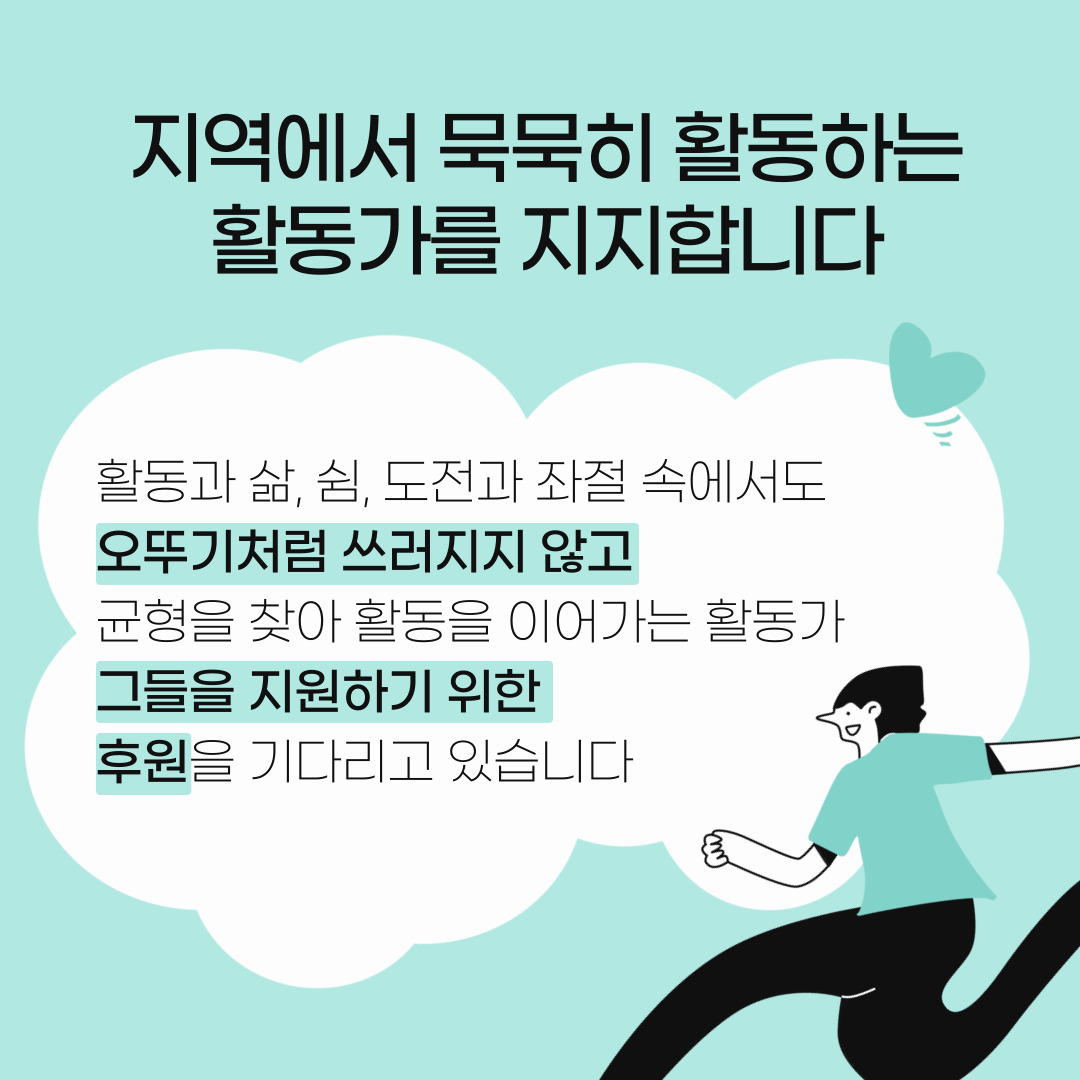2022~23년 2년동안 지역에서 열심히 활동하고 있는 총 7명의 활동가를 위한 쉼 기금을 지원했습니다. 이는 회비 및 특별회비를 보내 주신 회원님들의 덕분입니다.