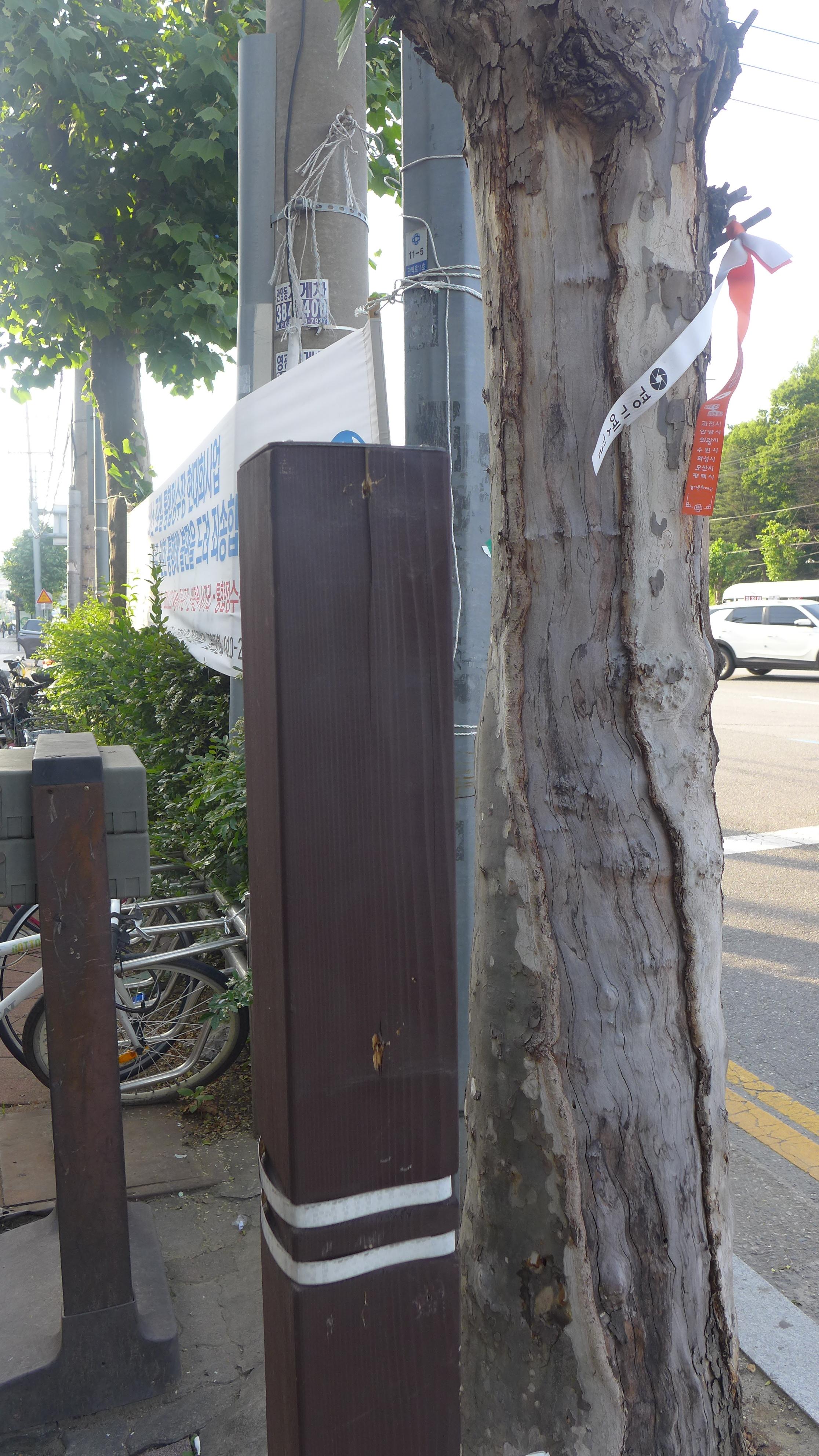 2024.05.22/ #도시기록 #에공 #안양/ 경기옛길(삼남길 1구간) 이정표 훼손. 안양 인덕원 관악대로 횡단보도(인덕원역 7번 출구앞)에 세워진 나무 말뚝에 부착됐던 경기옛길 표시 팻말이 사라짐, 안양시가 경기도 또는 경기옛길걷기 사업을 진행하는 경기문화예술재단에 알려 보수가 필요해 보인다.