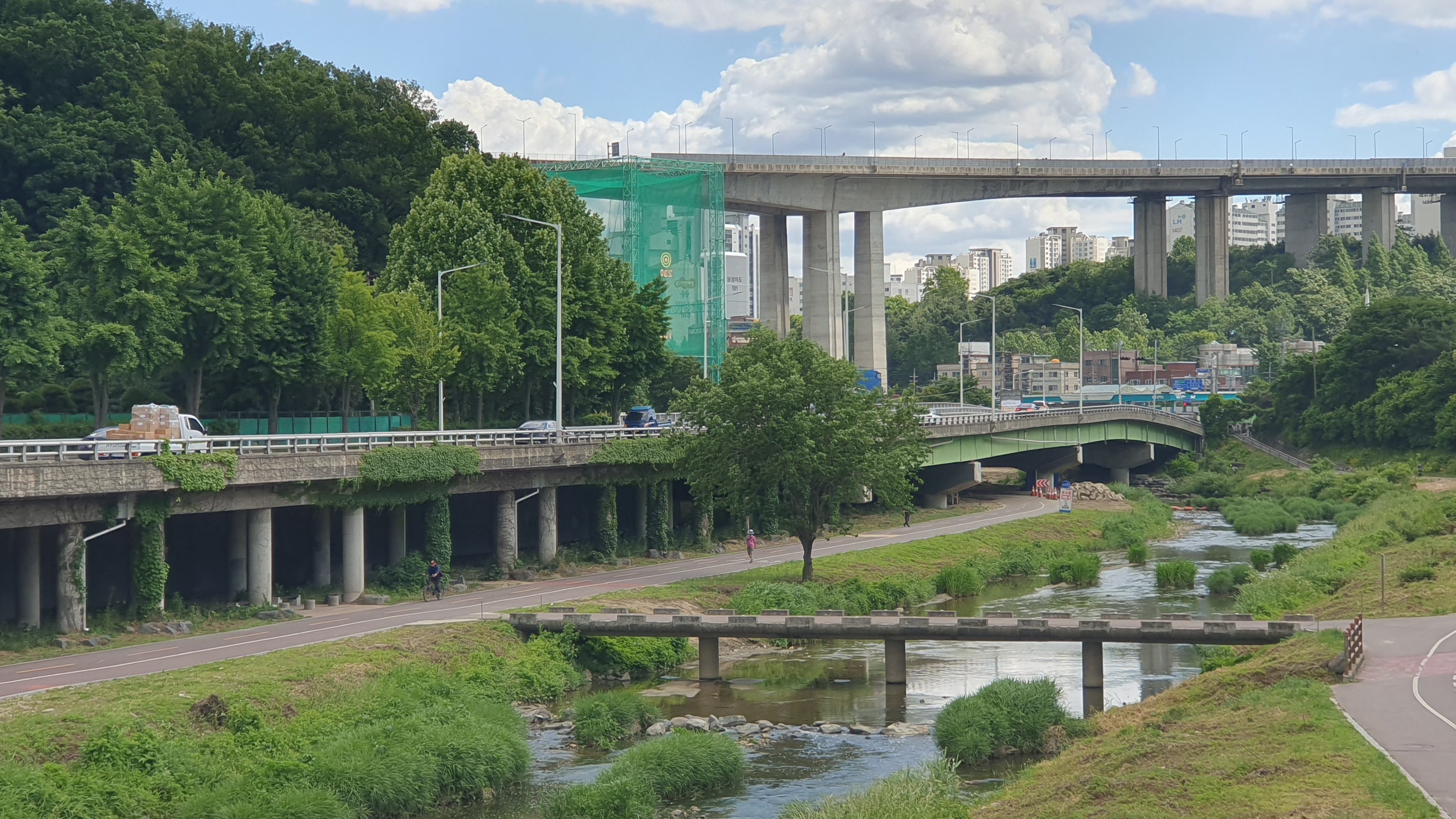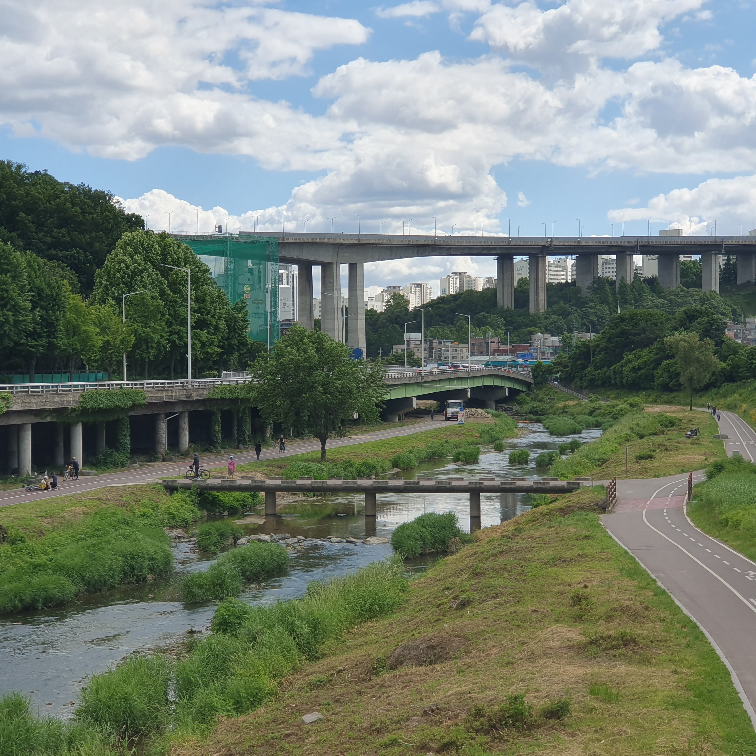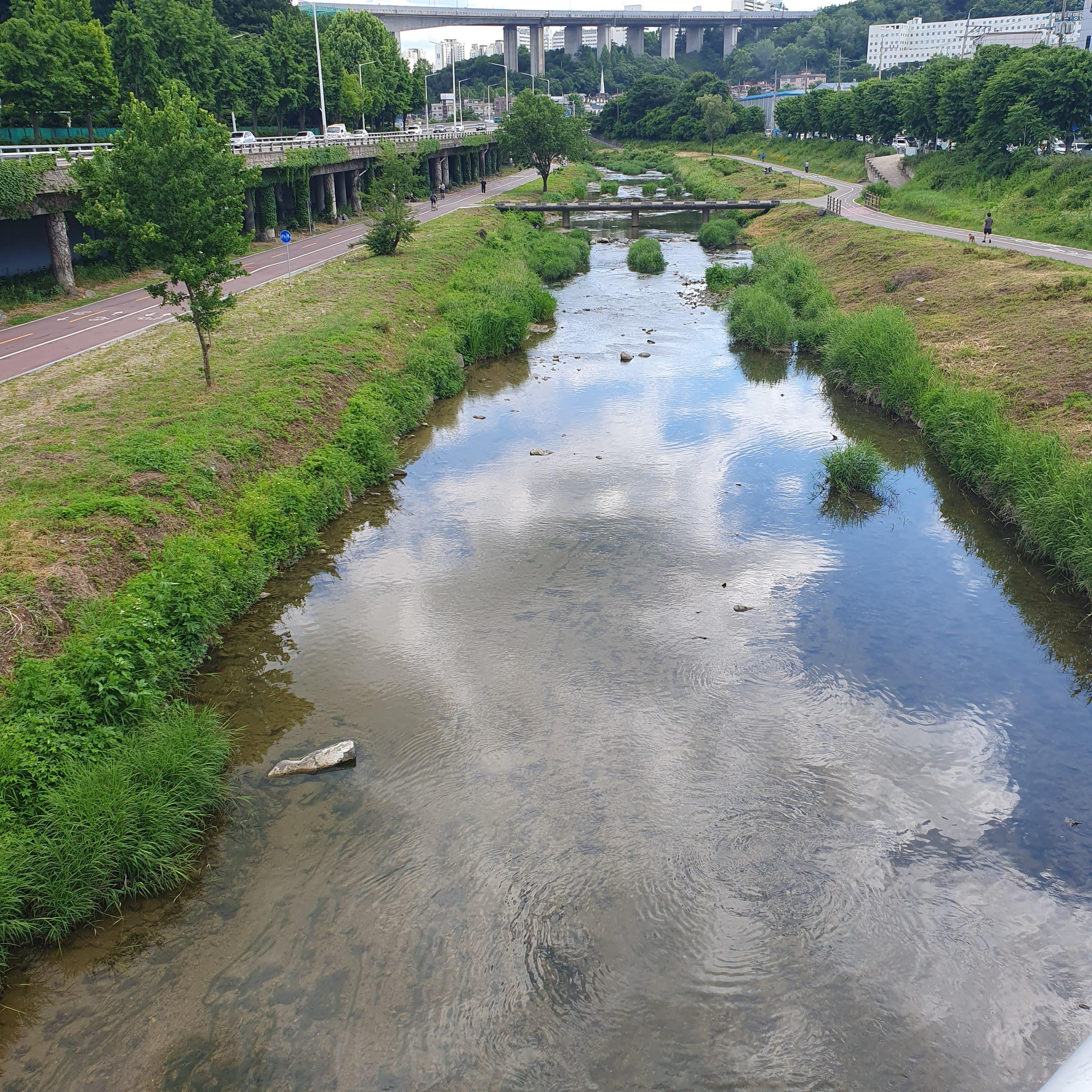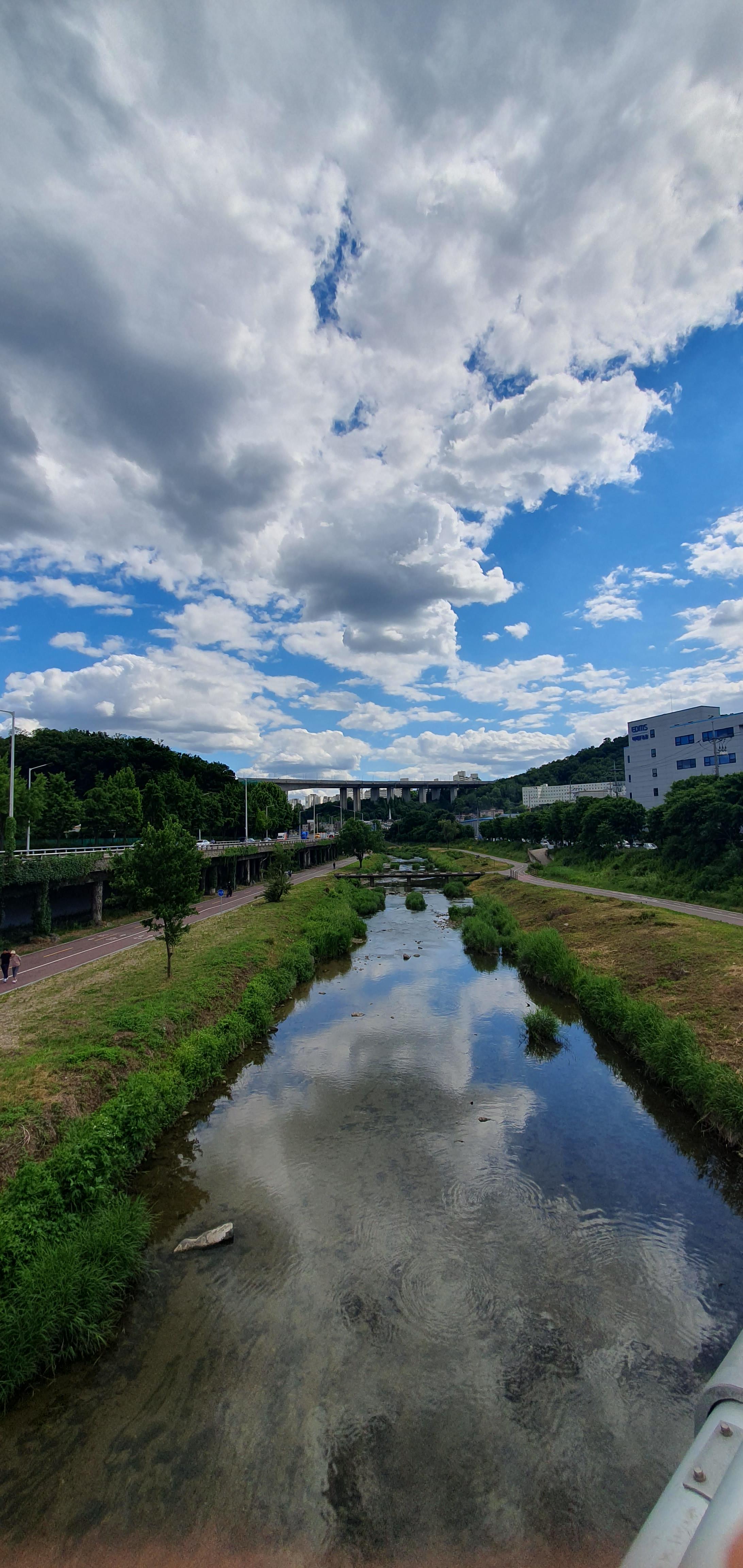 2024.05.28/ #도시기록 #안양 #안양천 #명학대교/ 파란하늘과 하얀구름으로 날씨 예뻤던날 명학대교에서 본 안양천과 주변 풍경