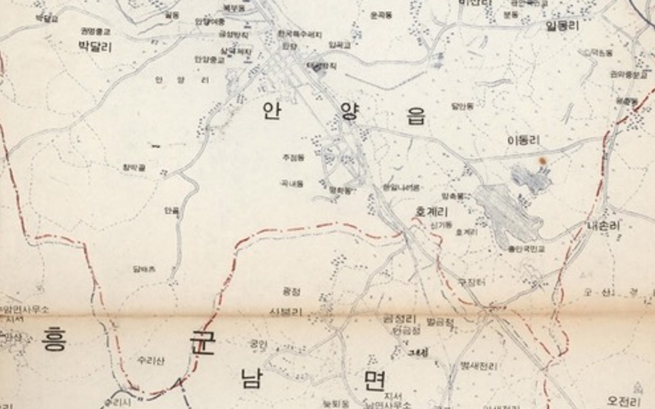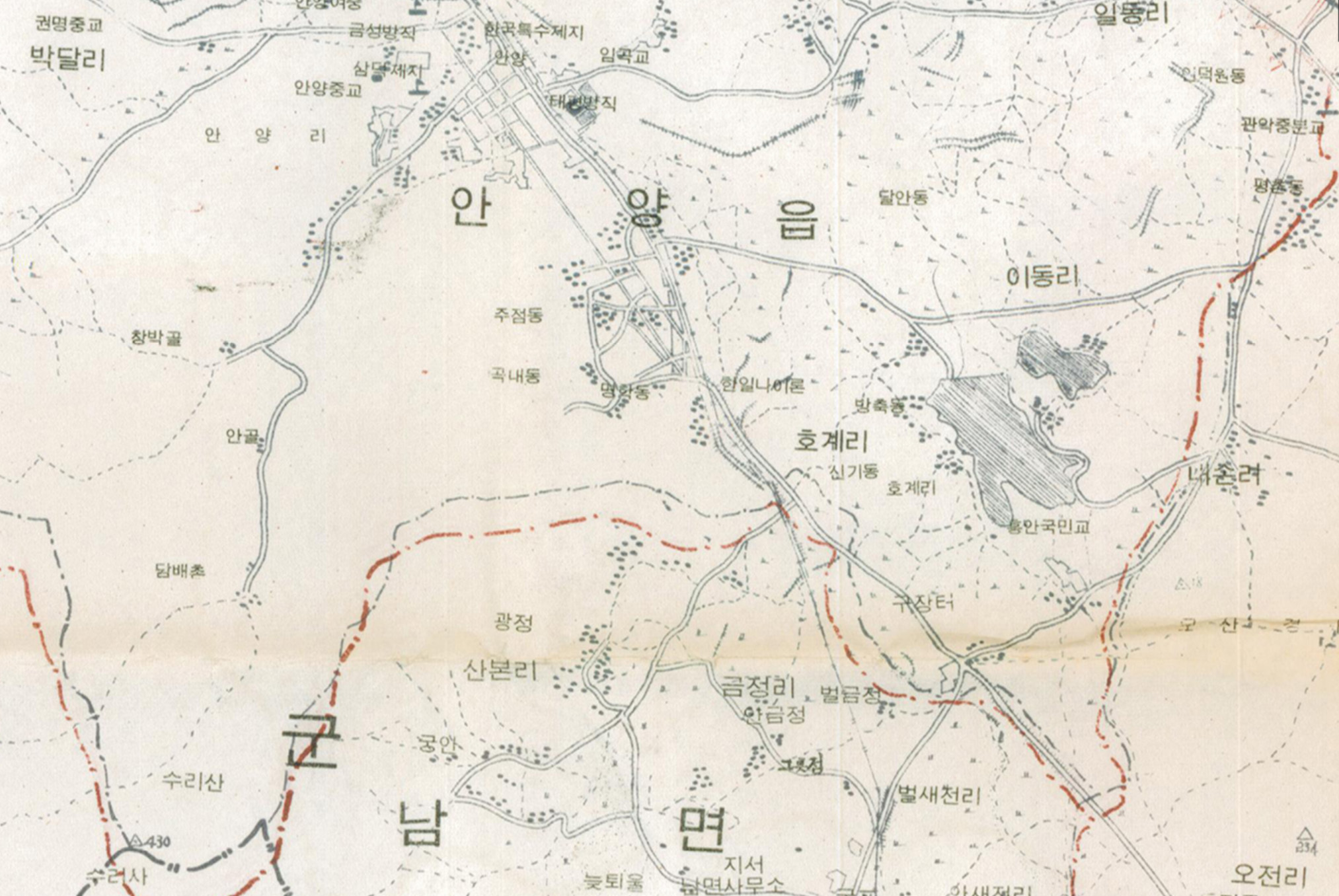 1971년 2월 20일 필중서관에서 발행한 새서울건설약도속 안양 지도이다. 이 지도는 71년 당시 서울과 인근 경기도의 서울시편입예정지를 나타낸 지도로 경기도 고양군의 신도면과 시흥군의 안양읍, 성남의 대왕면 및 중부면 등 일부 지역이 서울시편입예정지로 되어 있다. 지도에 붉은 선으로 건설 예정 도로 및 교량 등이 표시되어 있고 당시 건물, 도로, 호수 등 지형 지물과 지명 등을 살펴볼수 있다.
