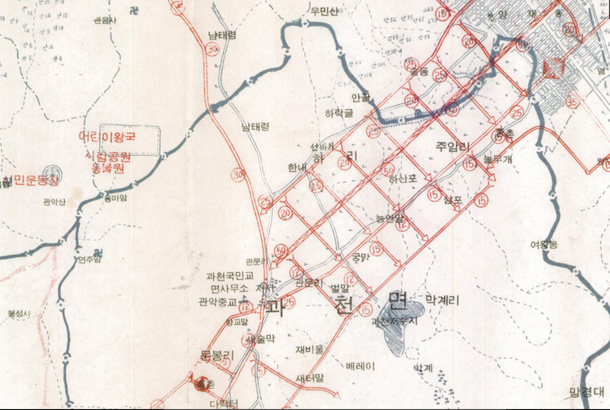 1971년 2월 20일 필중서관에서 발행한 새서울건설약도속 시흥군 과천면(현 과천시) 지도이다. 이 지도는 71년 당시 서울과 인근 경기도의 서울시편입예정지를 나타낸 지도로 경기도 고양군의 신도면과 시흥군의 안양읍, 성남의 대왕면 및 중부면 등 일부 지역이 서울시편입예정지로 되어 있다. 지도에 붉은 선으로 건설 예정 도로 및 교량 등이 표시되어 있고 당시 건물, 도로, 호수 등 지형 지물과 지명 등을 살펴볼수 있다.