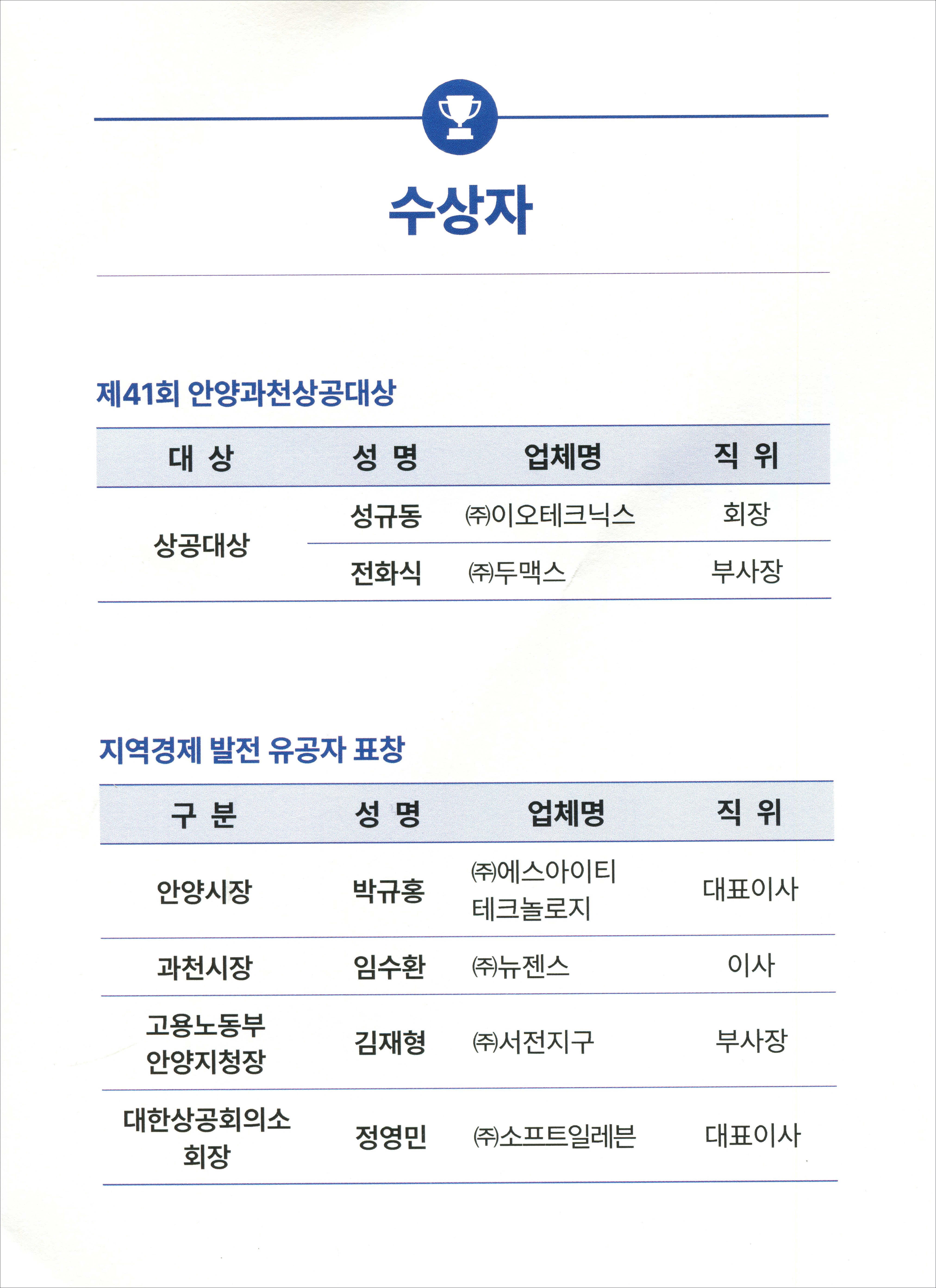 안양상공대상은 평소 기업 발전은 물론, 지역경제 발전과 고용 창출, 신노사문화 정립 등에 크게 이바지한 기업인에게 전달는 상으로 대상은 성규동 이오테크닉스 회장과 전화식 두맥스 부사장 등 2명이 받았다. 또 안양시장, 과천시장, 고용노동부 안양지청장, 대한상공회의소 회장 표창이 전달된 가운데 회원 업체 자녀 70명에게 7000만 원의 장학금이 수여됐다.