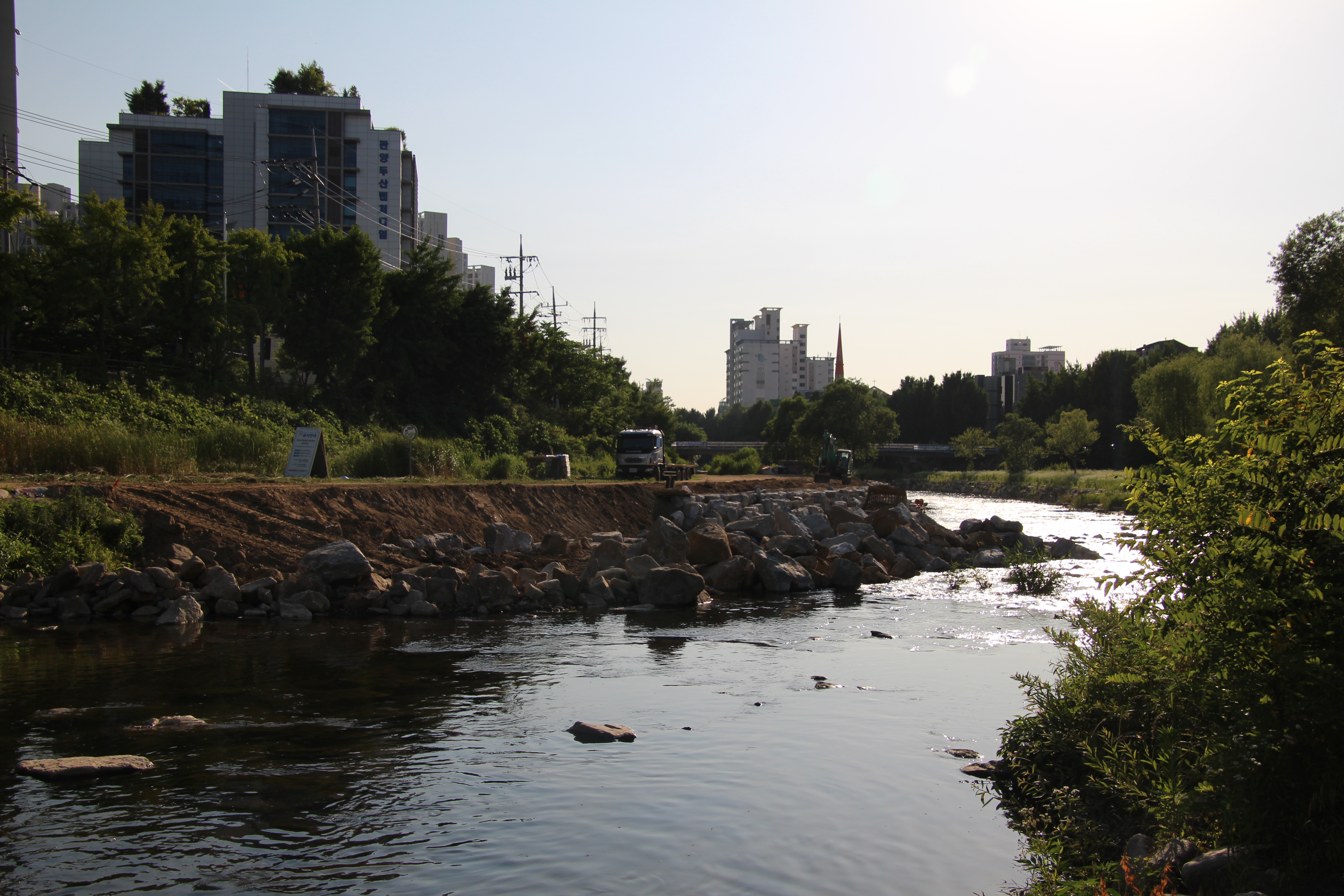2024.06.13/ #도시기록 #안양 #학의천/ 학의천은 곳곳에서 공사중. 관양교 인근에서는 학의천 저수호안 정비공사 진행중. 인근 제방사변(관양교-인덕원인도교)에 꼬리명주나비 애벌레 먹이인 쥐방울덩굴이 자생하는 군락지가 있는데 안양시 생태하천과 공무원들의 관심 덕분에 올해부터는 일체 건드리지 않고 온전히 보전되고 있음을 확인할수 있어서 다행스럽고 감사하다.