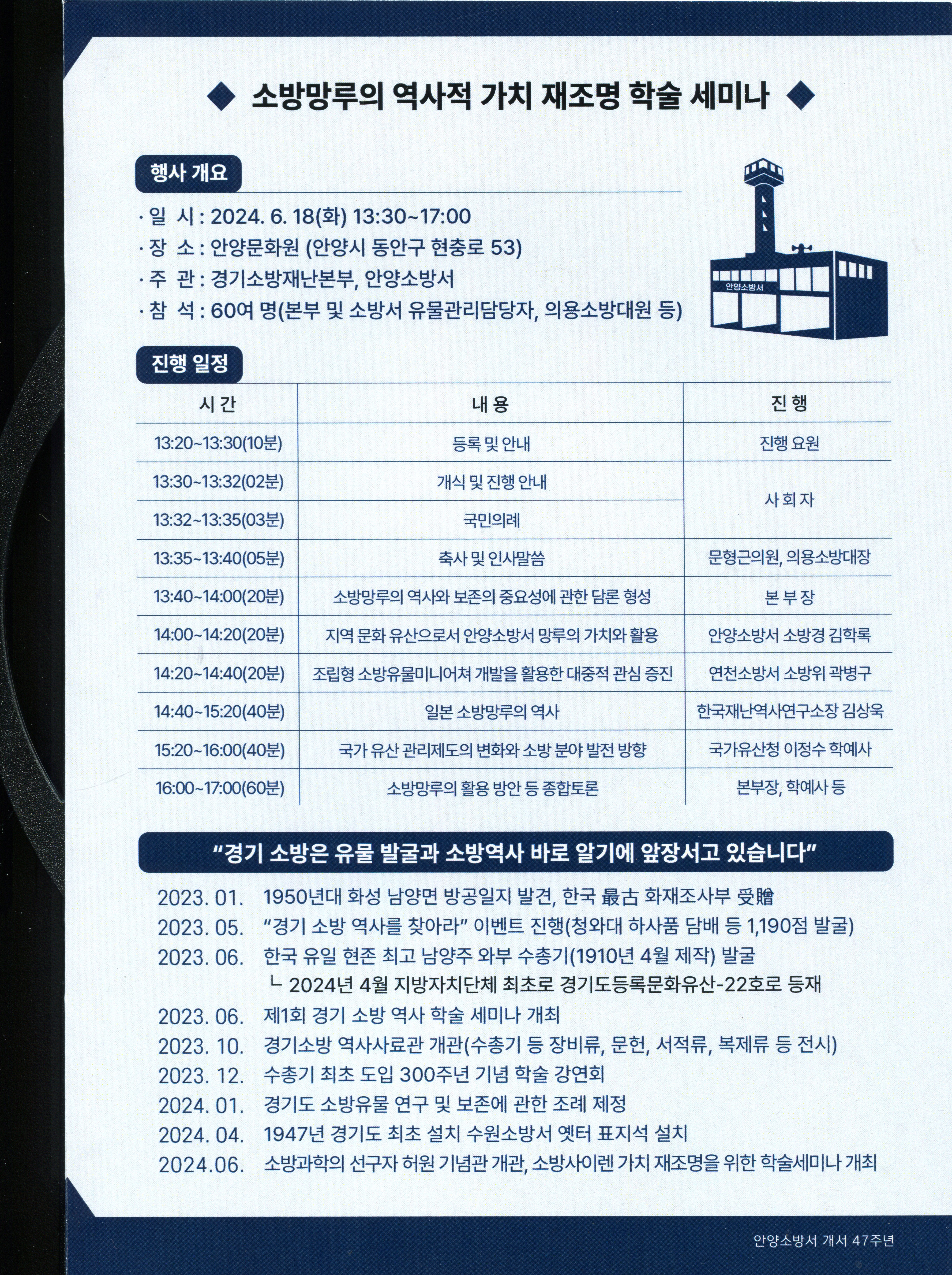 지난 18일 안양문화원 강당에서 열린 "지역문화유산으로서 소방망루의 기치와 활용" 학술세미나에는 조선호 경기도소방재난본부장과 이정수 국가유산청 학예사 등 5명이 발표자로 나서 안양소방서 소방 망루의 문화유산적 가치를 확인하고 국가문화유산 등록의 필요성을 제시했다.