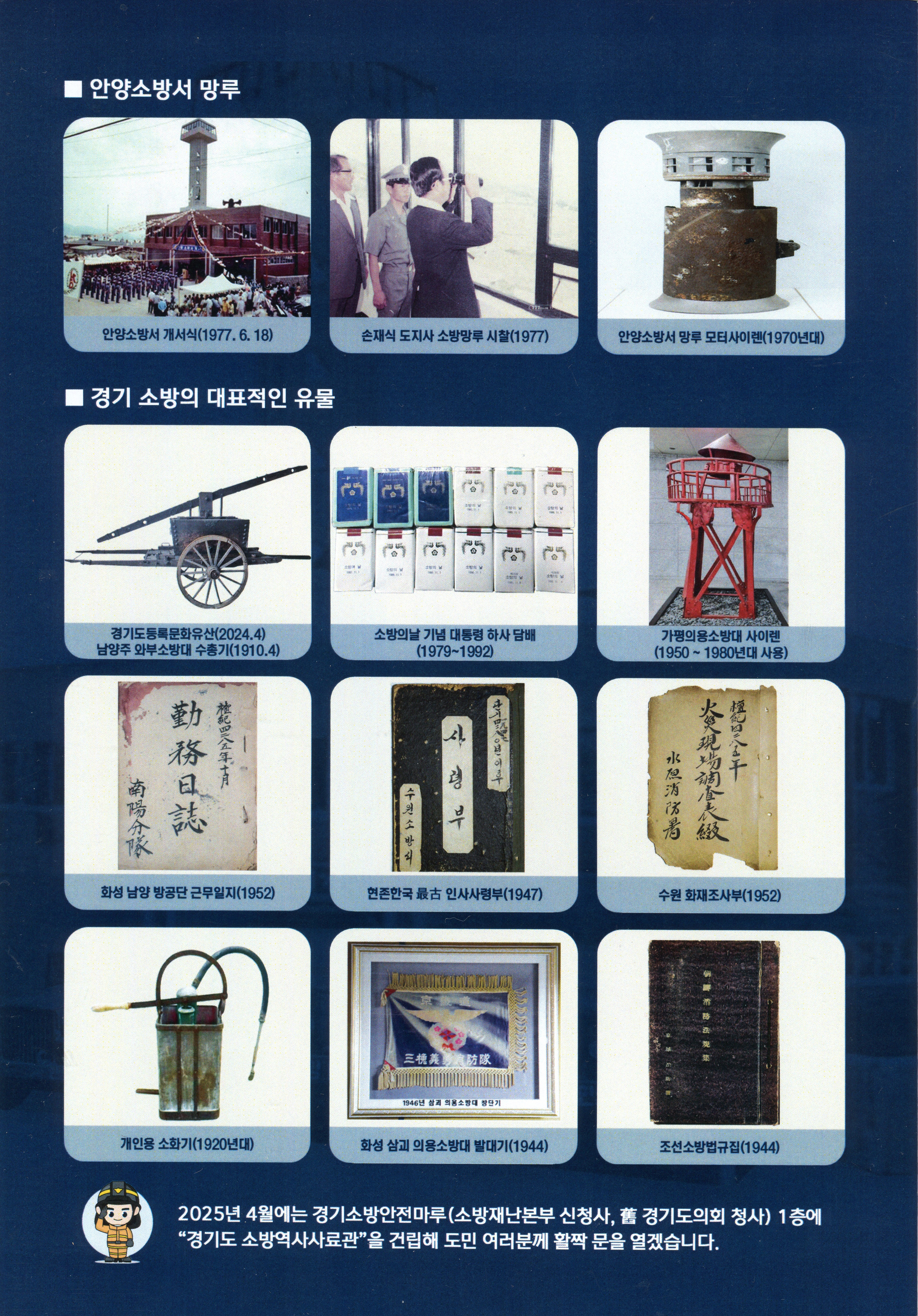 앞서 경기도소방재난본부는 지난 4월 5일 발표한 보도자료를 통해 전국 소방청사 중 유일하게 남아 있는 ‘안양소방서 망루’를 경기소방의 두 번째 문화재로 추진하겠다고 발표한바 있다.