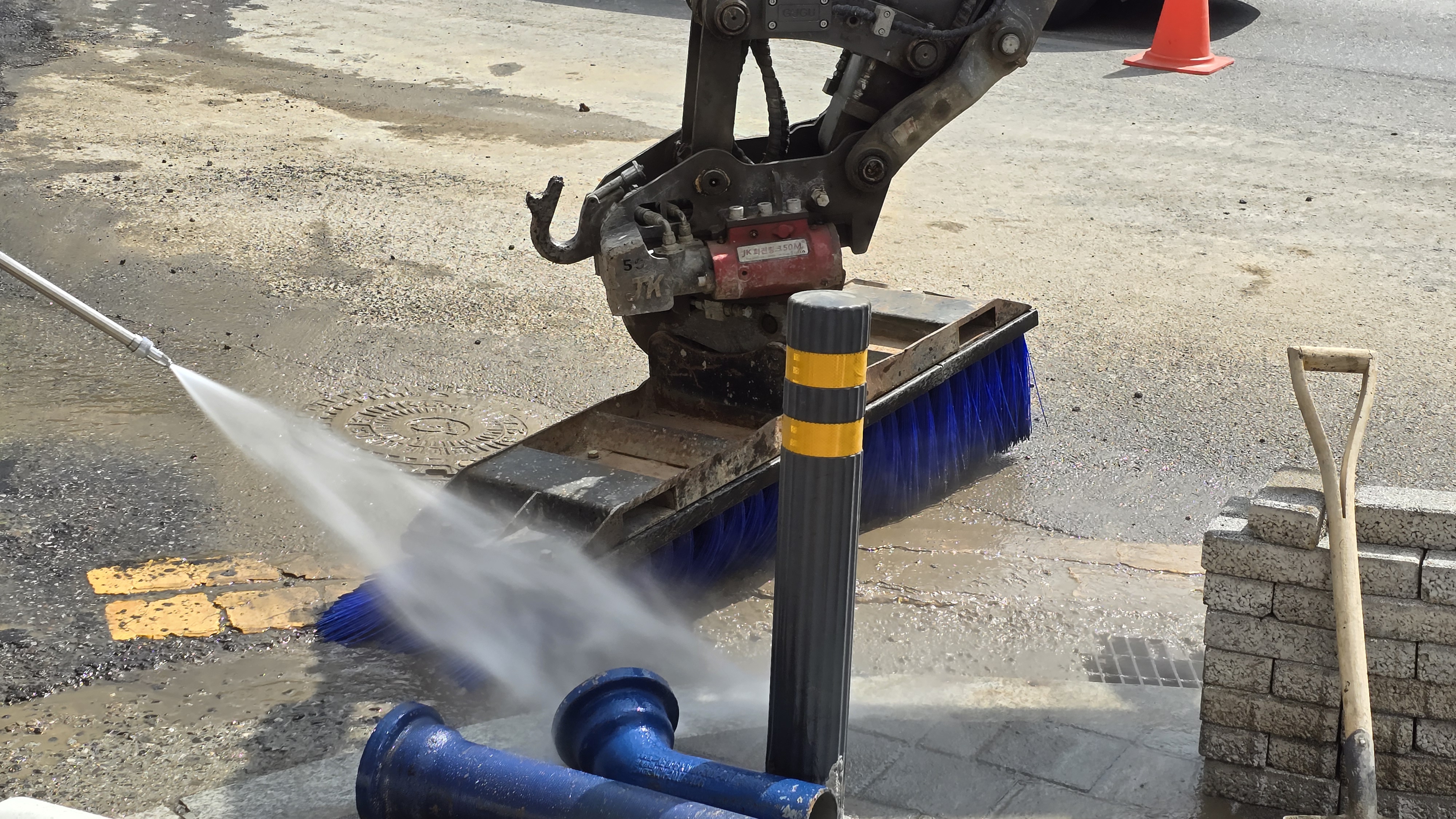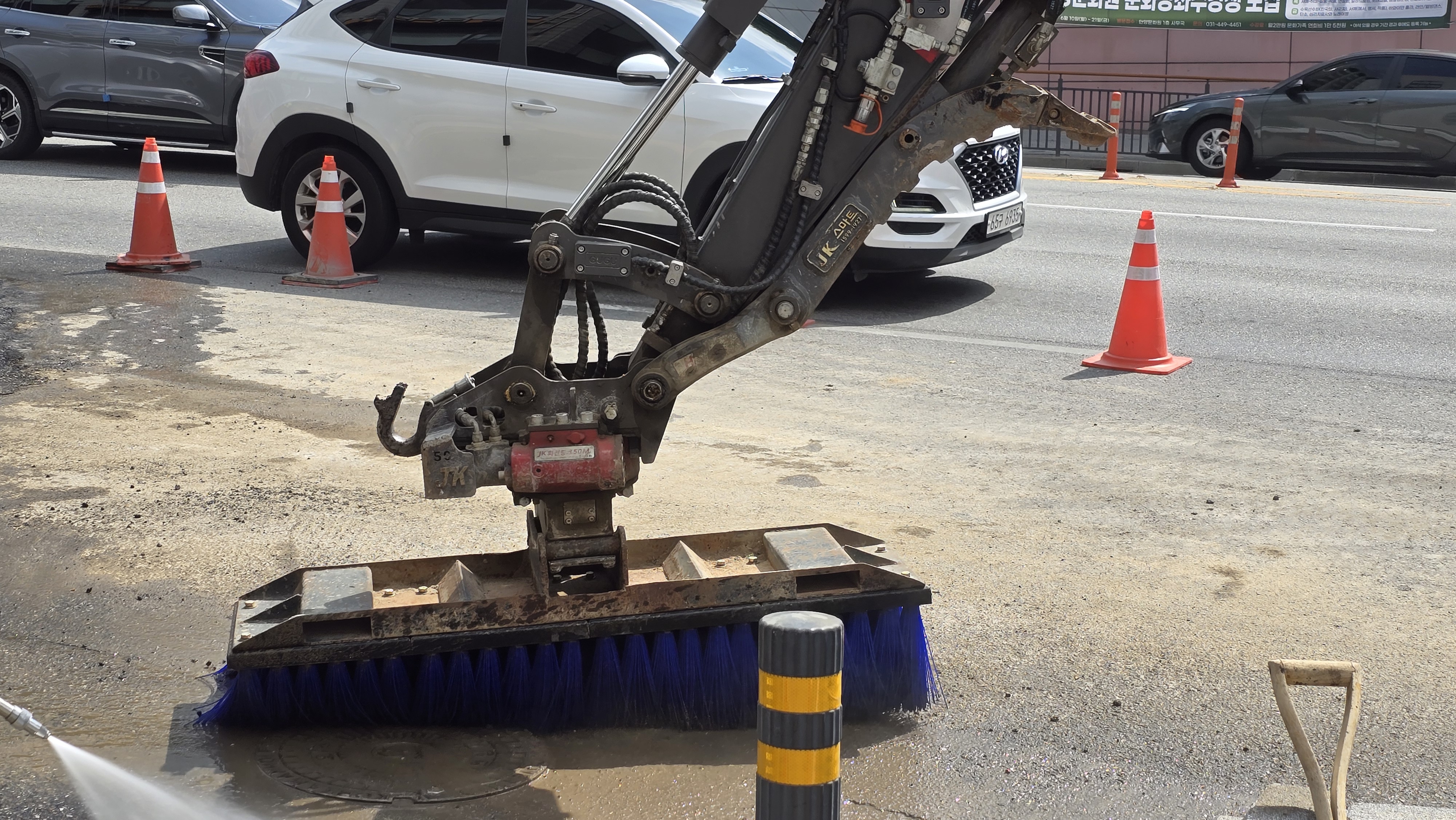 2024.06.23/ #도시풍경 #바닥청소 #초대형바닥솔 #포클레인/ 안양초교 골목 입구 상수도관 교체공사후 도로 바닥의 흙과 먼지를 포클레인에 초대형바닥솔을 부착해 청소를 한다. 와우 이런것도 있네 진짜 크다 초대형 바닥솔.