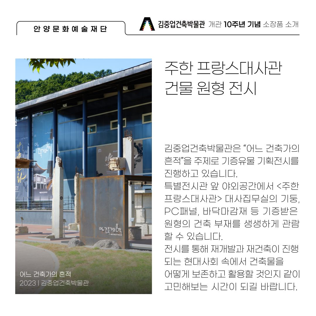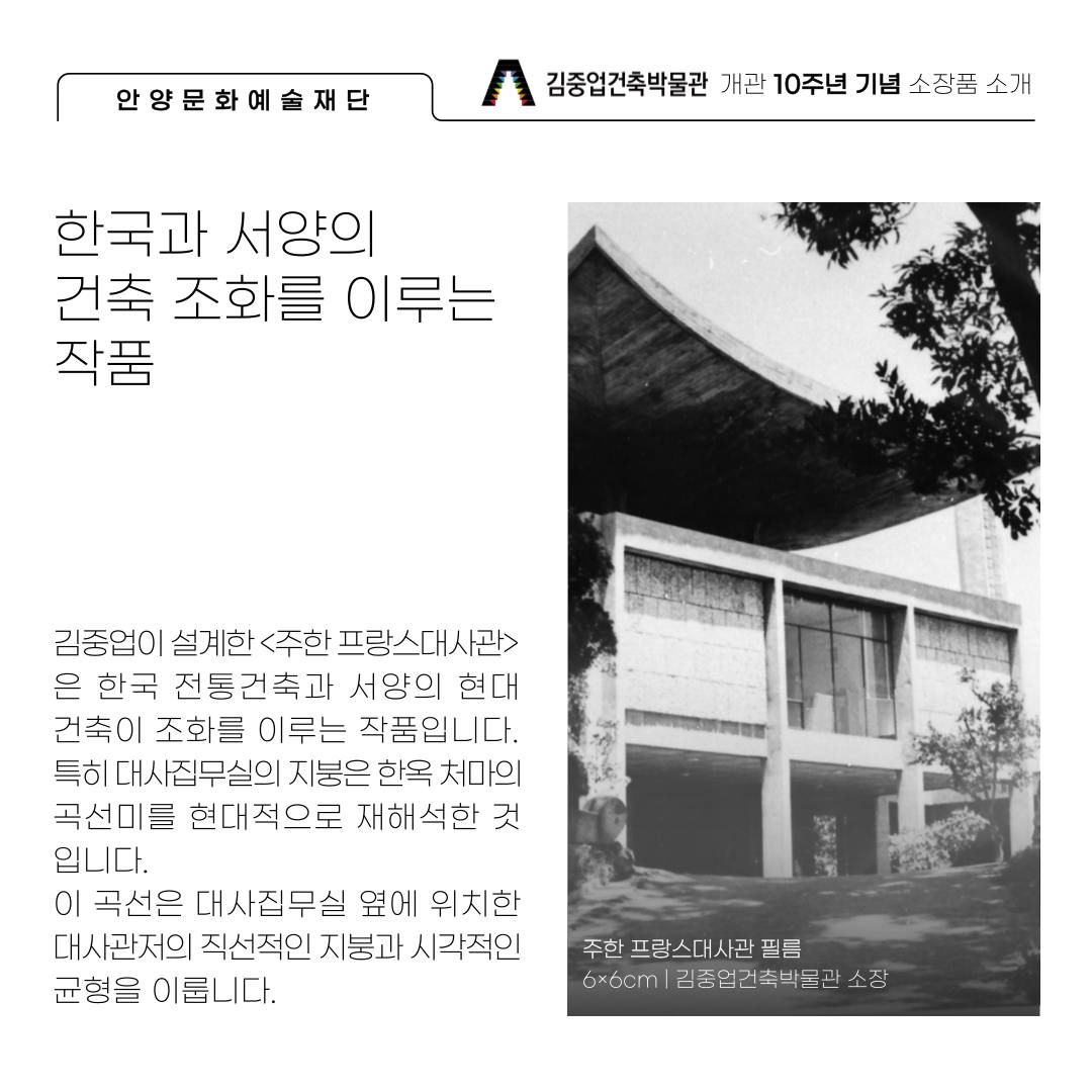 개관 10주년을 맞이해 건축가 김중업의 작품을 비롯해 박물관에서 소장하고 있는 작품을 소개한다. 작품은 김중업의 초기 건축적 특징이 잘 보여지는 ‘주한 프랑스대사관’이다. 카드뉴스를 통해 주한 프랑스대사관에 관해 알아보고, 김중업건축박물관에 방문하여 ‘김중업의 생각’과 ‘건축문화’ 를 살펴보기 바란다. 대사관 모형은 안양박물관 1층 로비에 전시돼있다.