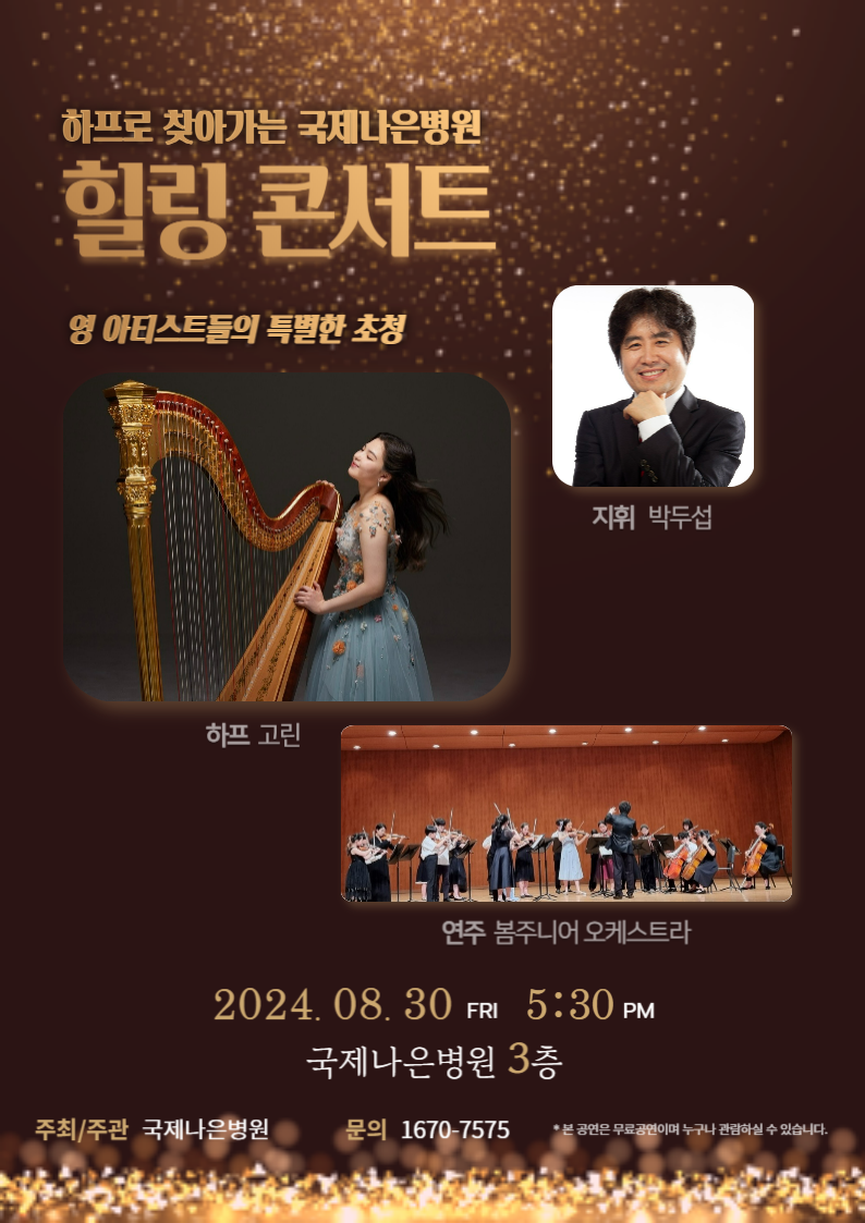 경기 안양시에 자리한 국제나은병원이 오는 8월 30일 오후 5시30분 국제나은병원 3층에서 하프로 찾아가는 힐링콘서트를 개최한다.