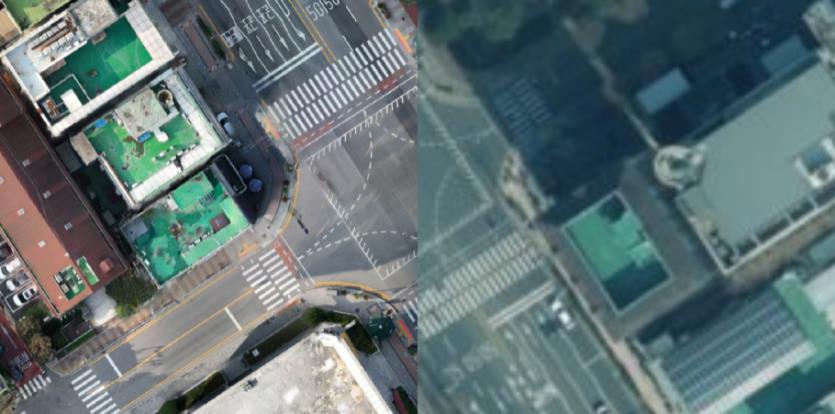 무인비행장치 지도(정사영상)는 높이차, 기울어짐 등 지형 기복에 의한 기하학적 왜곡을 보정해 물체를 수직으로 내려다보았을 때의 모습으로 변환한 영상 정보를 담고 있는 자료로, 위성지도 대비 해상도가 5배 이상 높다.