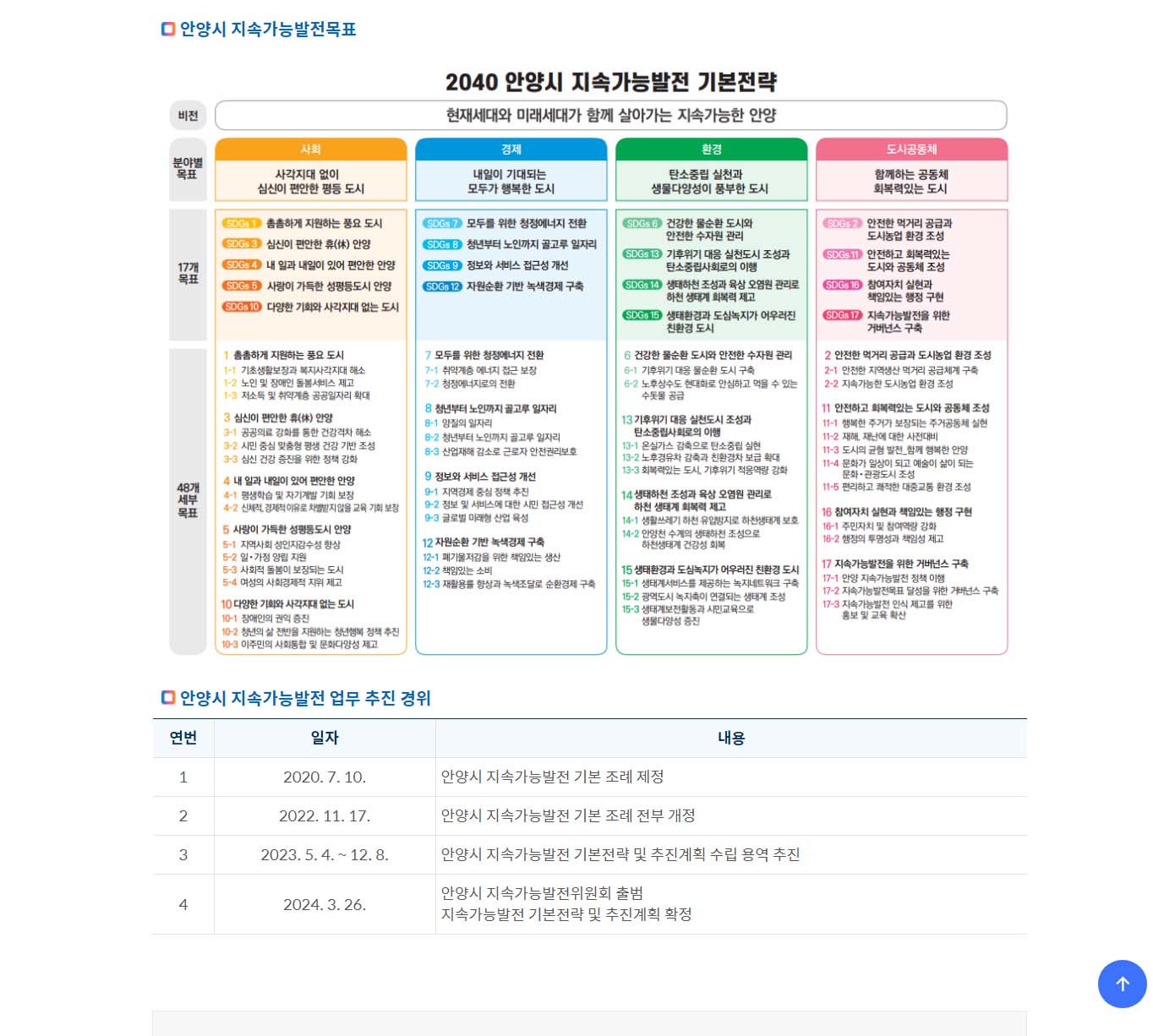 <지속가능발전> 게시판에는 "지속가능발전 개요"와 "지속가능발전 업무추진"을 통해 UN지속가능발전목표, 안양시지속가능발전목표, 안양시 업무추진 경위, 안양시의 기본전략및 추진계획 등을 소개하고 있다.