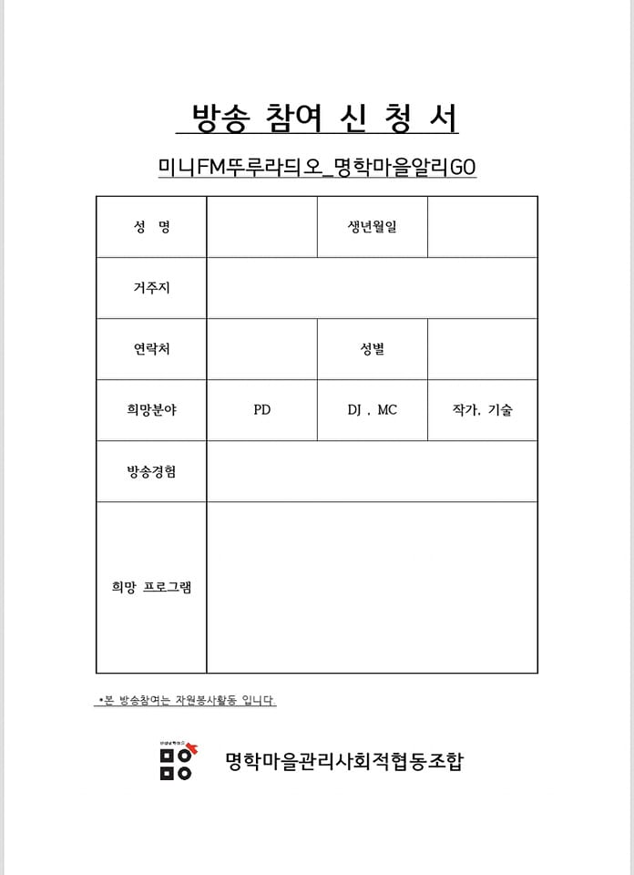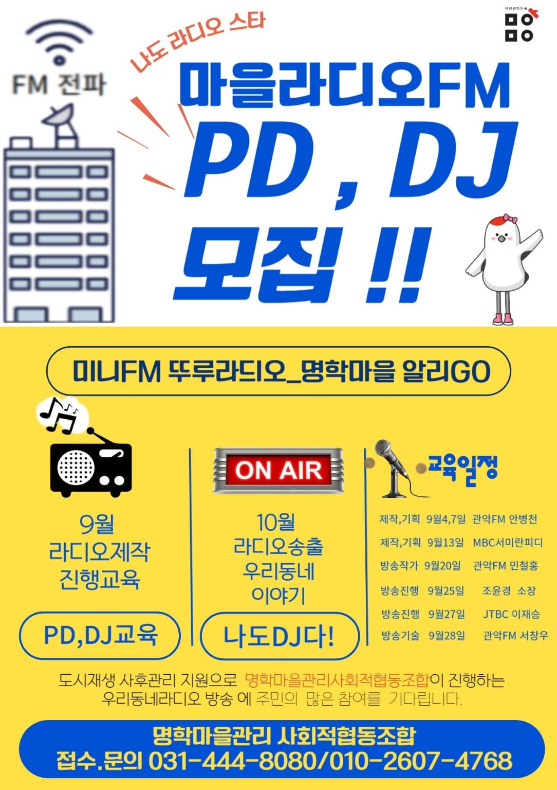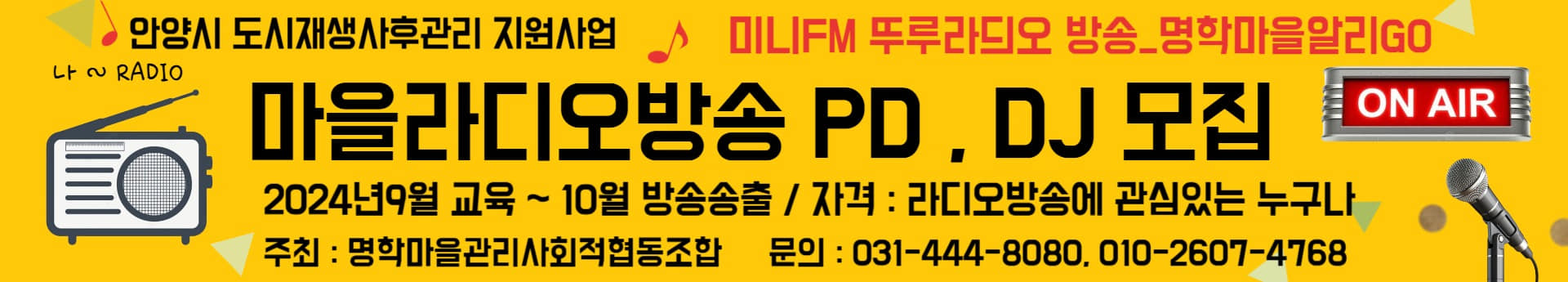 명학마을관리사회적협동조합은 라디오 프로그램 진행할 PD,DJ를 모집중이다. 지원자격은 라디오에 관심있는분이면 누구나 가능하다. 이를위해 9월에 라디오 기획.제작.작가.아나운싱.기술 교육을 진행한다는 계획이다.